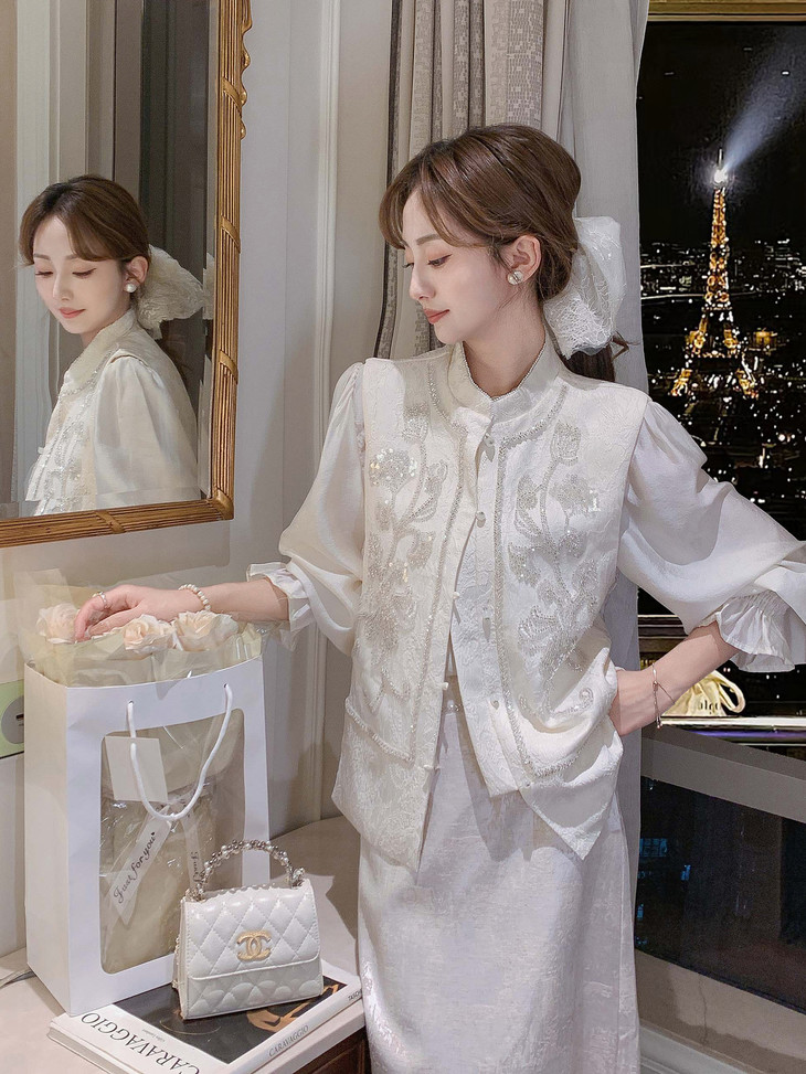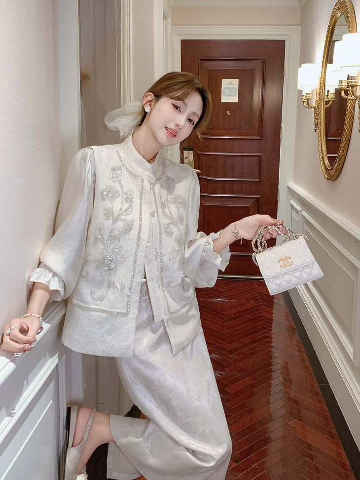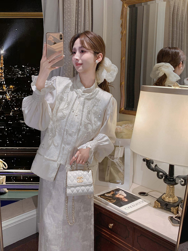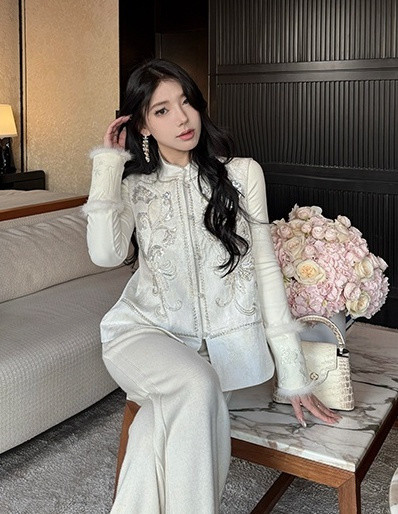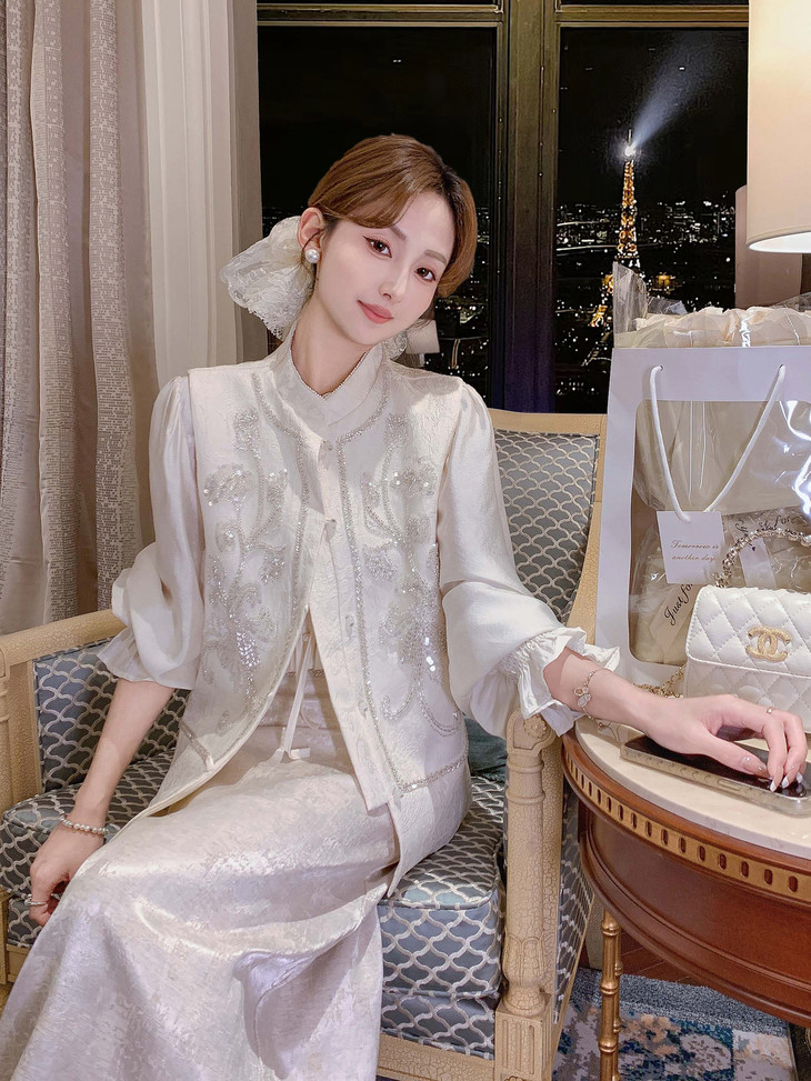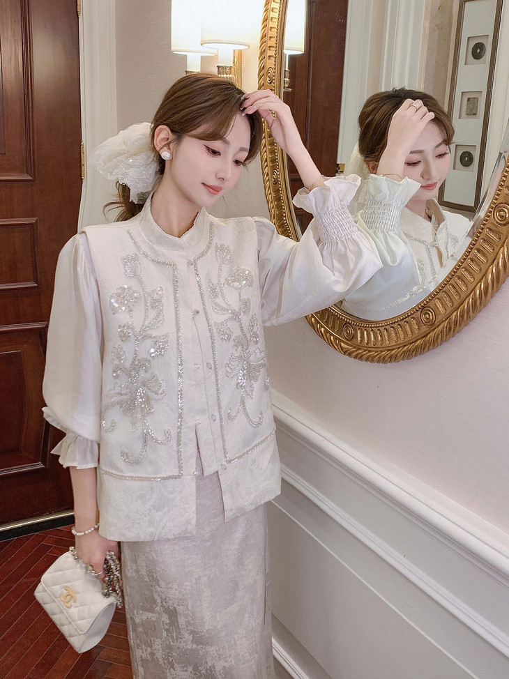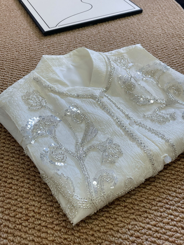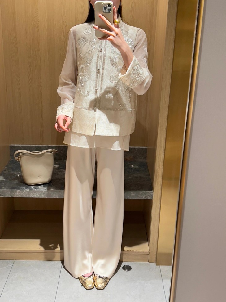 别致的立领设计时髦有型 修饰脸型显脸小 相比常见的领型更温暖脖颈 同时给人端庄秀丽 古风韵味自然流露 前面整片都是刺绣的珠片和小米珠 华丽又精致 搭配门襟单排米色系的玉石扣子复古细腻 兼顾了方便与细节美感 细节满满 为单调平添古韵 敞开或是单穿都很洋气~