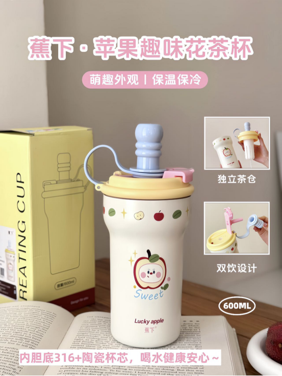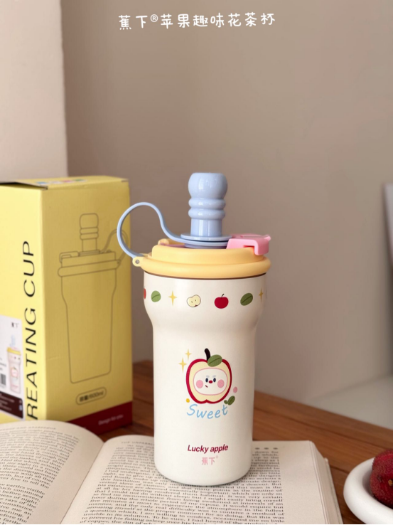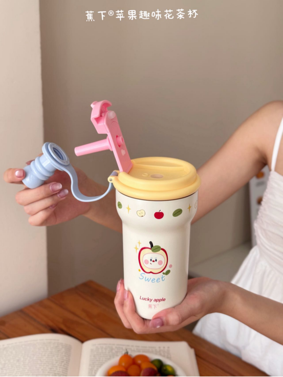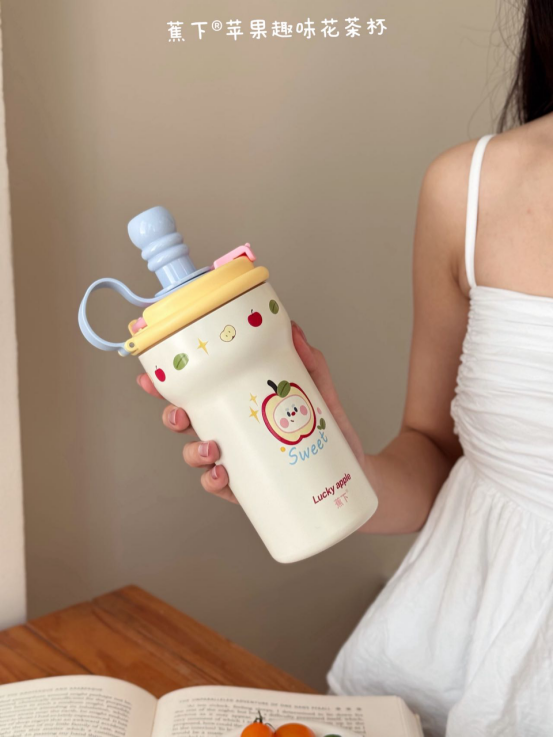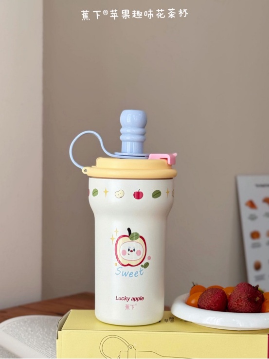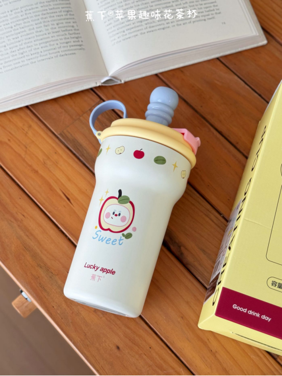 蕉下苹果趣味花茶杯 | 喝水界全能ACE来咯💫 ✨ 核心亮点 ✔ 花式双饮👉 吸管/直饮自由切换,喝水姿势不设限 ✔ 保温保冷👉 热饮锁温6h🔥 冷饮冻感8h❄ ✔ 万物可泡👉 咖啡/果茶/花茶…各种饮品轻松拿捏 ✔ 倒置不漏👉 密封性拉满,丢包里晃荡也不怕洒