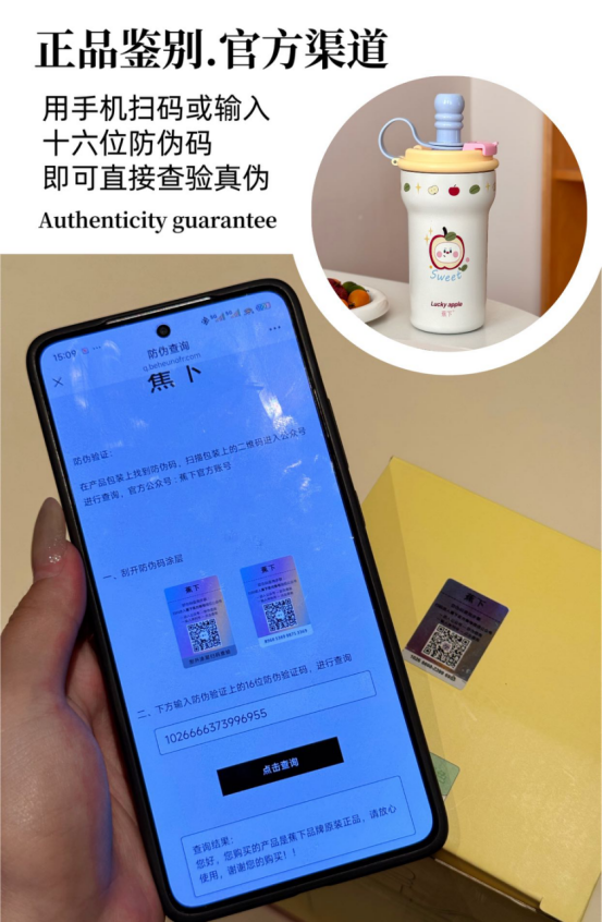 正品保障✨ 蕉下苹果杯防伪攻略 担心买到假货?别慌‼ 教你一招识别正品👇 ✔ 认准官方防伪通道 包装上找防伪码👉 手机扫码/输入16位码,秒查真伪 ✔ 操作超简单 刮开涂层→输码查询→一秒验真✅ 正品直接显示“蕉下原装”,安心值拉满💯 再也不怕踩坑啦!!! 认准官方防伪,放心入手可爱水杯🥰