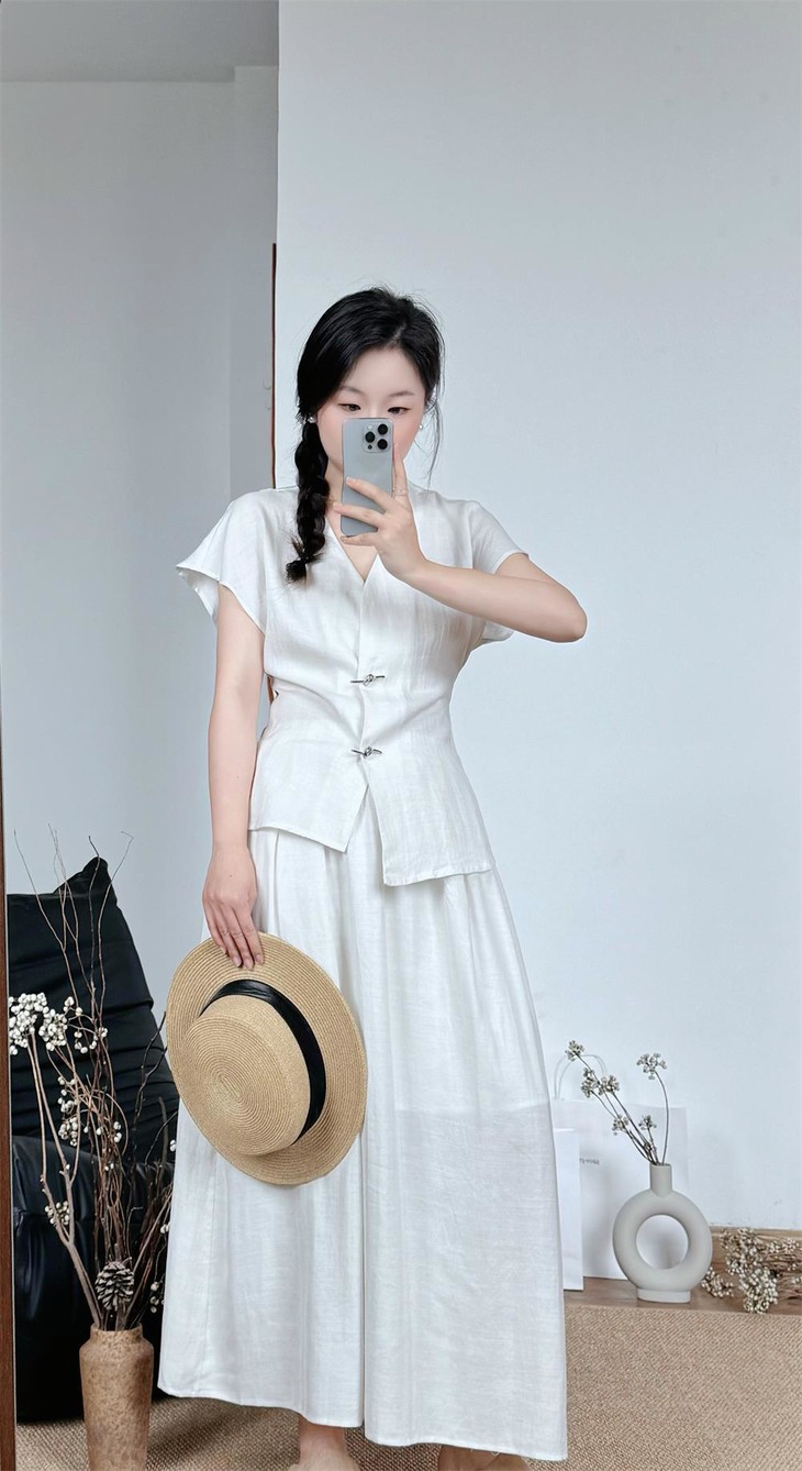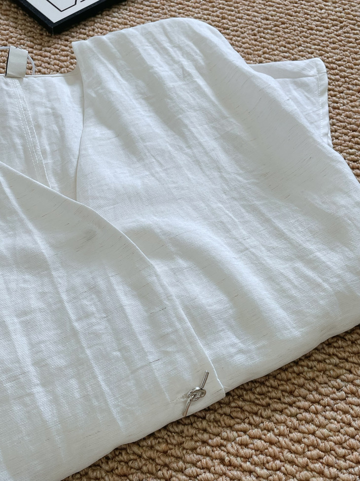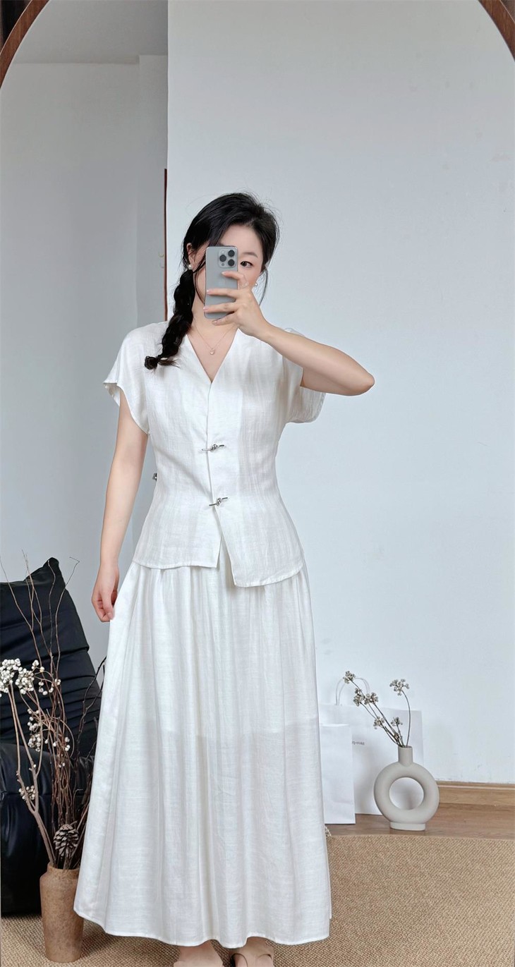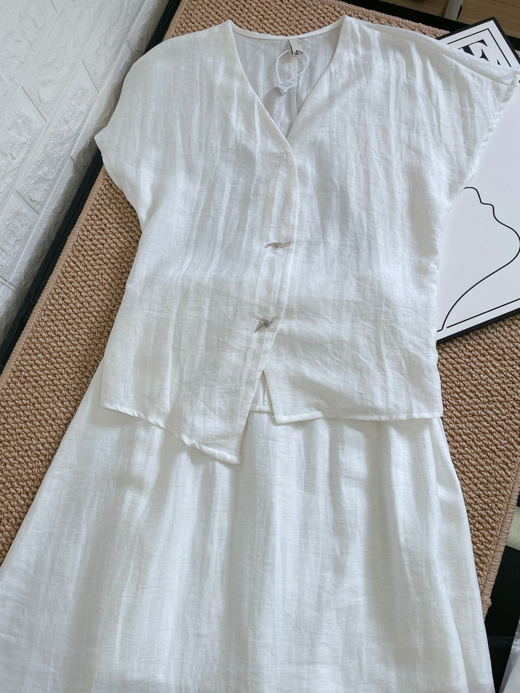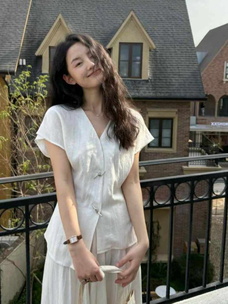 救命,谁发明的这套衣服啊‼️ 把「松弛感」和「高级感」焊在身上了!! 我愿称之为“误入人间的清冷白月光套装” 宝子们听我说,喜欢简约清冷风的‼️ 不冲真的会后悔!!! ✅面料是会呼吸的天丝 + 亚麻混纺 走路带风的清凉感谁懂啊!! 自带肌理感 上手一摸 柔顺得像被云朵轻轻蹭了一把 夏天穿完全不会闷汗 就像随身揣着个小空调🉑 ✅新中式金属盘扣绝绝子 把东方韵味和极简主义拧成一股绳 随便一穿就是「看似毫不费力,实则精心打扮」 的松弛感美人❗️