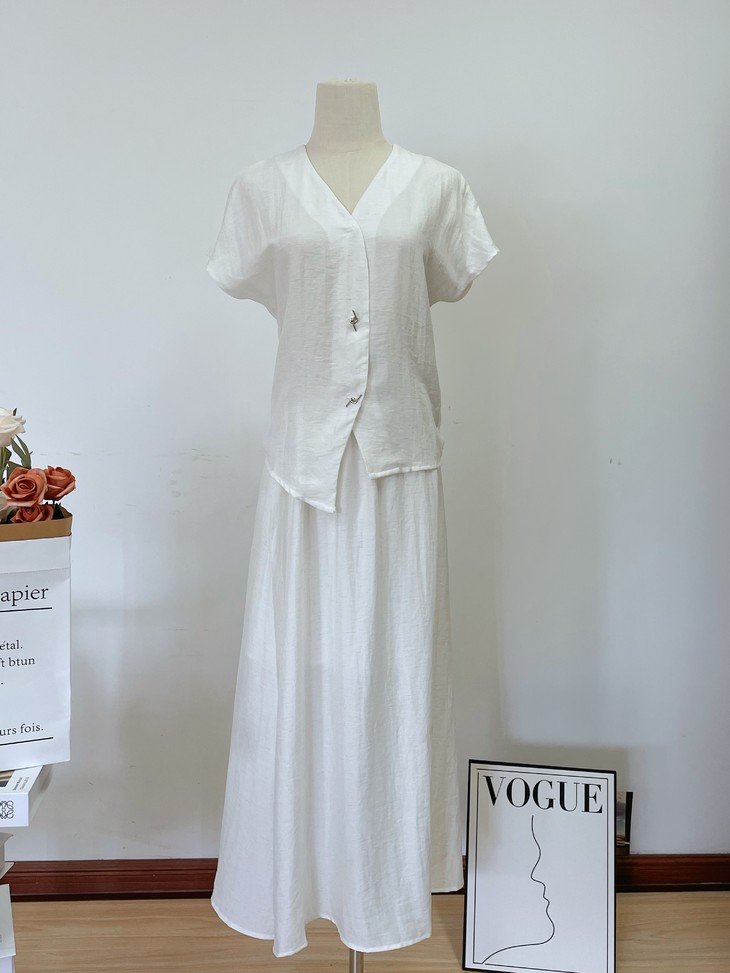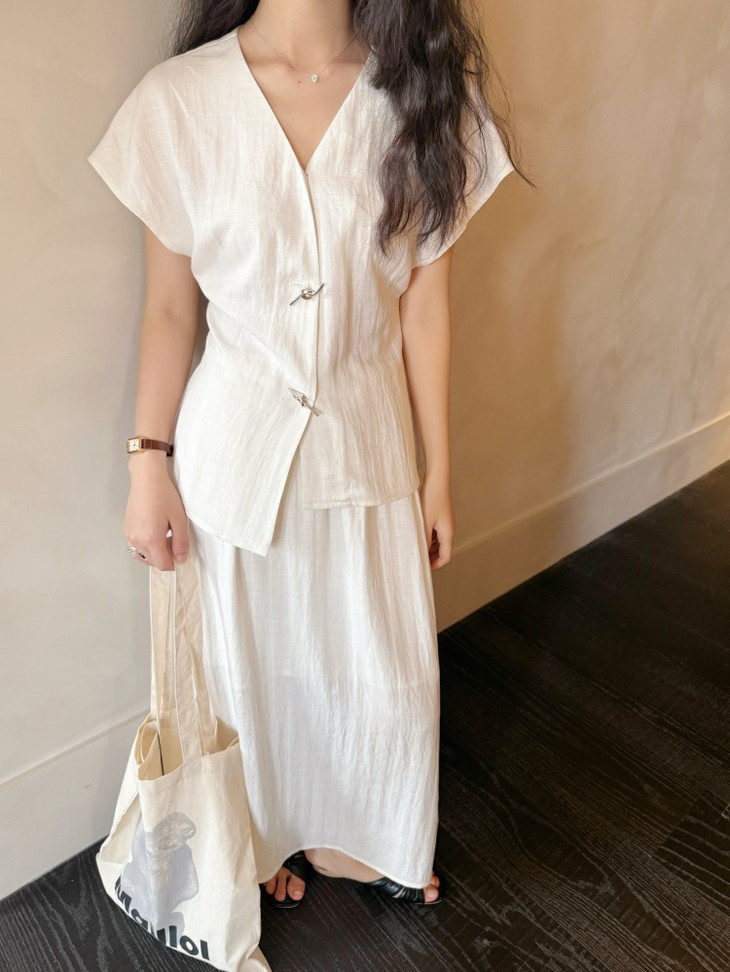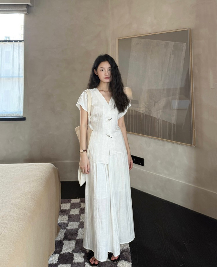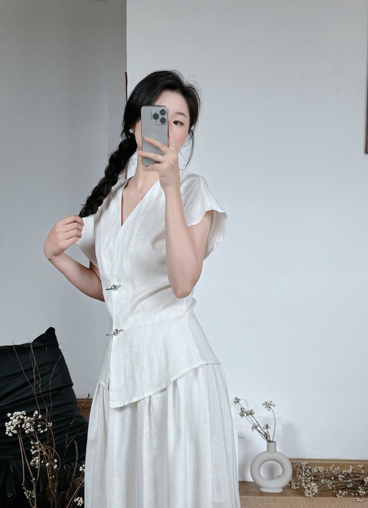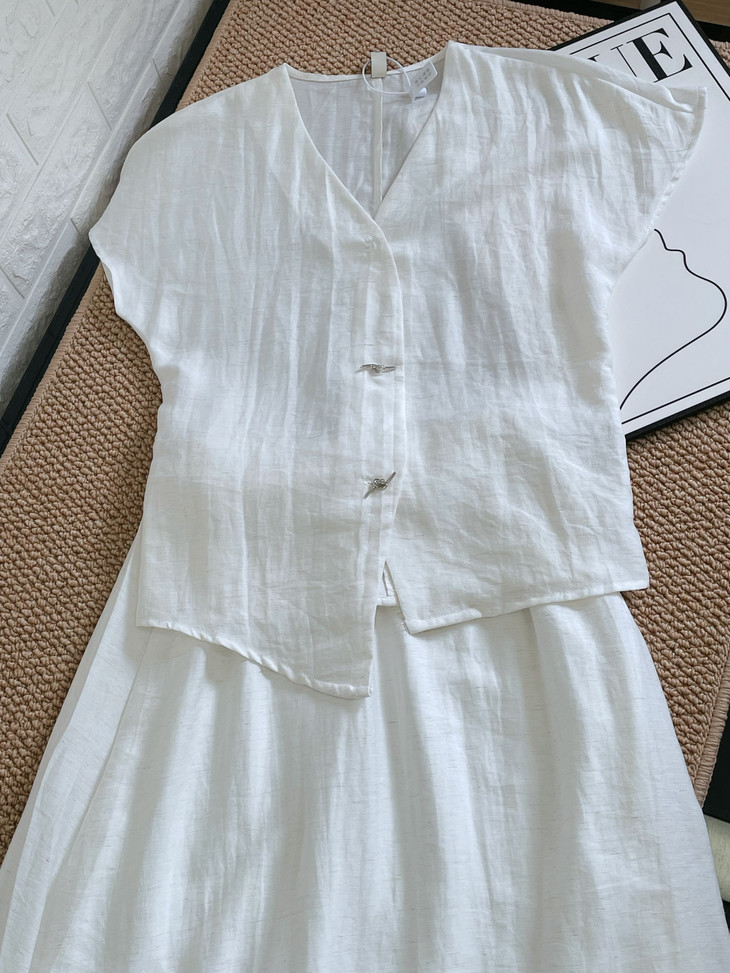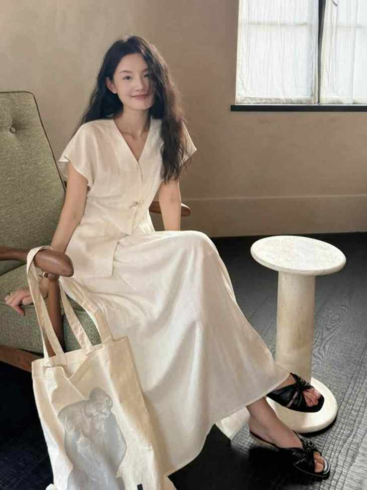 救命,谁发明的这套衣服啊‼️ 把「松弛感」和「高级感」焊在身上了!! 我愿称之为“误入人间的清冷白月光套装” 宝子们听我说,喜欢简约清冷风的‼️ 不冲真的会后悔!!! ✅面料是会呼吸的天丝 + 亚麻混纺 走路带风的清凉感谁懂啊!! 自带肌理感 上手一摸 柔顺得像被云朵轻轻蹭了一把 夏天穿完全不会闷汗 就像随身揣着个小空调🉑 ✅新中式金属盘扣绝绝子 把东方韵味和极简主义拧成一股绳 随便一穿就是「看似毫不费力,实则精心打扮」 的松弛感美人❗️