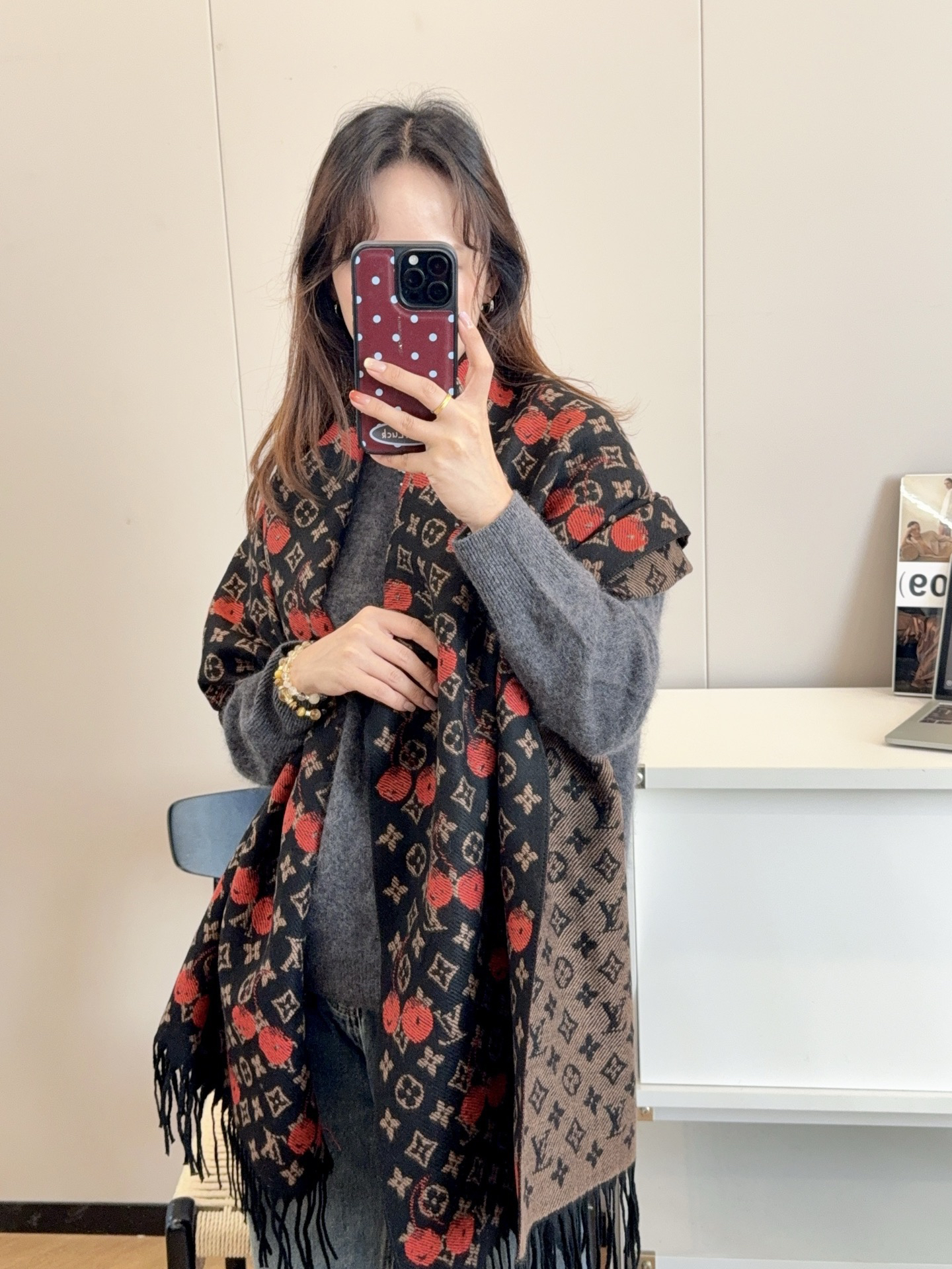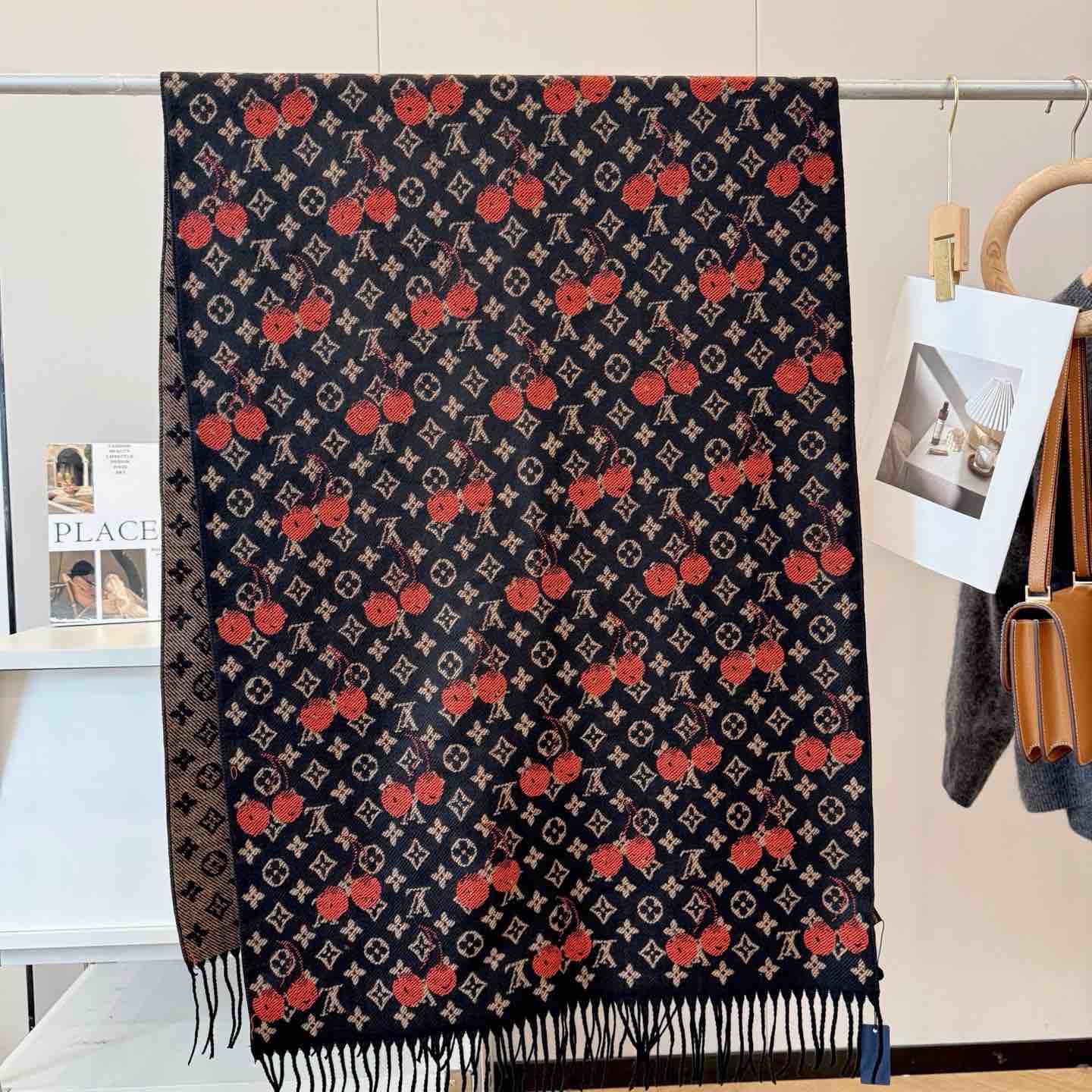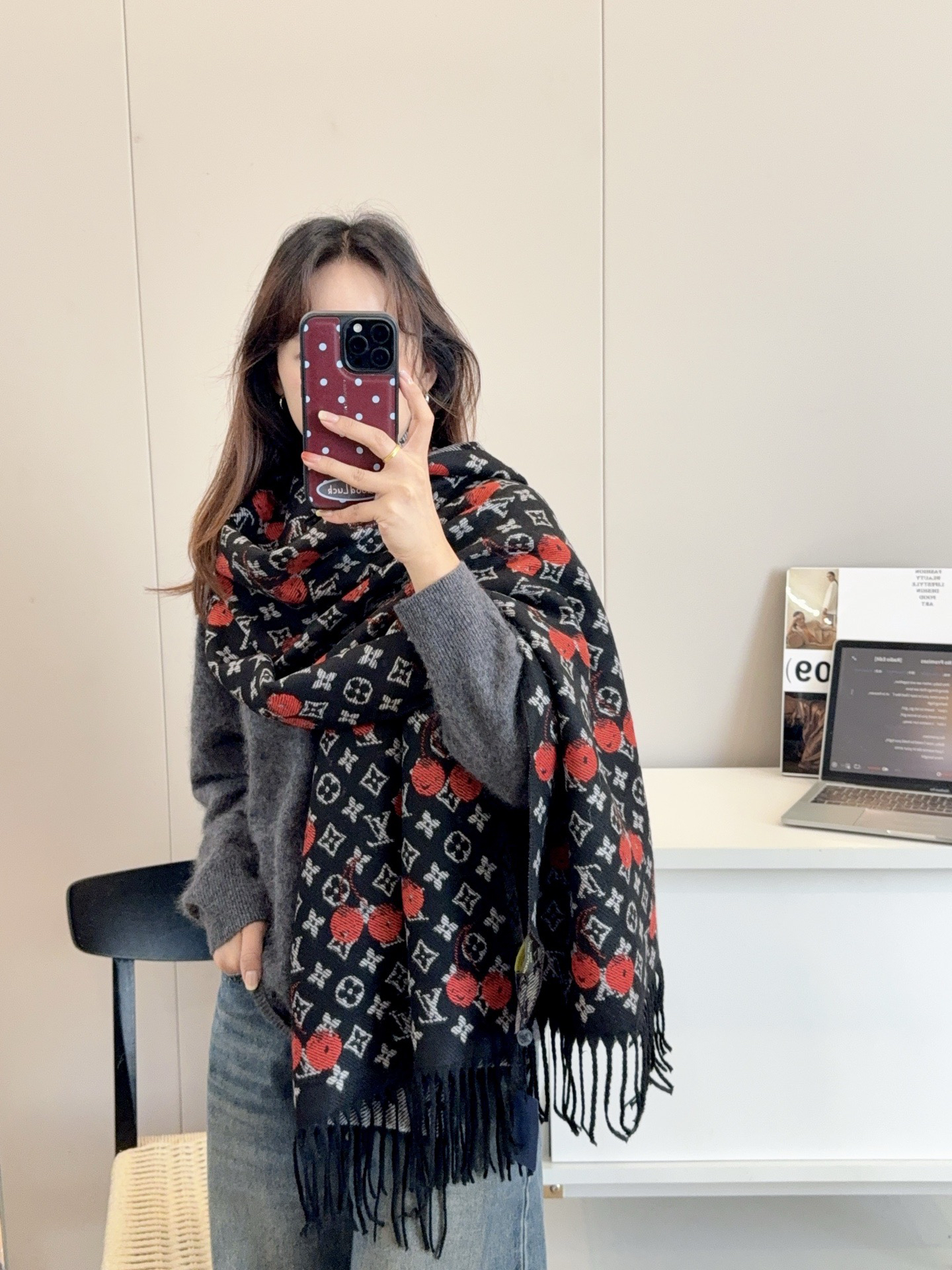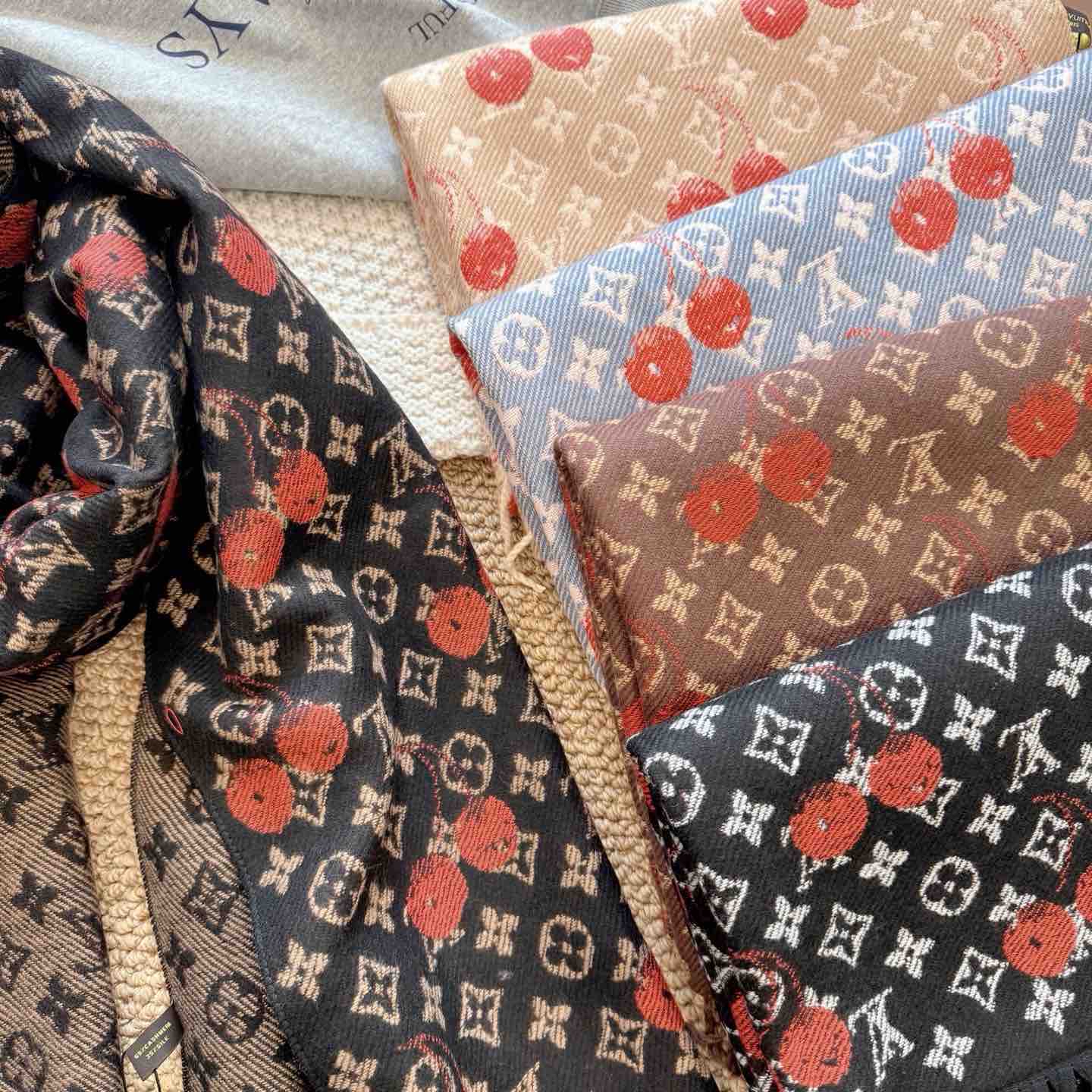 秋冬特惠💰160 LV围巾 LV × TM Monogram Cerise 出自村上隆系列,为华美丝毛点缀Monogram 图案,再以日本艺术家笔下的灵动樱桃元素注入清新活力。无论单独佩戴或搭配同系列其他单品,均可展露瞩目风采。