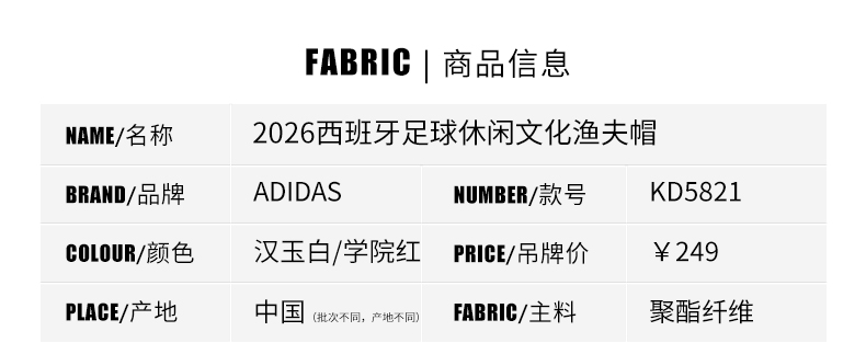 SFS正品 Adidas阿迪达斯2026世界杯西班牙队足球休闲文化渔夫帽KD5821