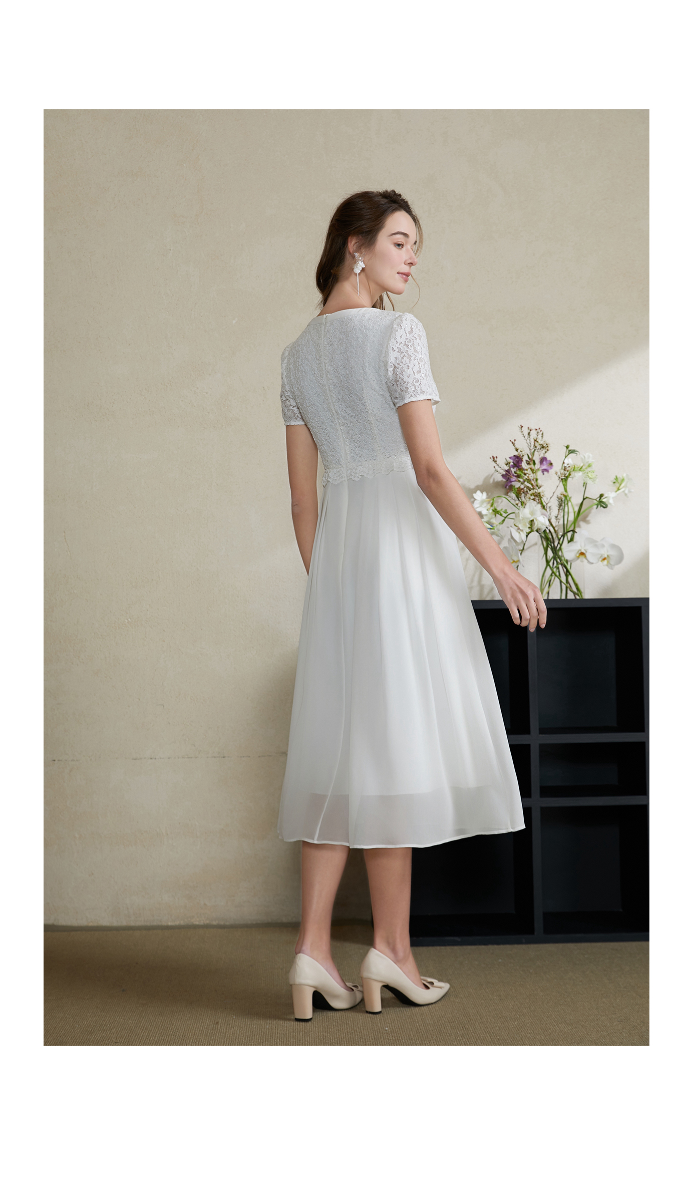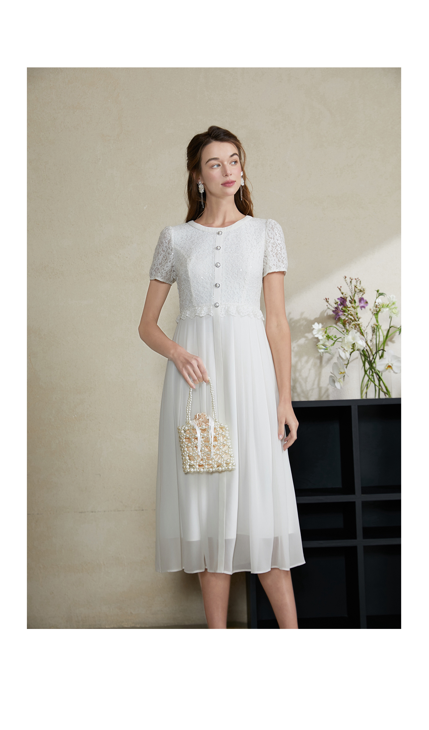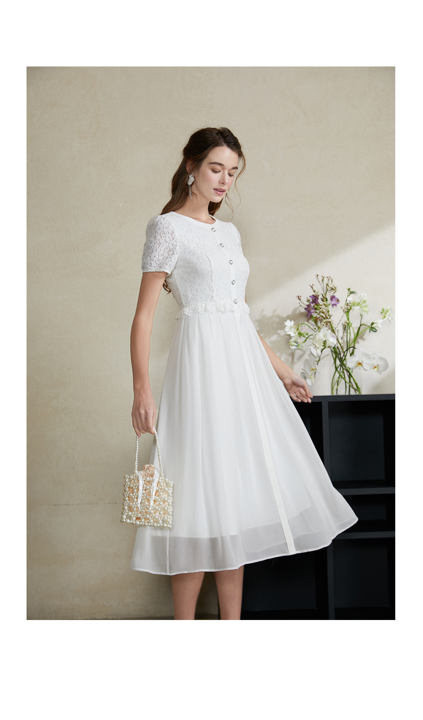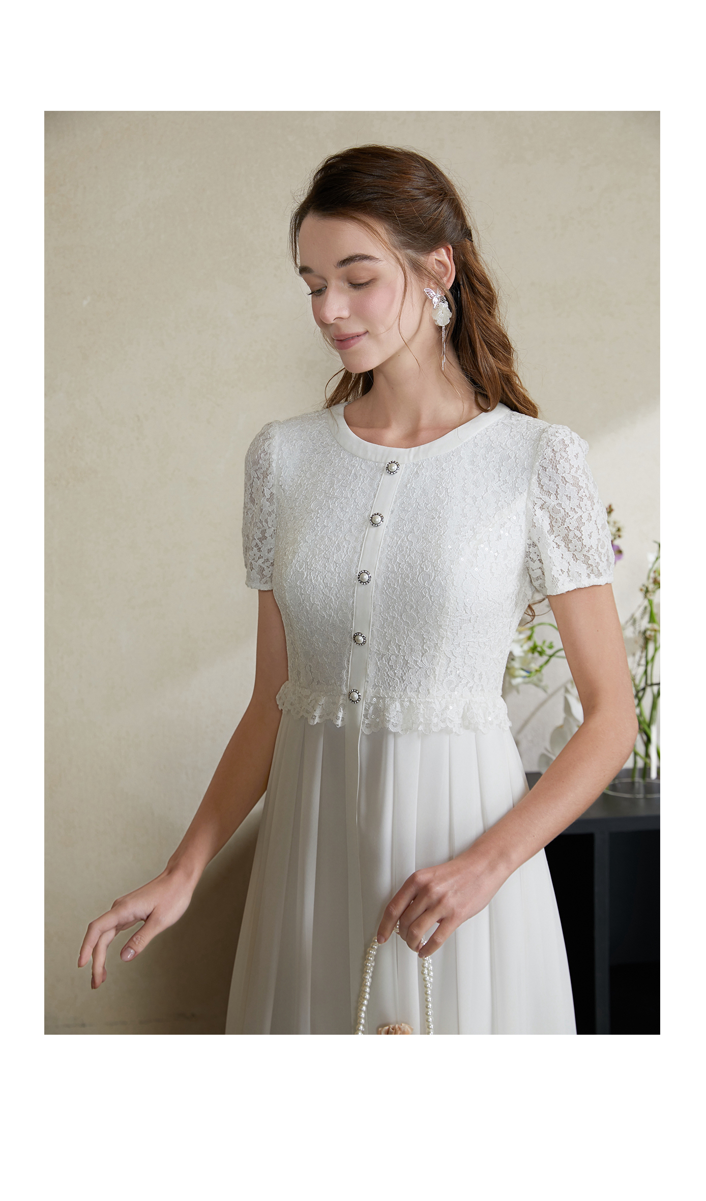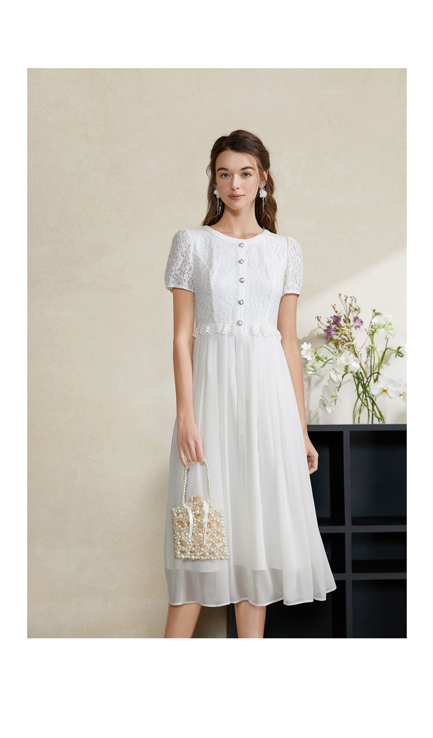 司歌蕾丝连衣裙白裙仙气收腰短袖夏A911261X