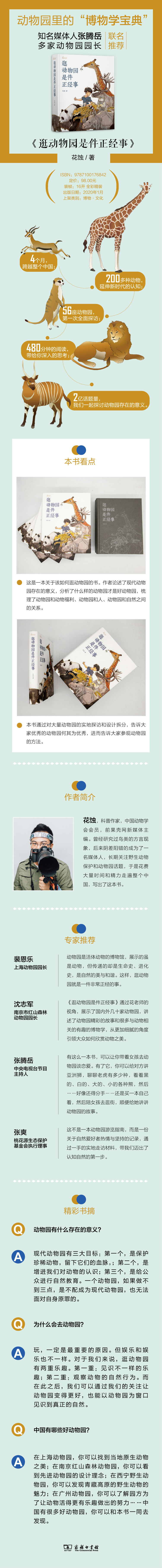 作者带着对动物园的热爱与使命感,通过欢乐、有趣的文笔和生动、直观的照片向读者展示了动物园存在的意义。动物园收集、展示野生动物,通过行为管理保障动物福利,使游客感受到野生动物是神奇、可爱的;通过保护教育,使游客感受到这些可爱的动物与其野外生活环境的关联,并意识到人类的决策会间接地影响到这些可爱的动物。好的动物园不仅会让游客获得愉悦和知识,并终将所有的收获和感悟体现于日常行为的改善;这种行为的改变会减小对环境的压力,从而让人类和这些可爱的野生动物能更长久地存活在地球上。所以,每个人有责任把动物园变得更好,逛动物园是件正经事!