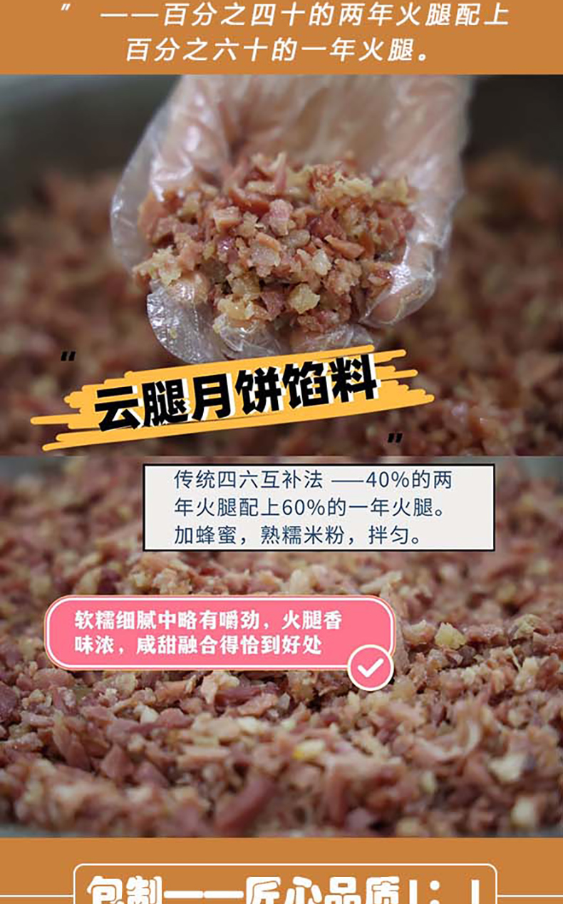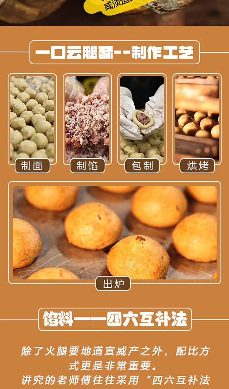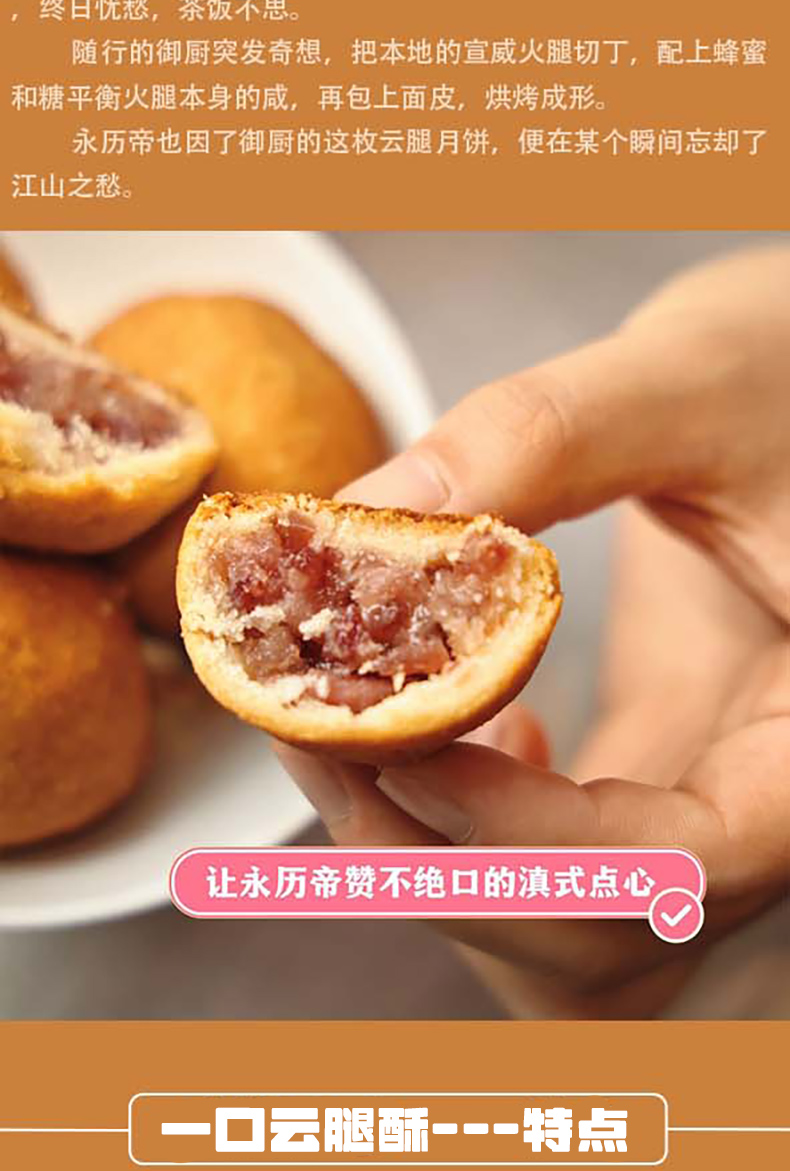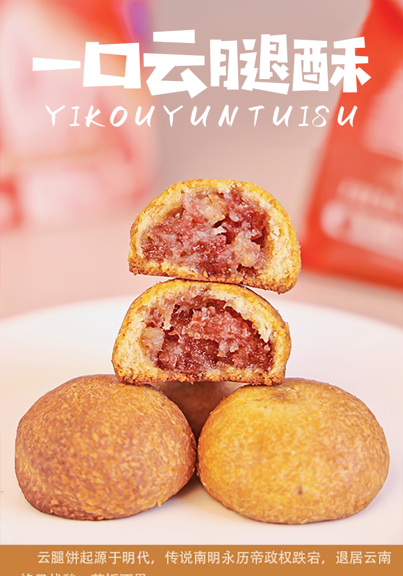【产品口味】:饼皮外脆内软,入口酥而不散,层次分明!馅料鲜甜带咸,油而不腻,火腿肉香浓郁,又粒粒分明。云南经典小食!