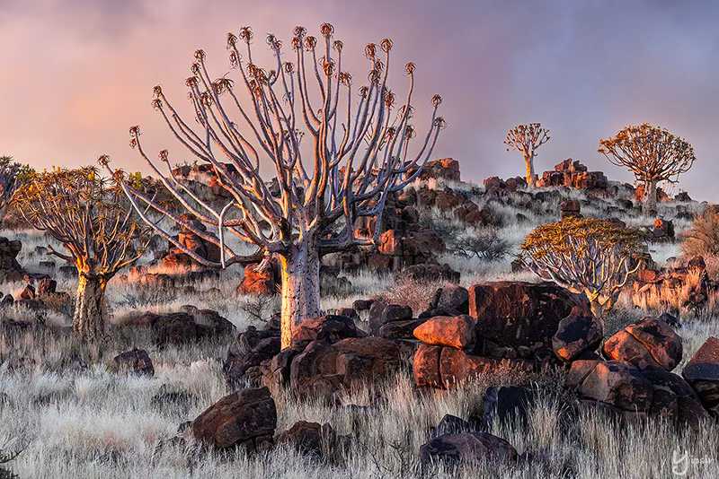 【箭袋树庄园】在这里生长着一种高大挺拔,长得很“外星球”的植物“箭袋树”,它以违反自然的姿态傲然挺立。事实上,貌似大树的箭袋树并不是“树”,它是一种特殊的树芦荟。最高能够长到20米以上,是最大的芦荟之一。本地的土著人常常砍下这些树枝,挖空其海绵组织,用它们来当作箭筒,所以称为箭袋树。箭袋树造型独特,在日出日落和星空下形成震撼人心的画面。