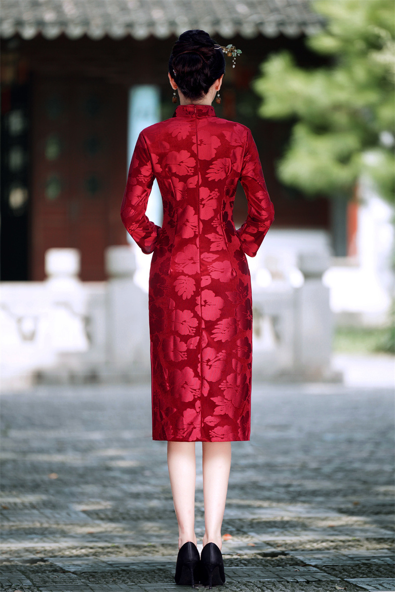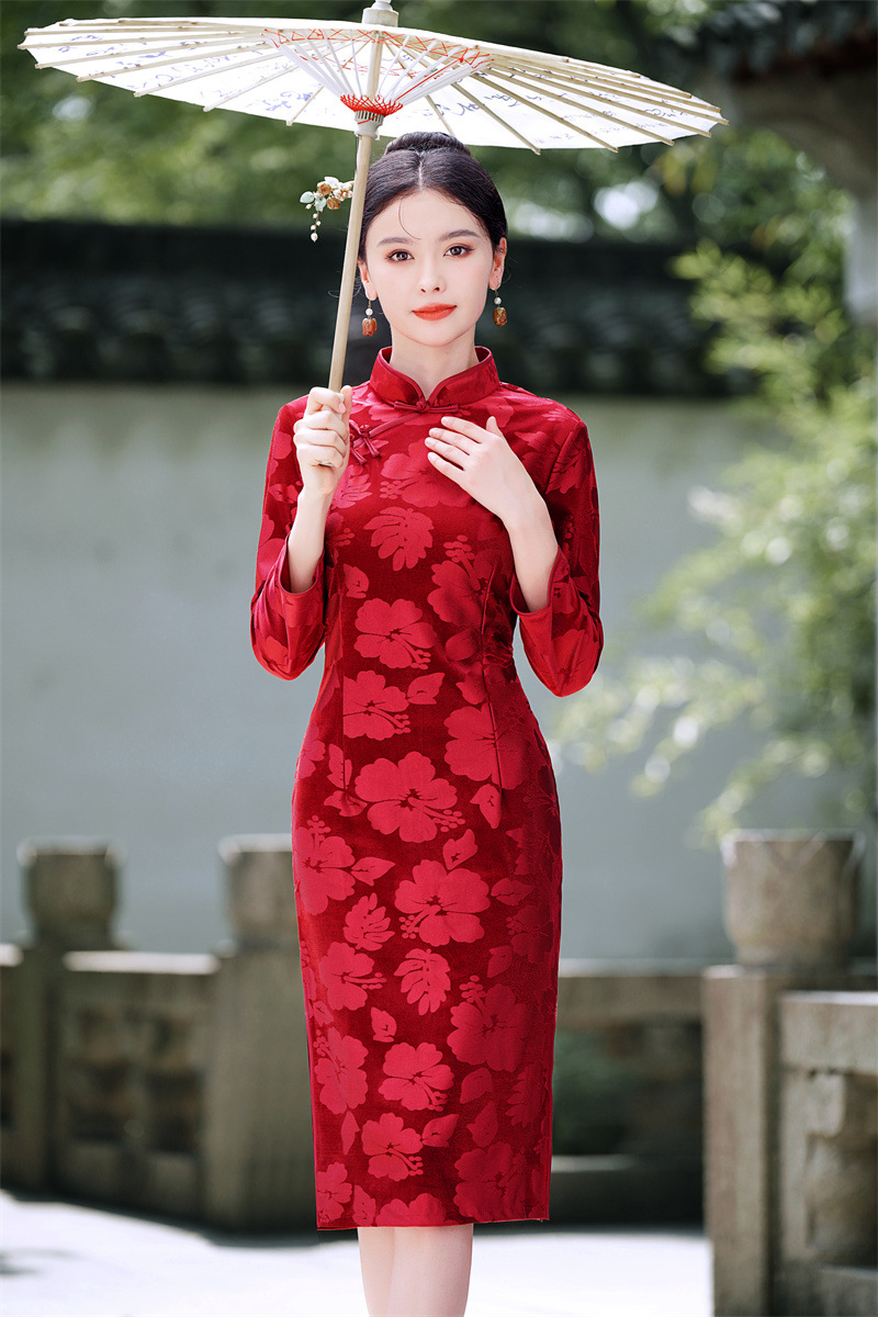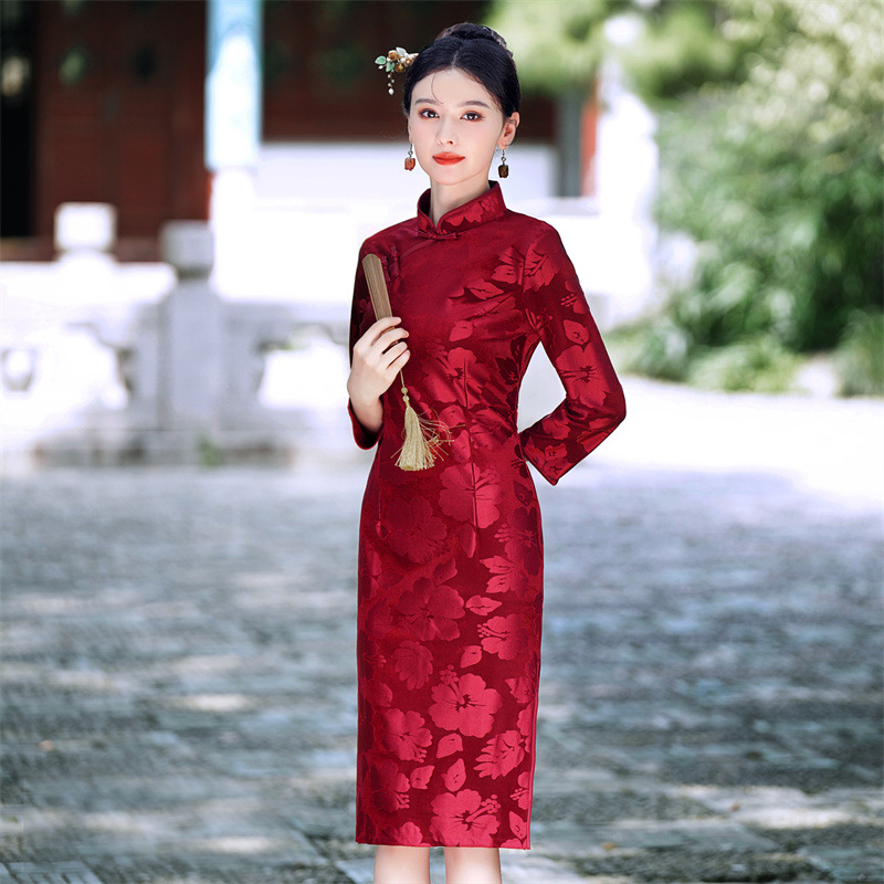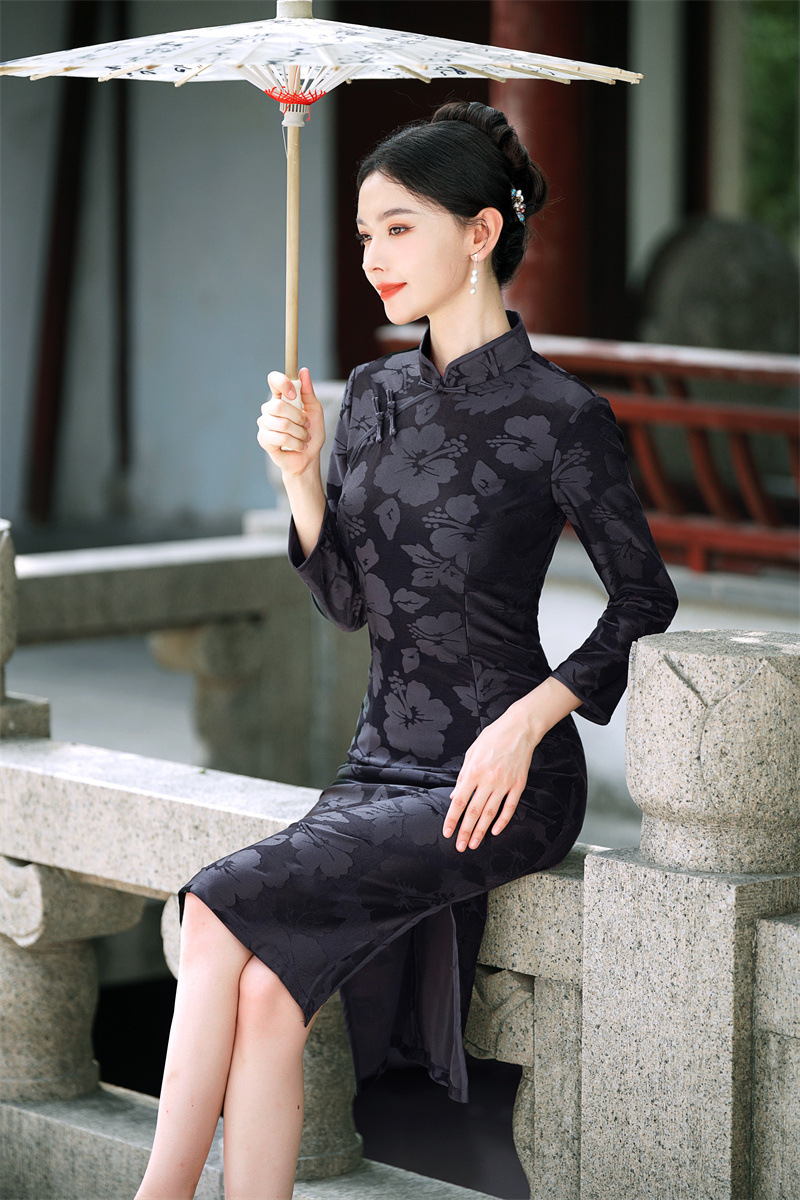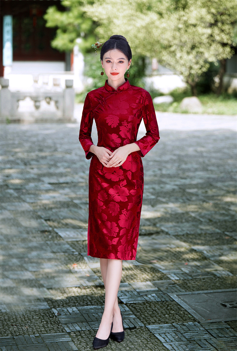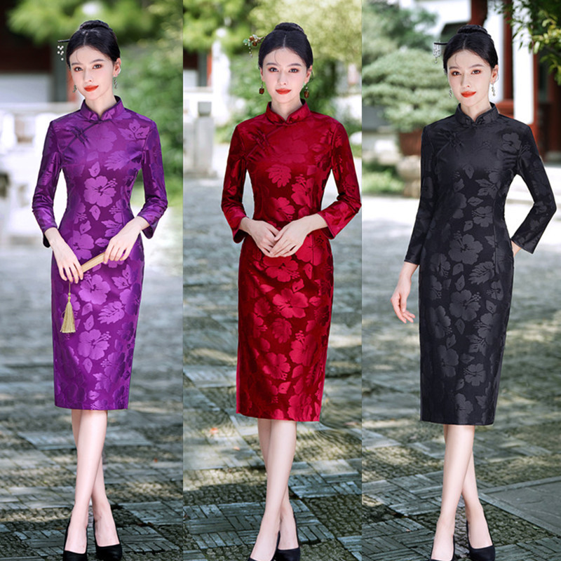 丝绒提花中长七分袖旗袍2023秋新款复古国风喜妈妈旗袍GX