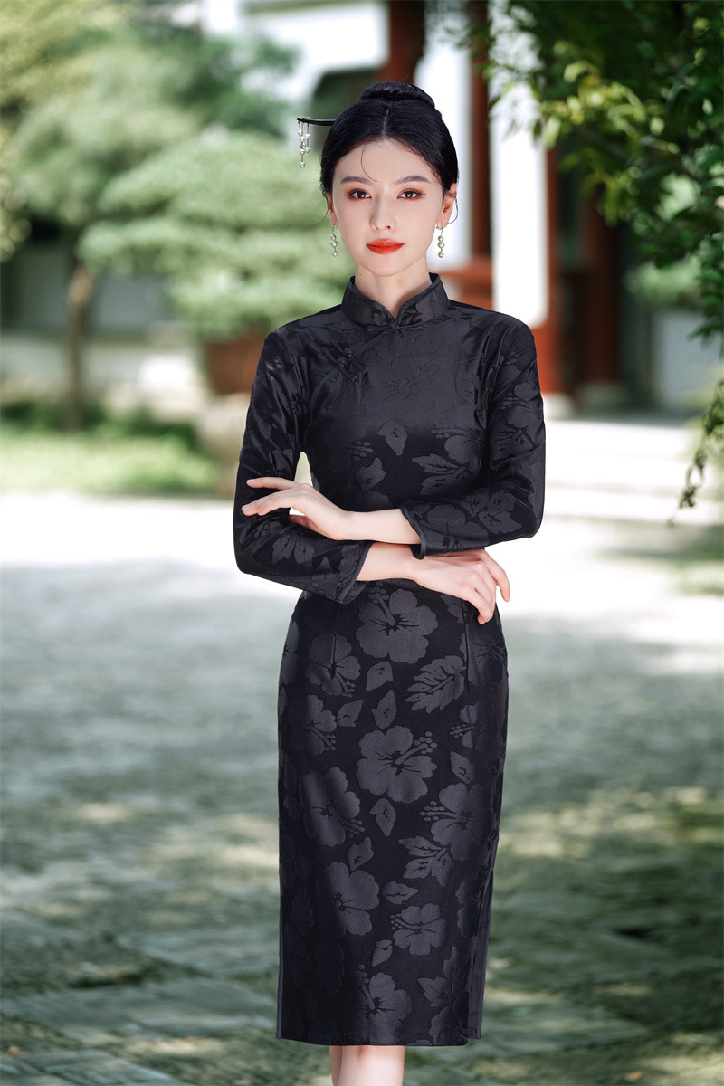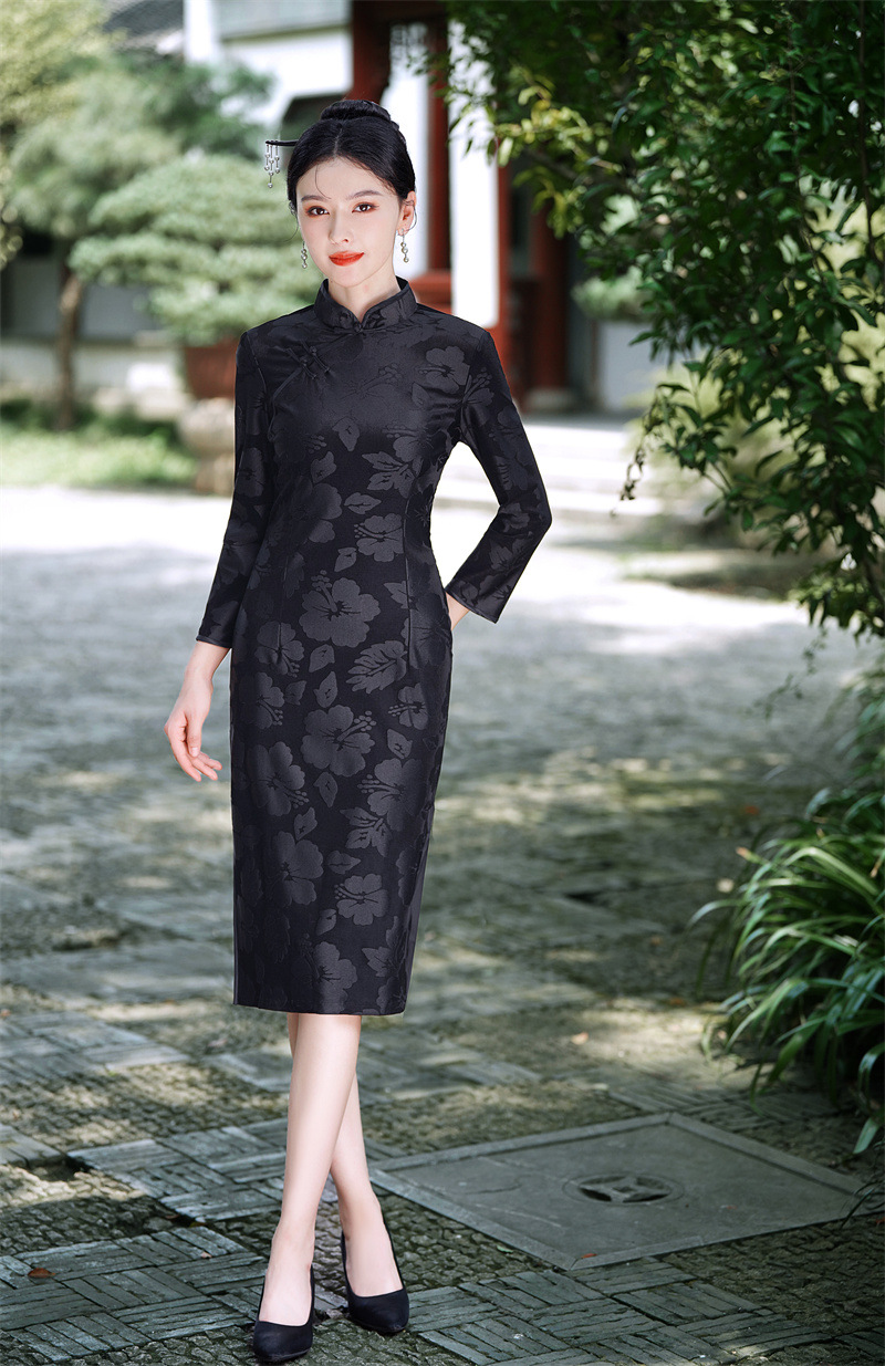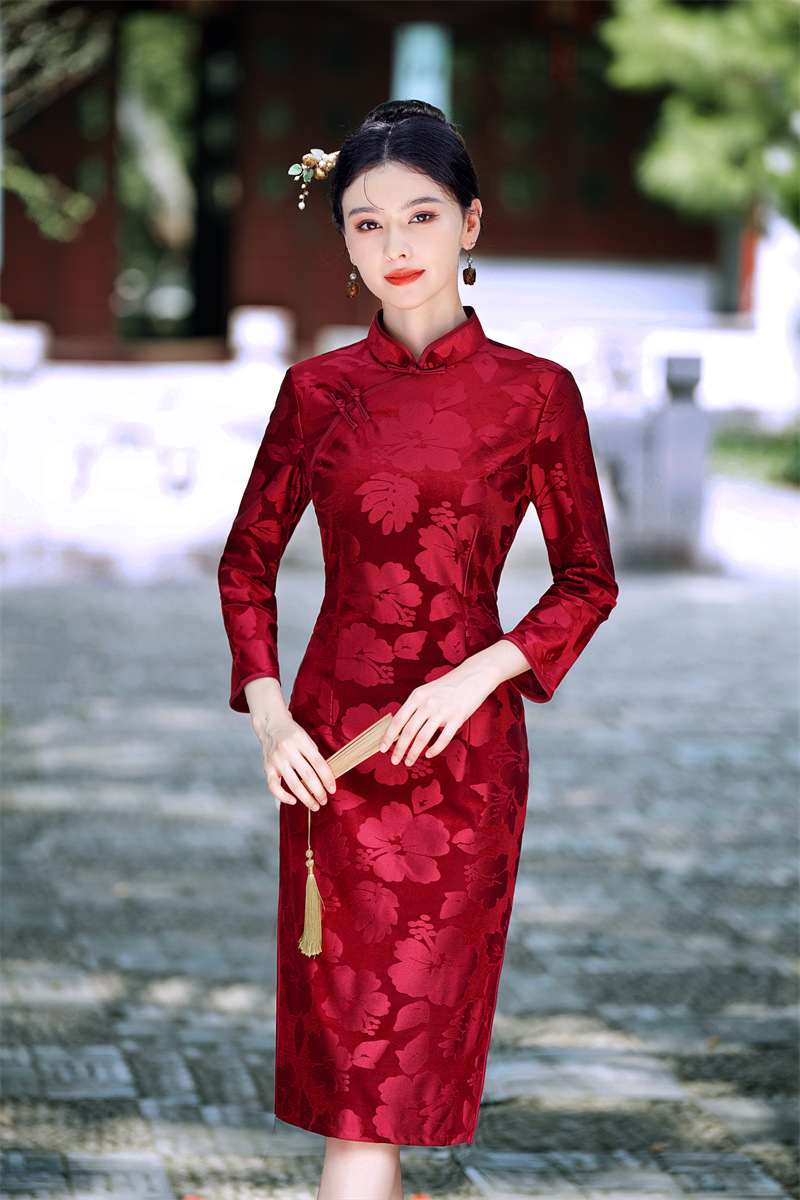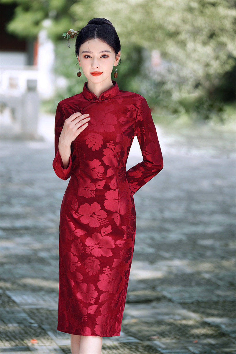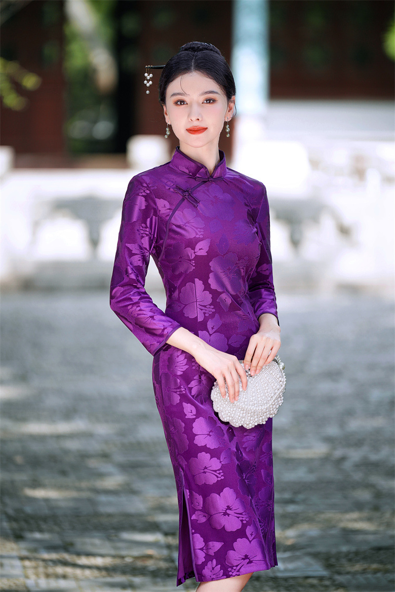 丝绒提花中长七分袖旗袍2023秋新款复古国风喜妈妈旗袍GX