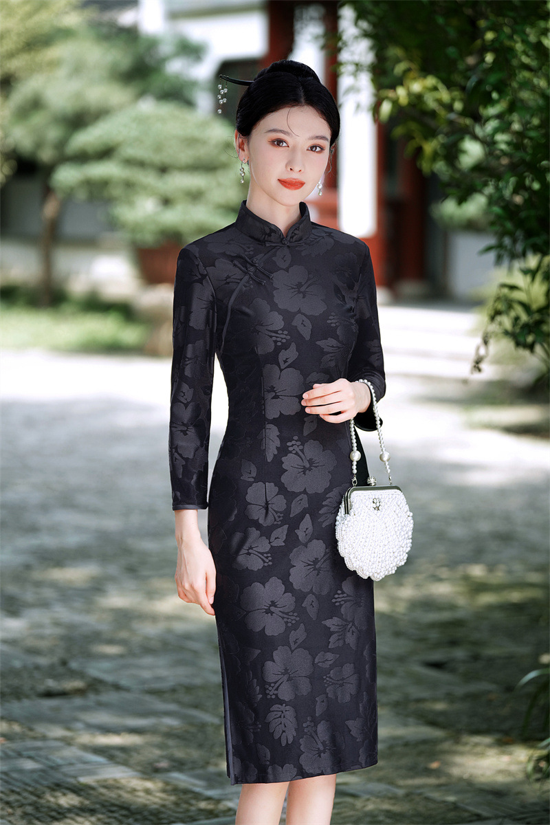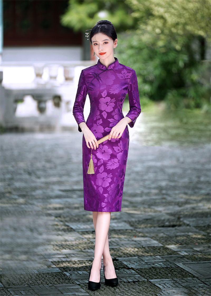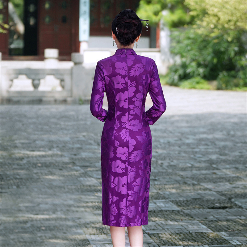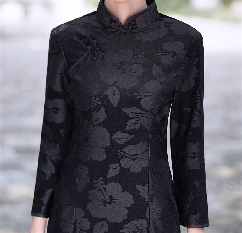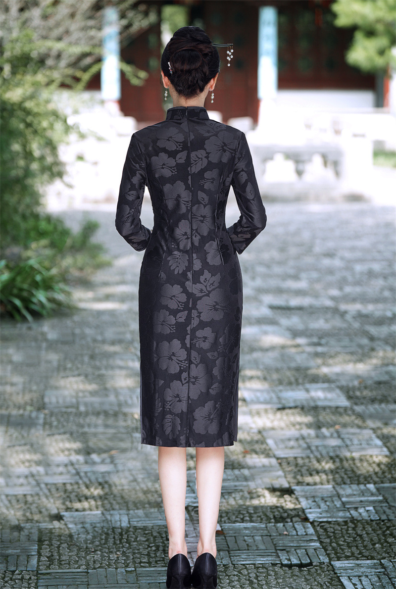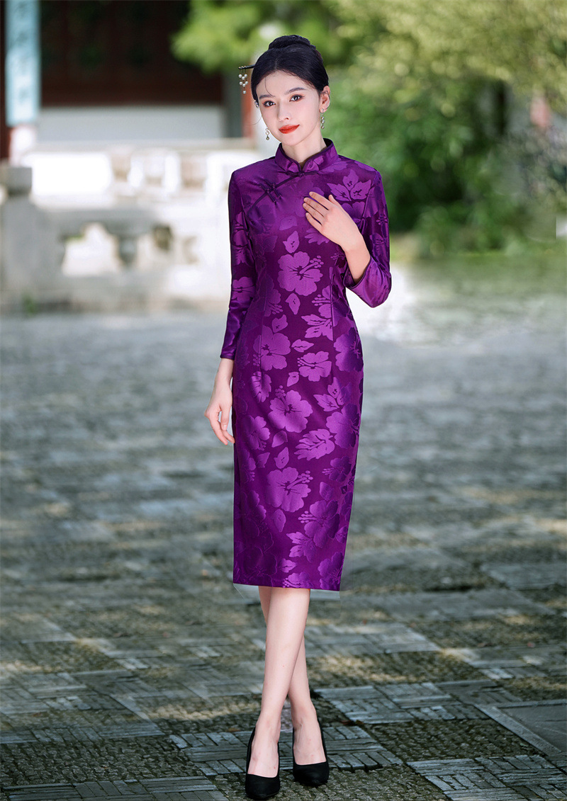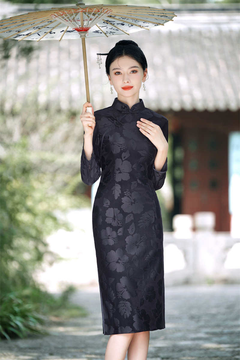丝绒提花中长七分袖旗袍2023秋新款复古国风喜妈妈旗袍GX