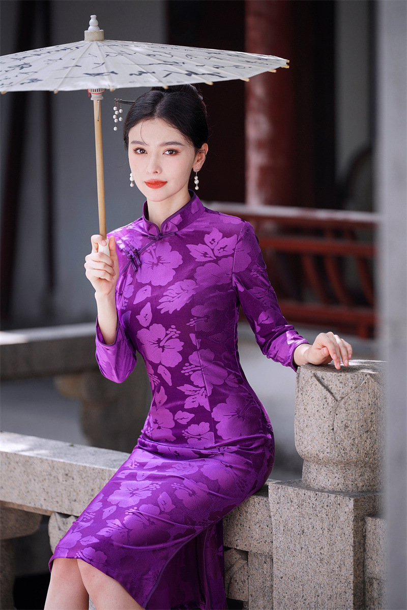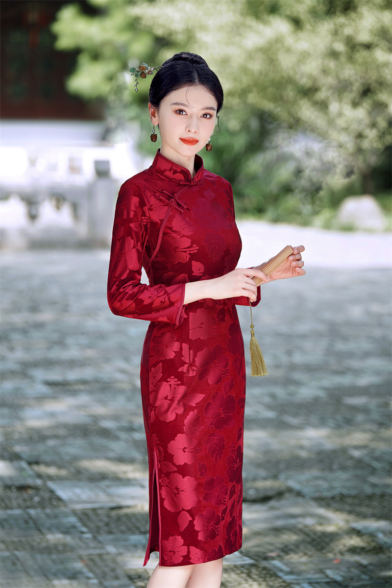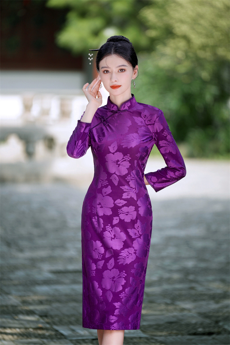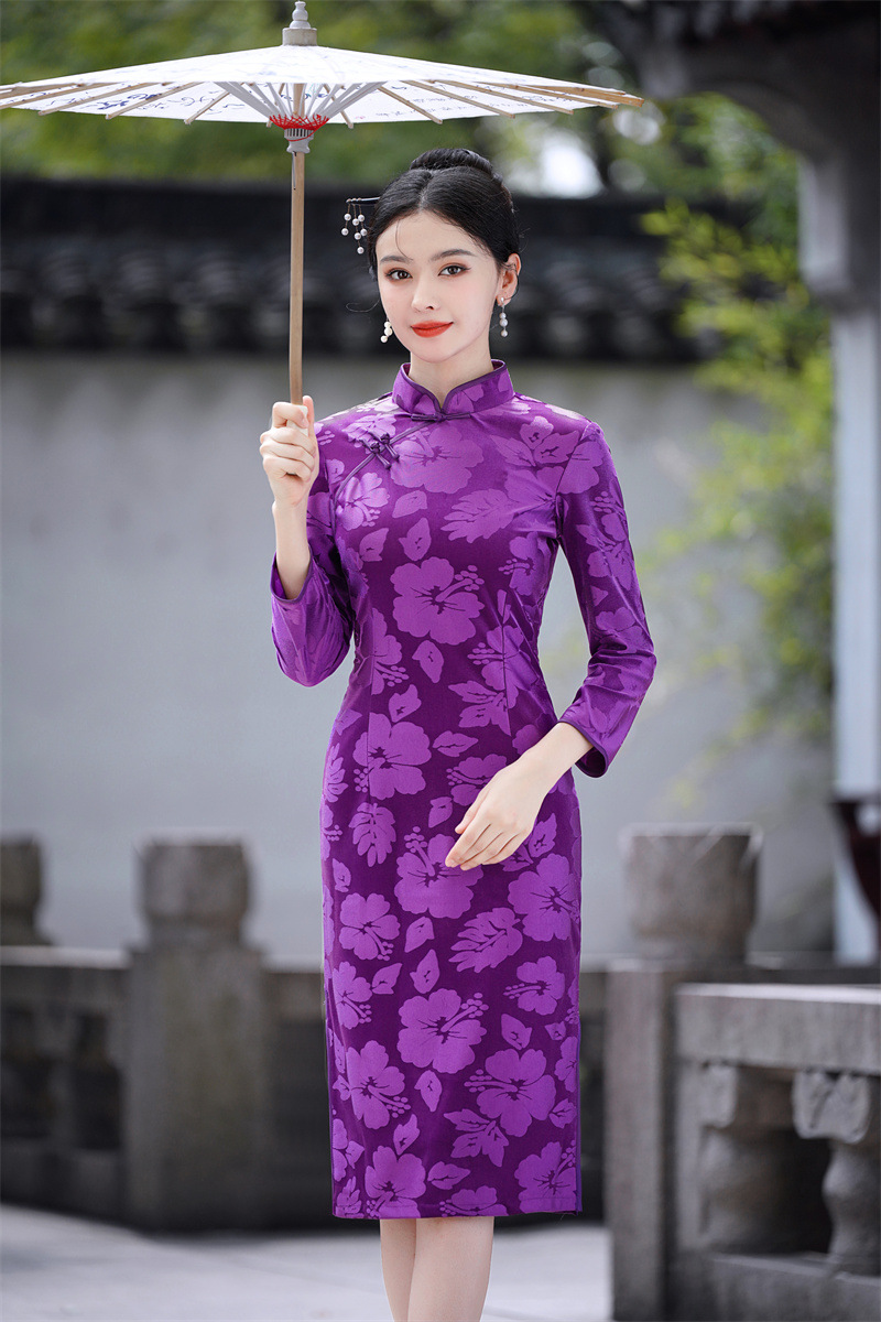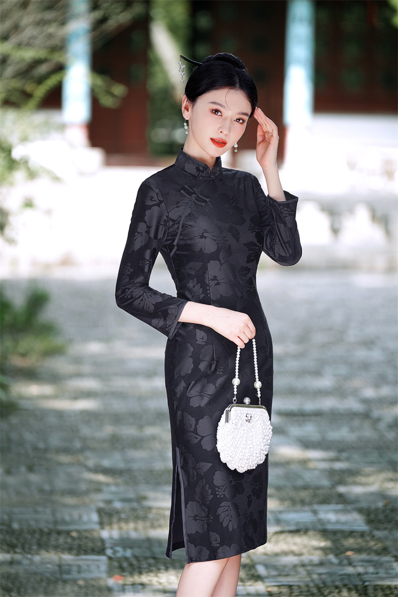 丝绒提花中长七分袖旗袍2023秋新款复古国风喜妈妈旗袍GX