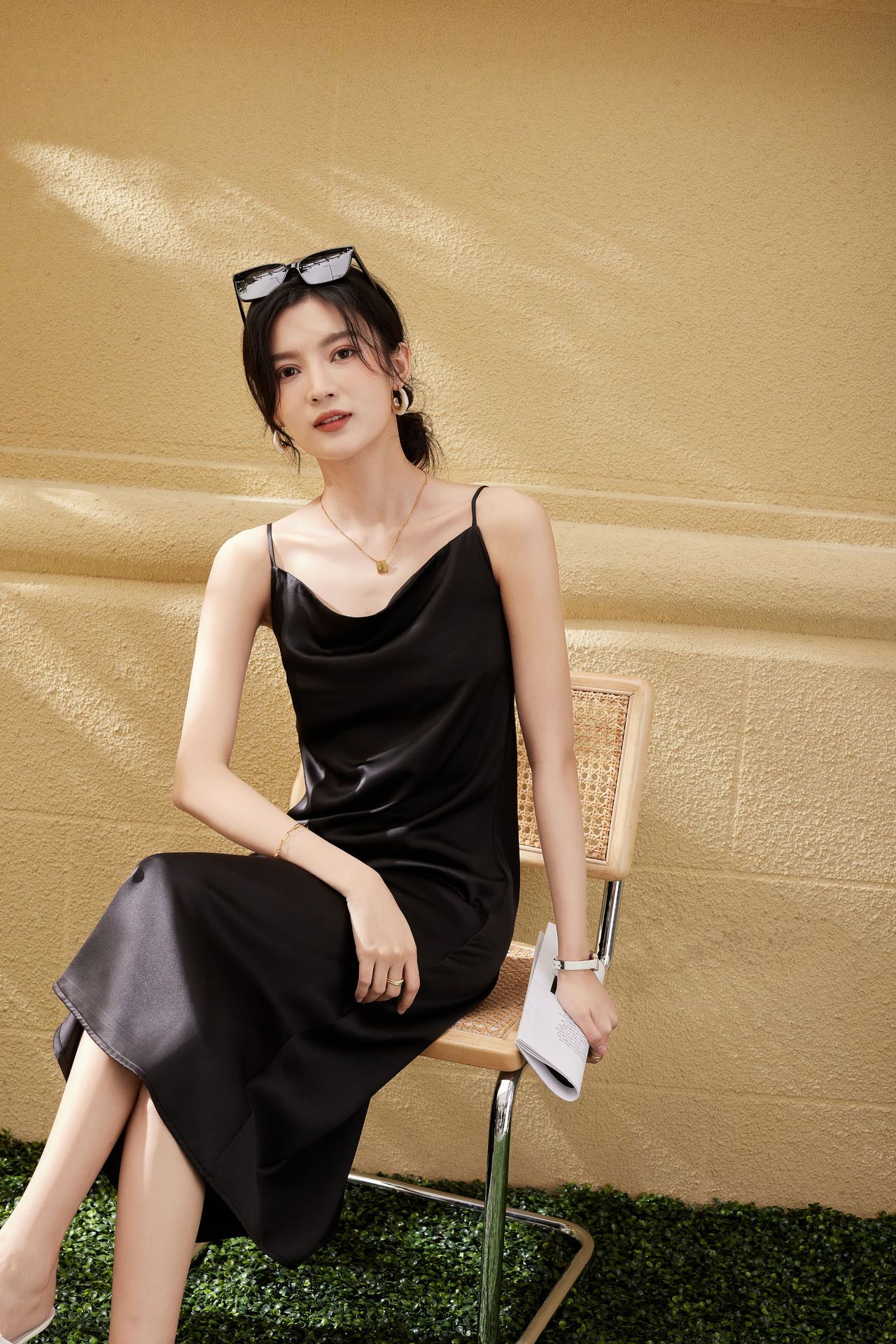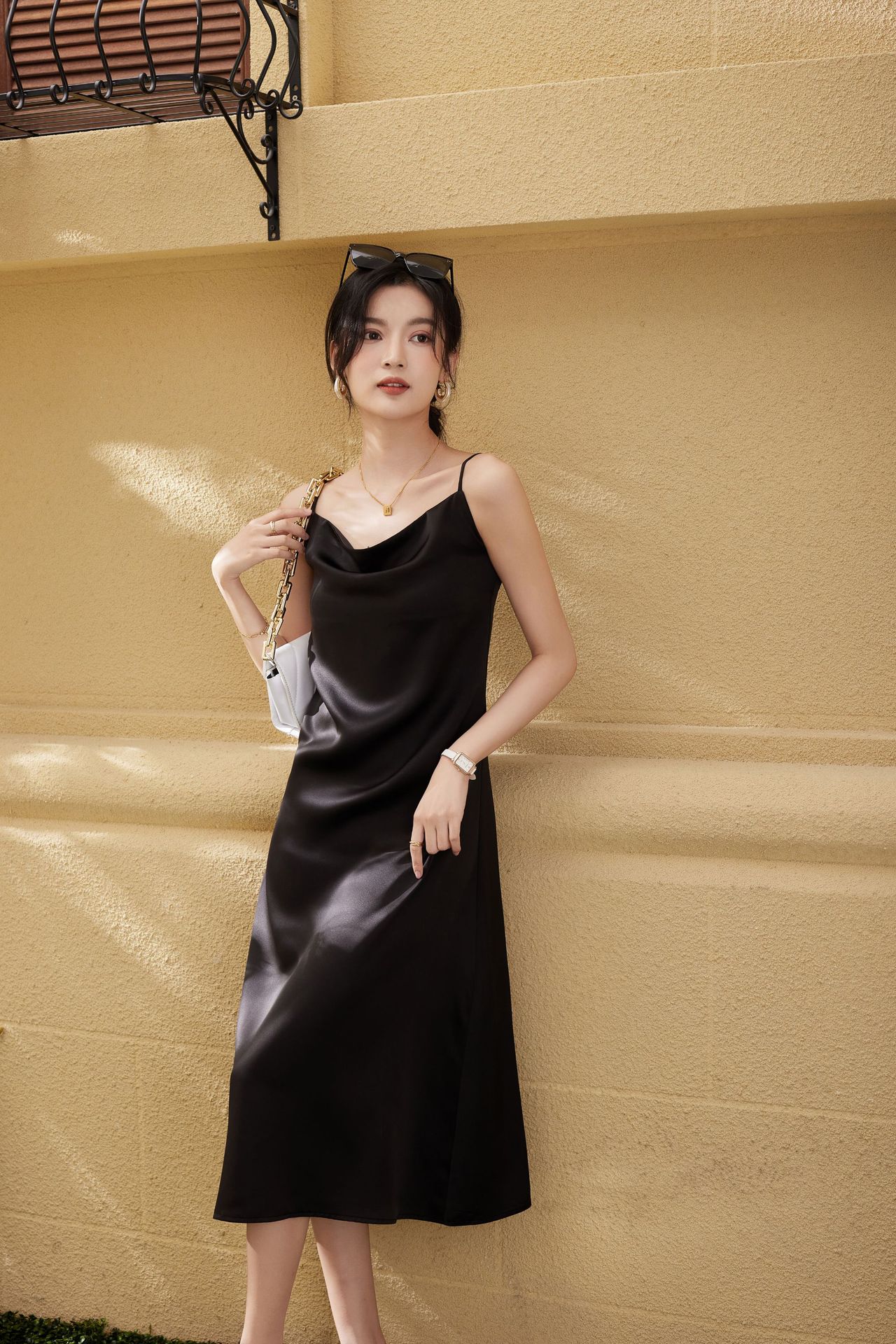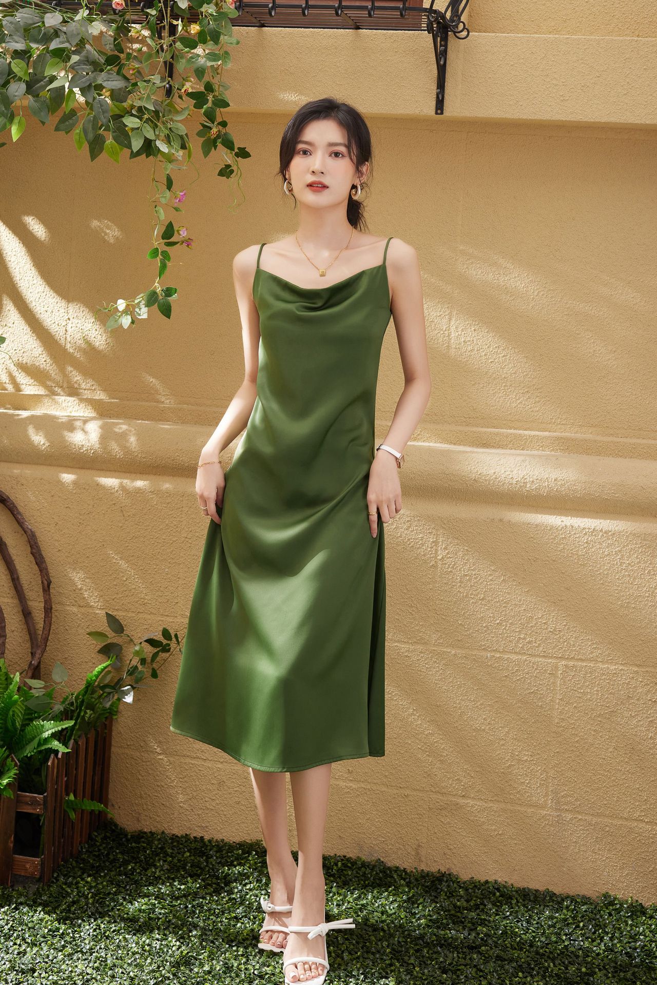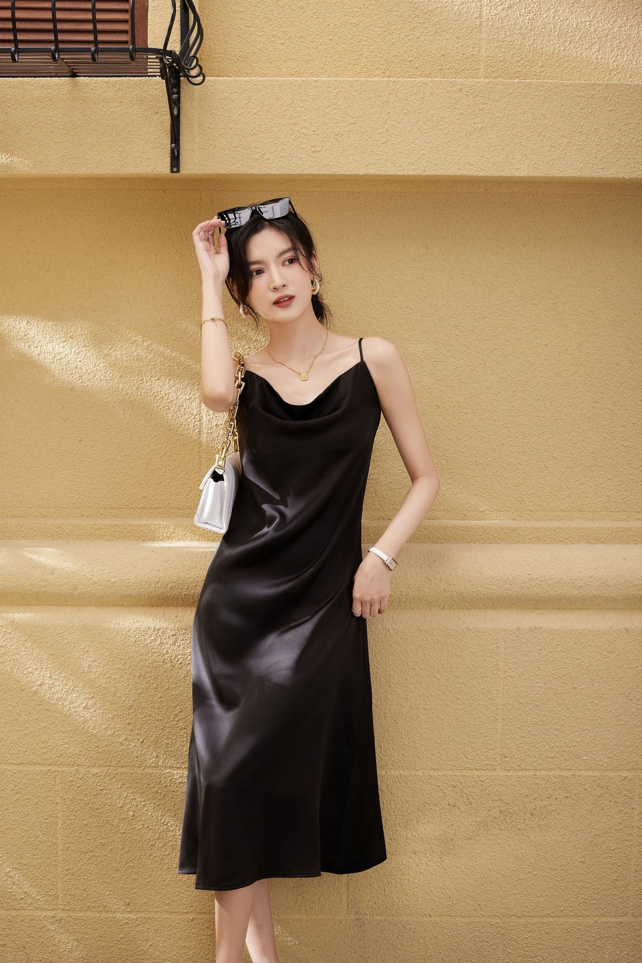 【高级荡领吊带裙】氛围感连衣裙仿醋酸缎面香槟色法式女夏法式礼服裙内搭