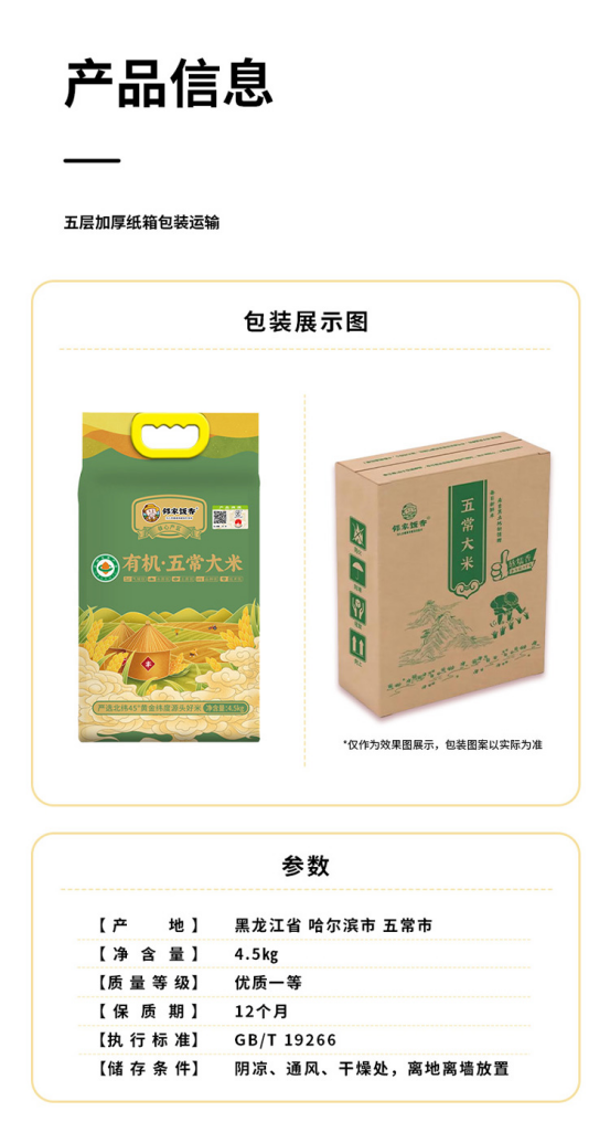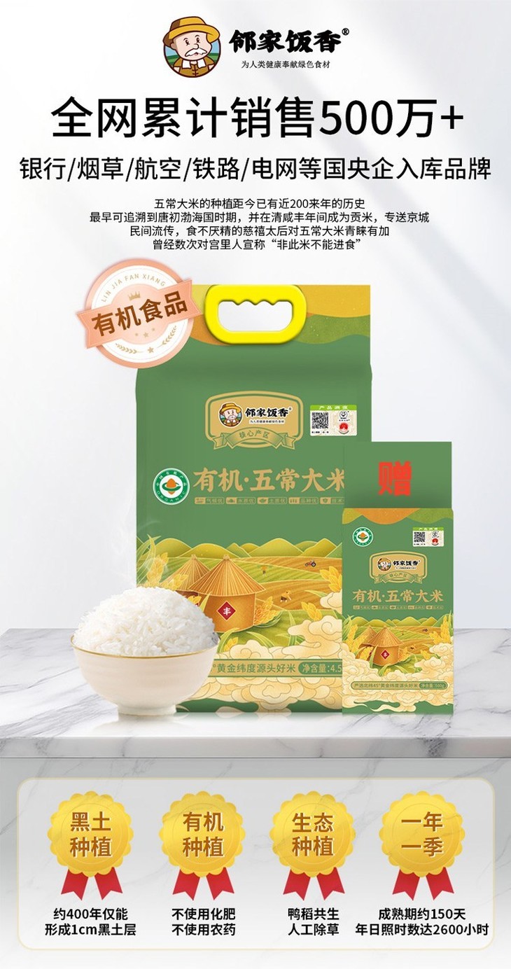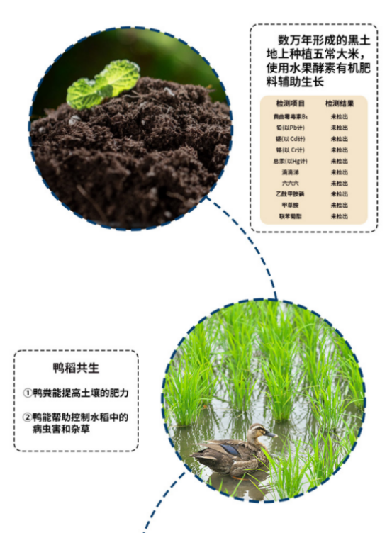 品牌全网单品销量超400万+,全国都有他的忠实粉丝 核心优势: ✔ 民众认可:全网单品销量400万+,银行/烟草/航空/铁路/电网等国央企入库品牌 ✔ 5S品牌:品牌自有三大五常水稻种植基地,集品牌/种植/生产/销售/服务一体化 ✔ 黑土种植:五常市龙凤山核心产区,约400年仅能形成1CM黑土层 ✔ 有机肥料:主要使用水果酵素肥,减少化肥使用 ✔ 生态种植:自有一万亩龙凤山核心种植基地,鸭稻共生,人工除草 ✔ 一年一季:成熟期约150天,年日照时数达2600小时