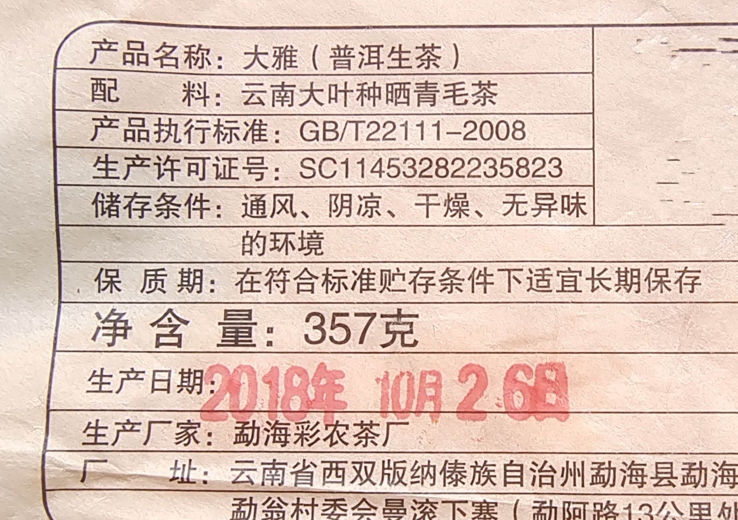 大雅原料精选与刮风寨、铜箐河、弯弓、薄荷塘等一线山头齐名的易武古曼撒核心区国有林里的古树鲜叶,彩农核心工艺全手工、全程不落地匠心制造而成。