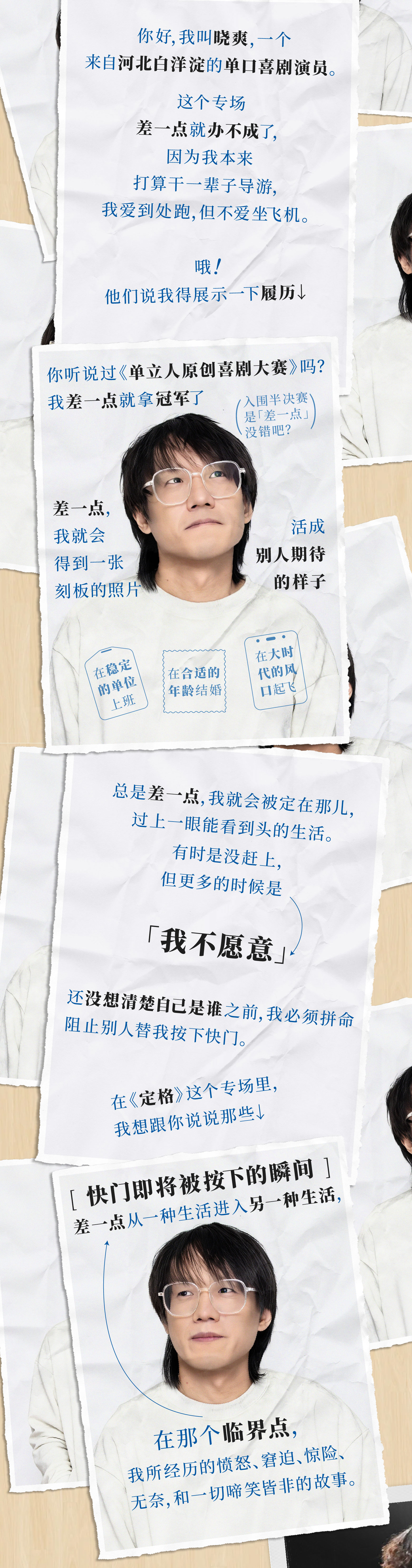 【上海】4月25日周六19:30 晓爽单口喜剧专场《定格》|喜剧联盒国@新天地 · 喜联空间