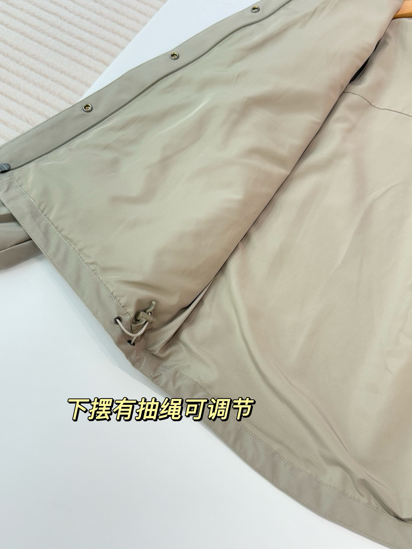 下摆有抽绳可调节,不系时侧面是小斗篷的A字线条,抽紧抽绳下摆折到臀上,调整身材比例显腿长~