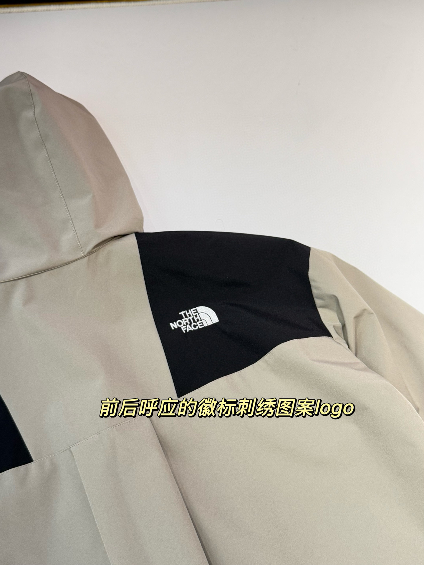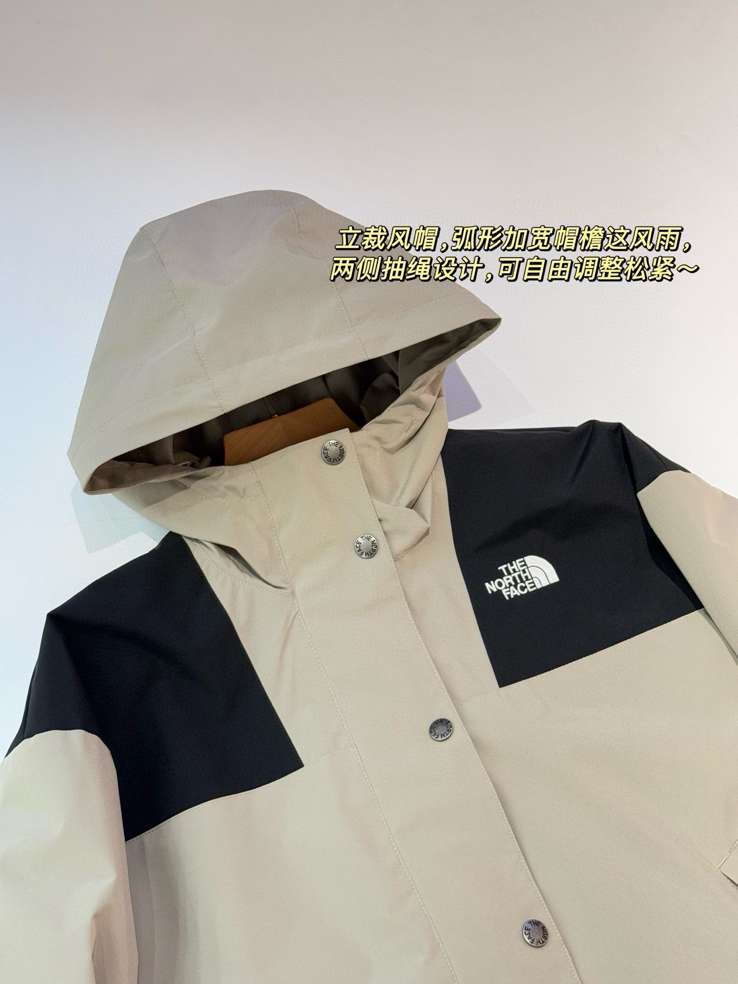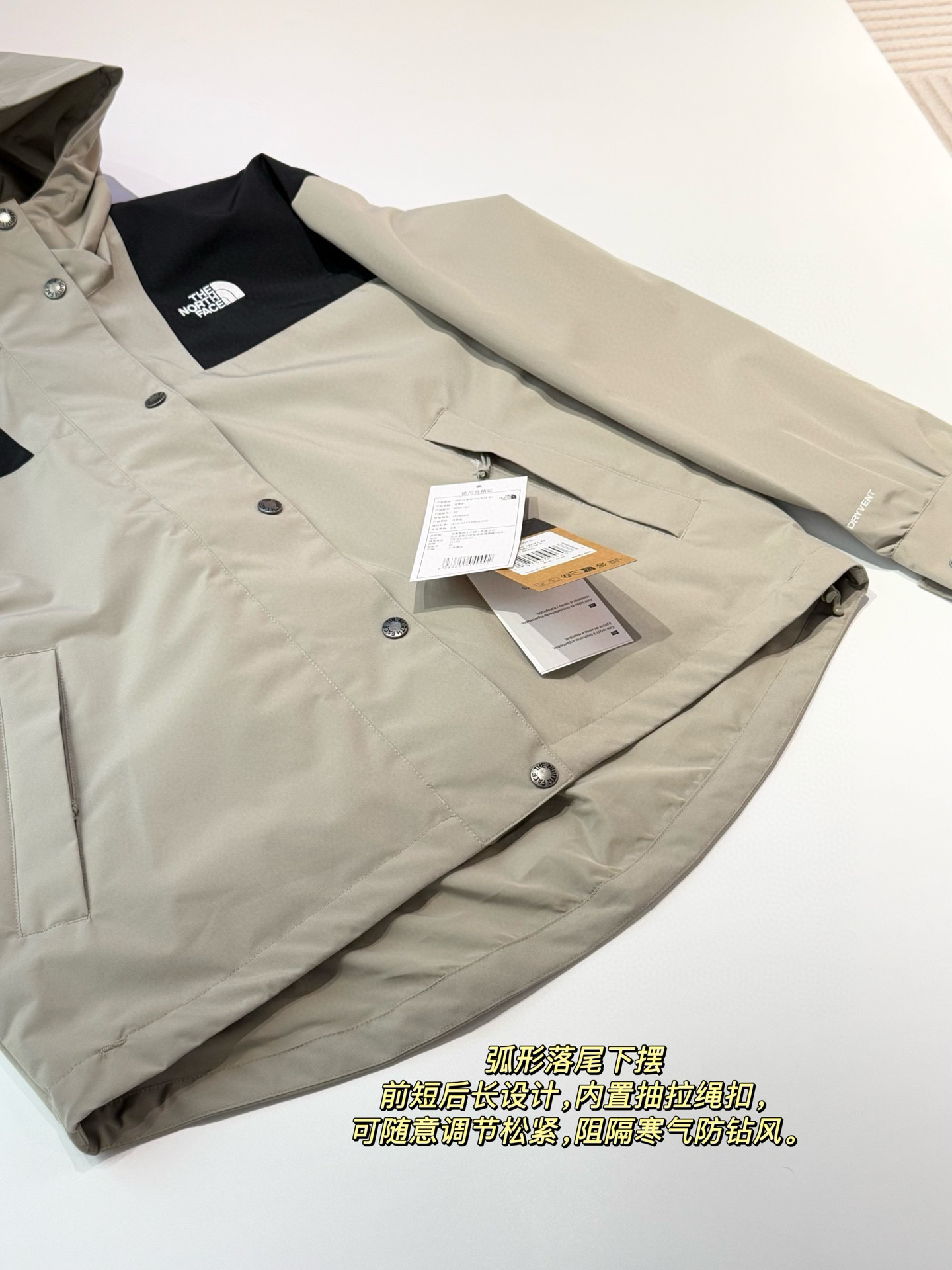 立裁风帽,弧形加宽帽檐这风雨,两侧抽绳设计,可自由调整松紧~前后呼应的徽标刺绣清晰完整不透底,袖子上的面料标识刺绣也特别精致!
