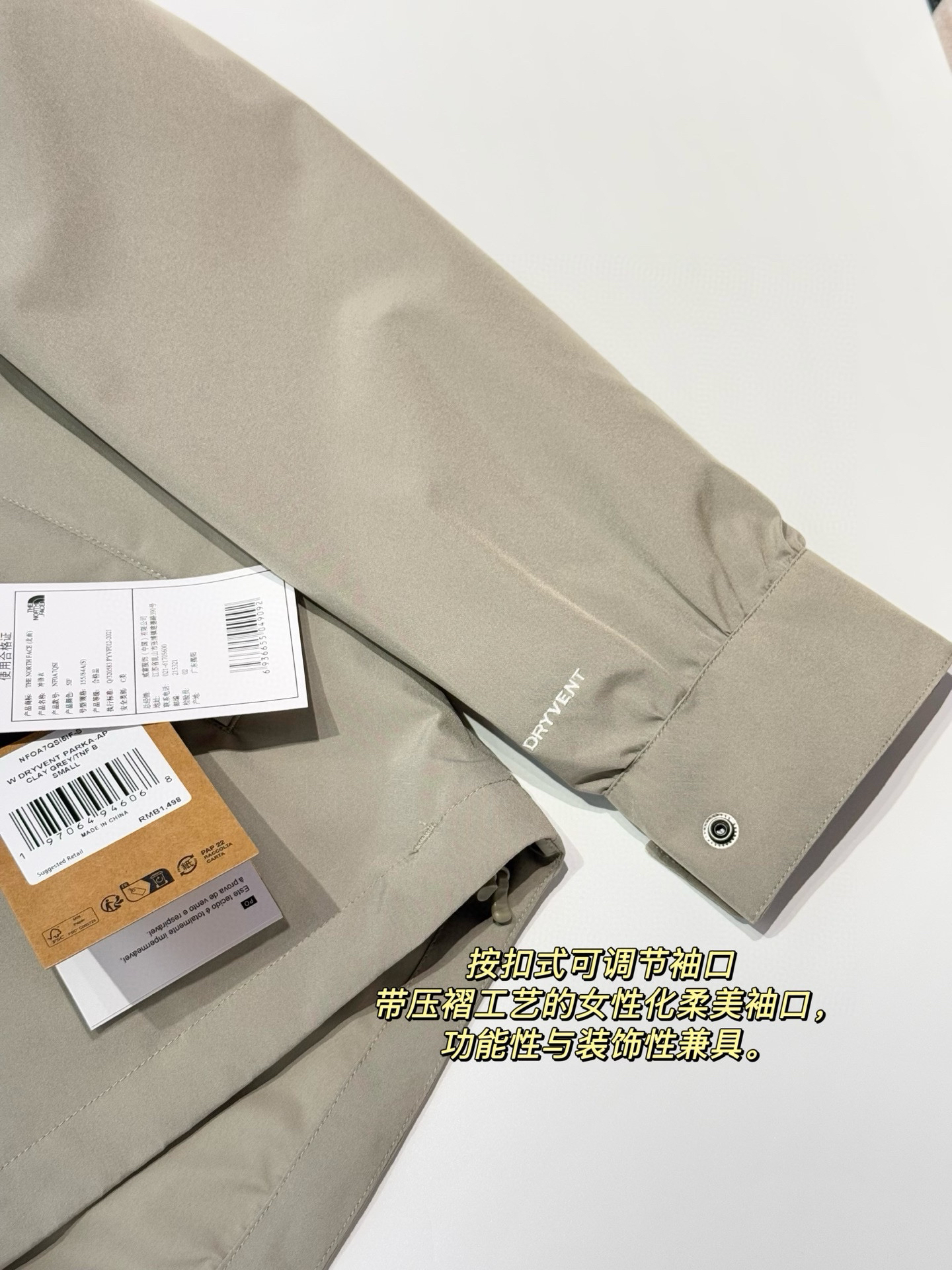 可对比客供Dryvent梭织外壳,柔韧挺括抗风雨,布面柔韧有筋骨,上身有型不软塌,挺括但不生硬,垂顺轻盈不压身~