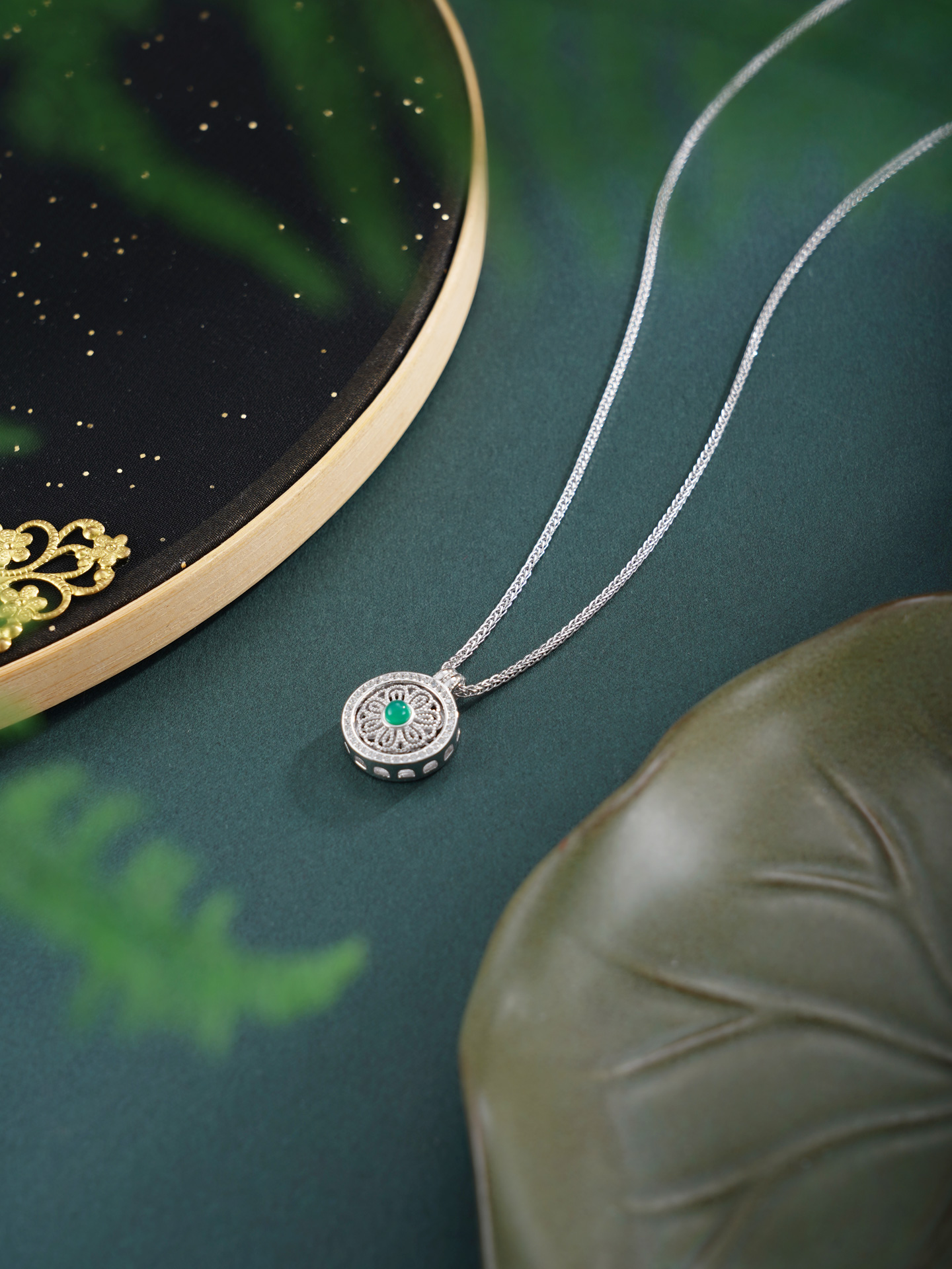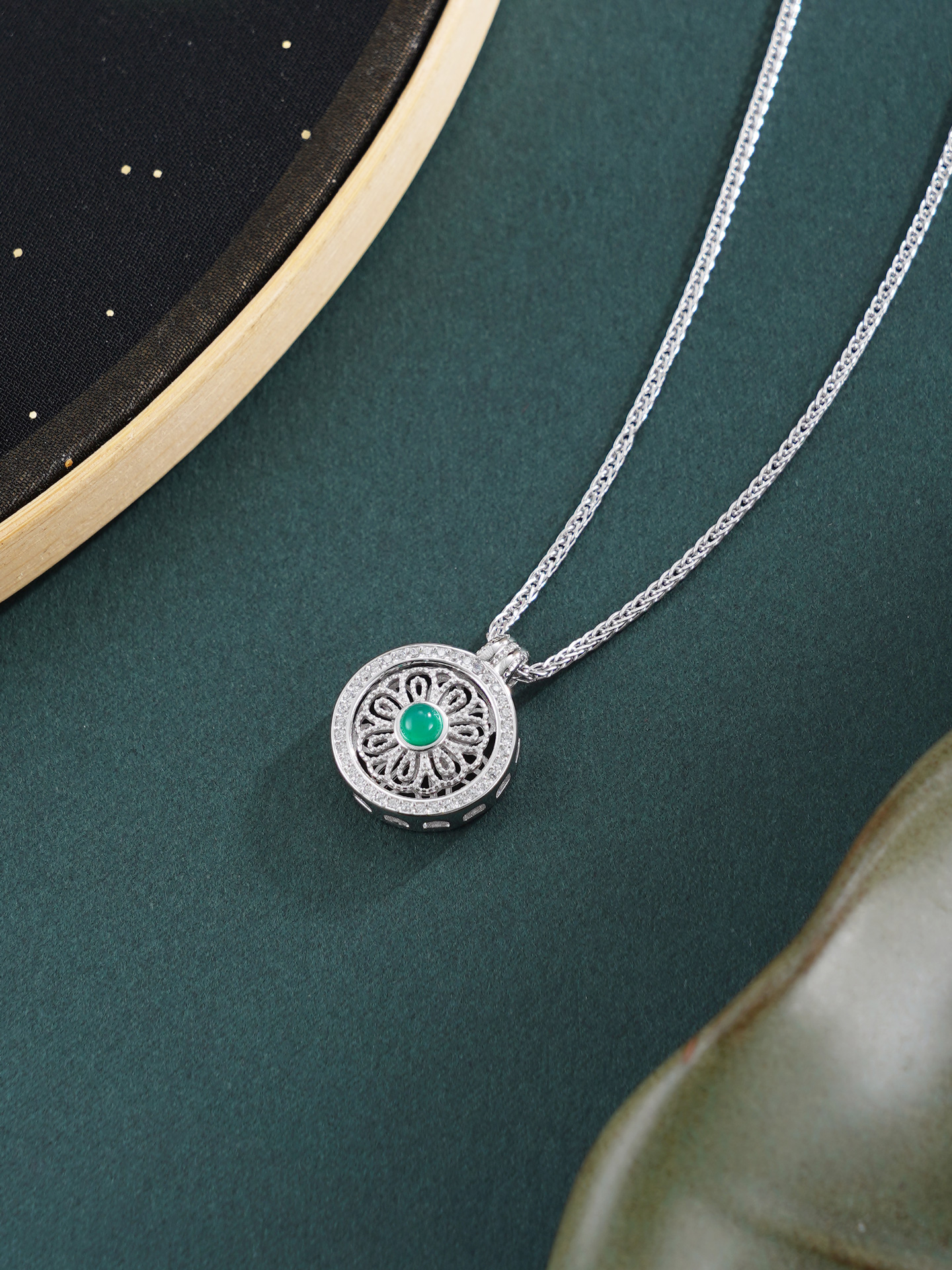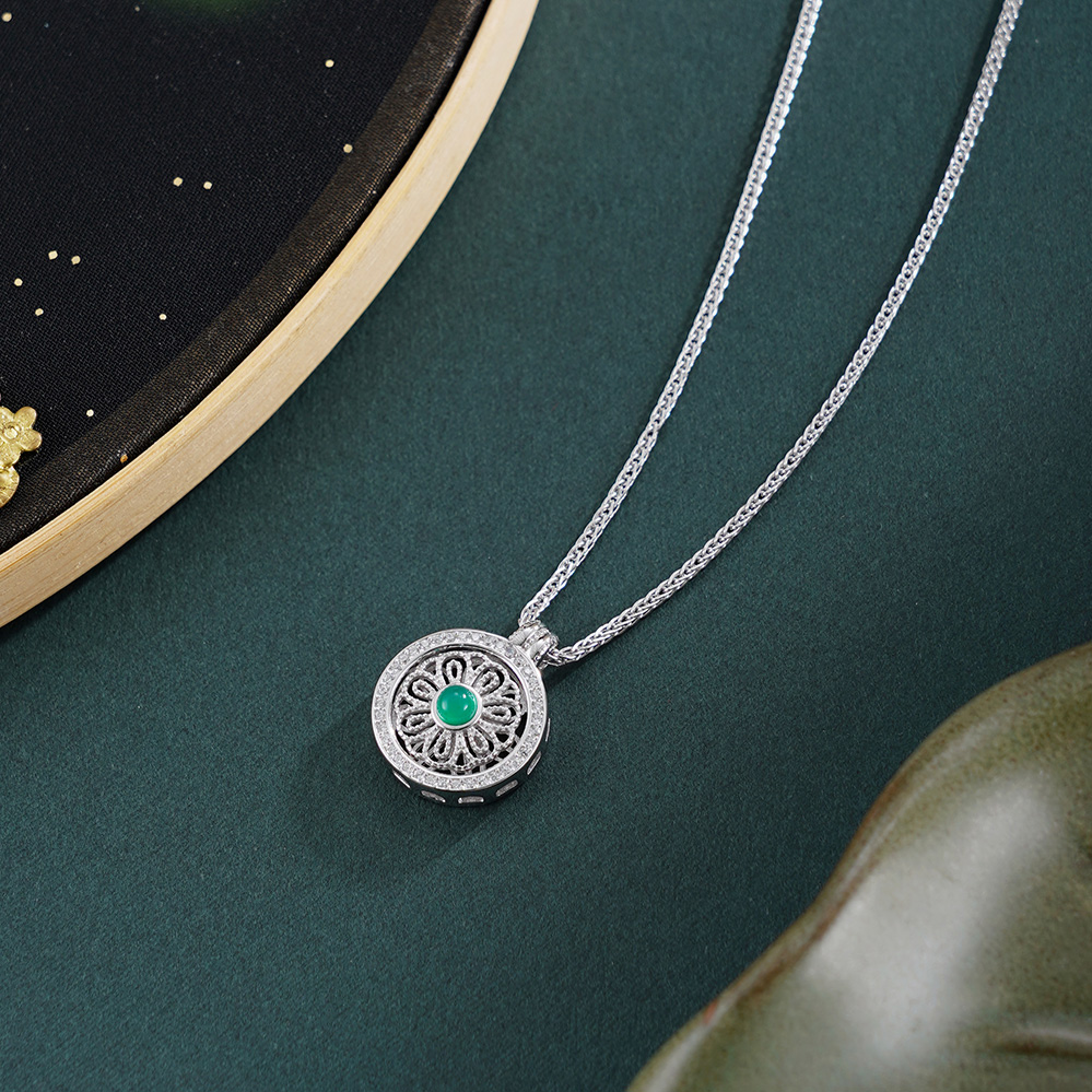 【寓意】:以纯银勾勒清雅花形,中央镶嵌玉髓,象征生命绽放与新生之机;可转动设计,寓意福运初启,事业逢春,生活芬芳满途。