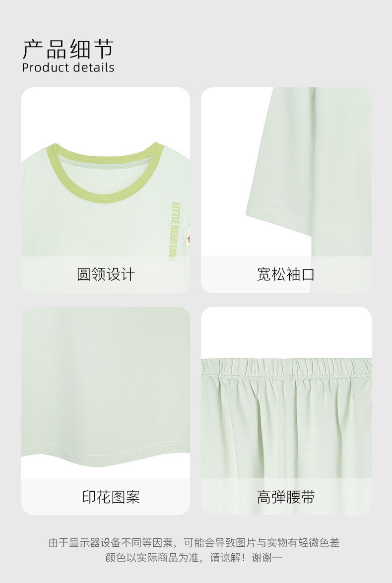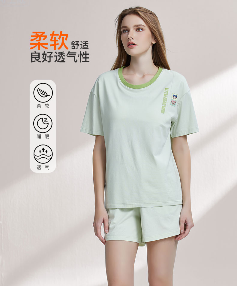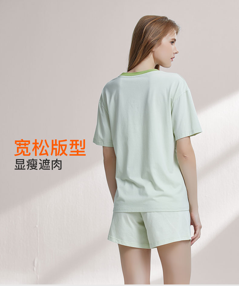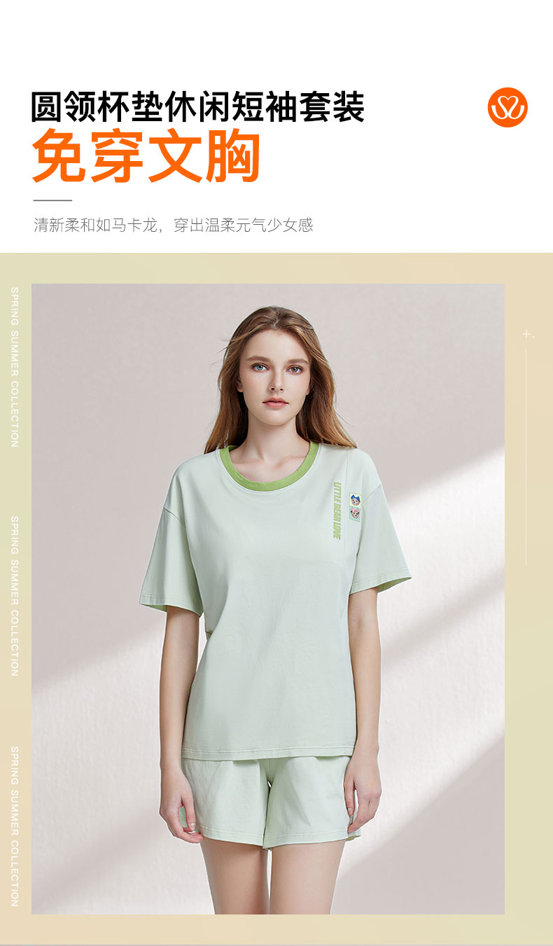 【7.5折限时特惠】【秀黛】女圆领杯垫休闲短袖套装显瘦落肩清新少女风女士夏季短袖睡衣家居服W2551068T【门店同款】