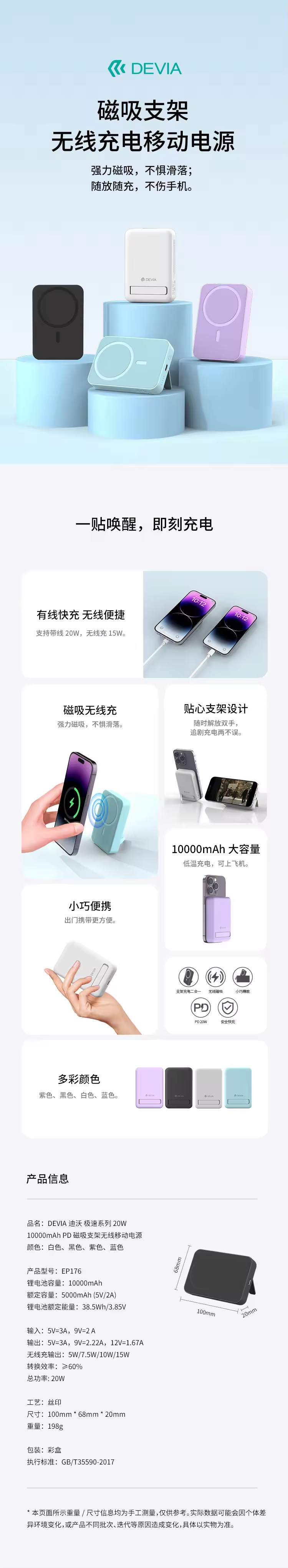 DEVIA迪沃 极速系列 20W 10000mAh PD 磁吸支架无线移动电源