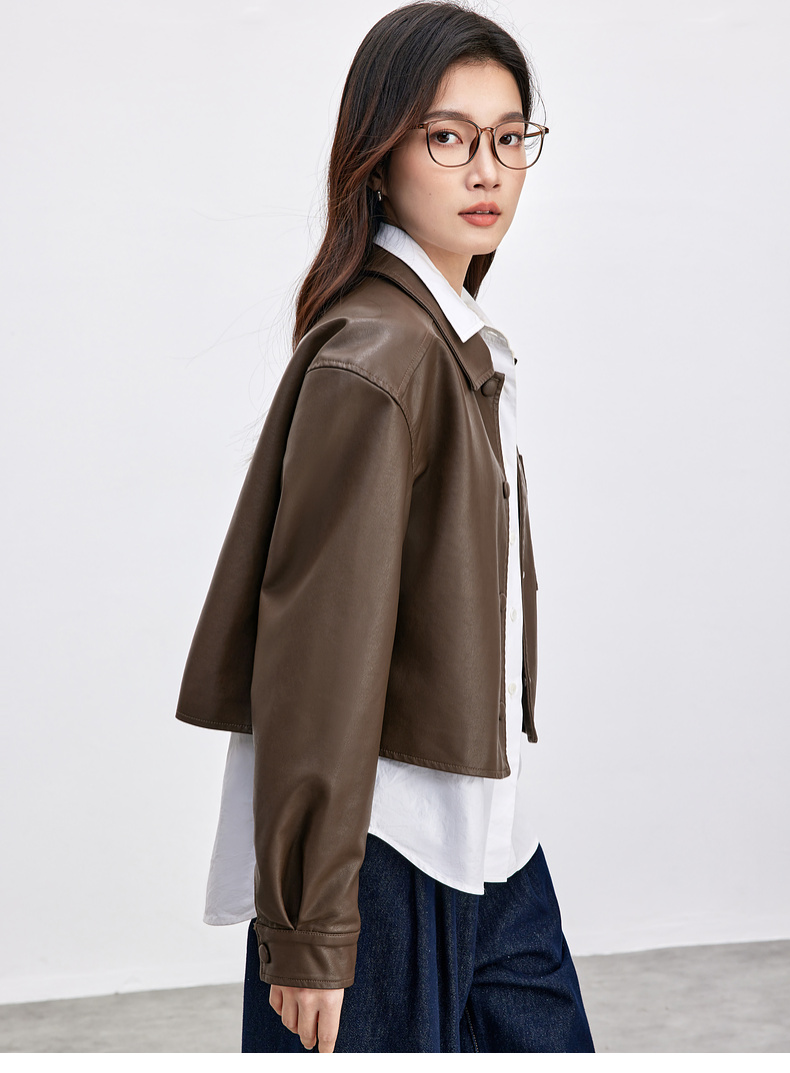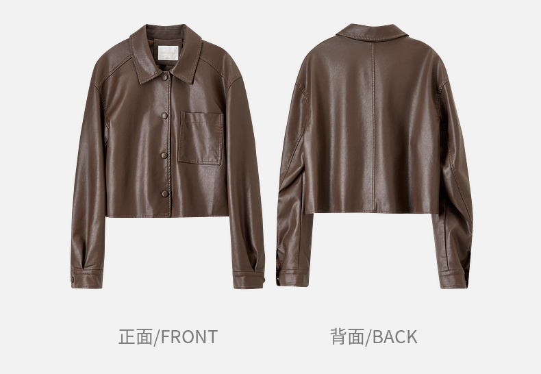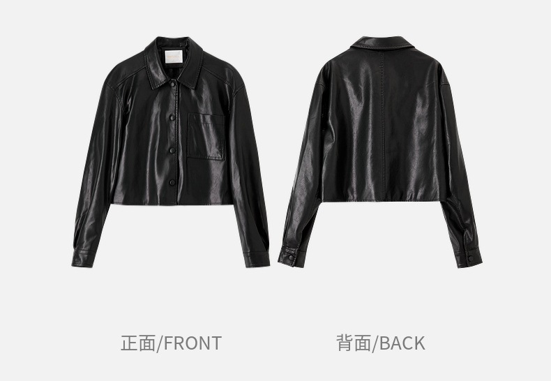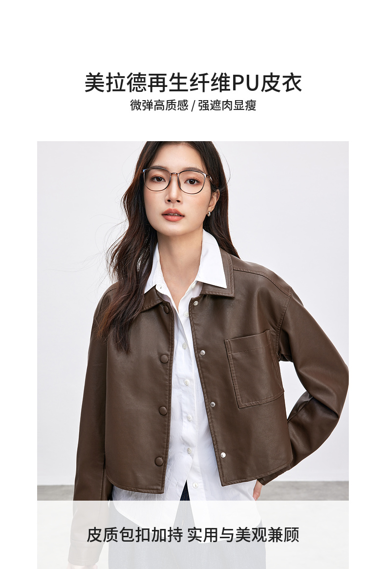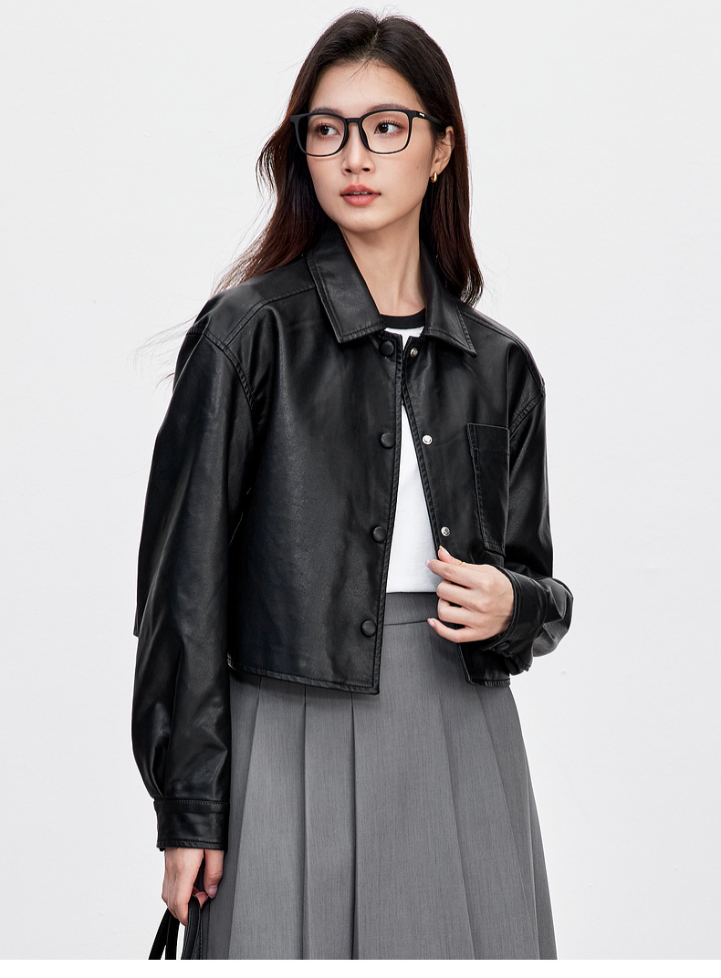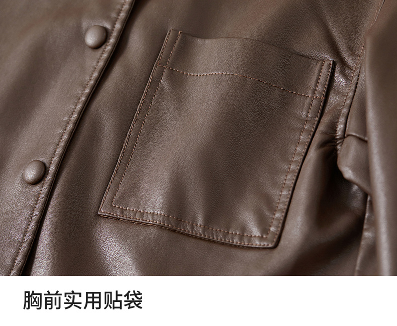 【内购】都市摩登通勤翻领皮质包扣单褶宽松微弹PU皮衣外套-W51G73597