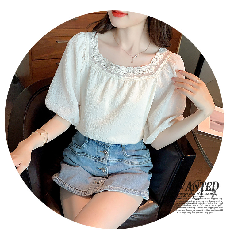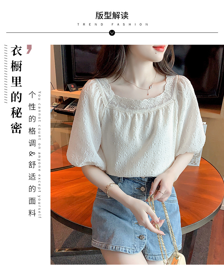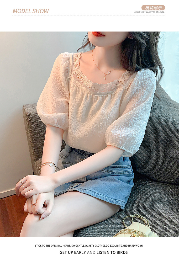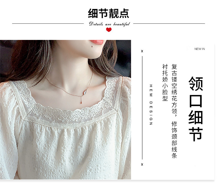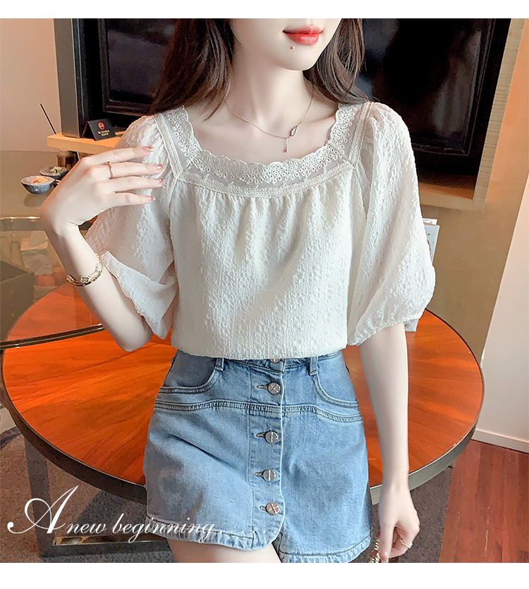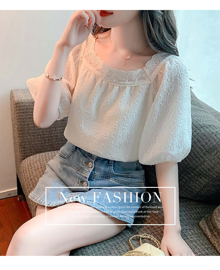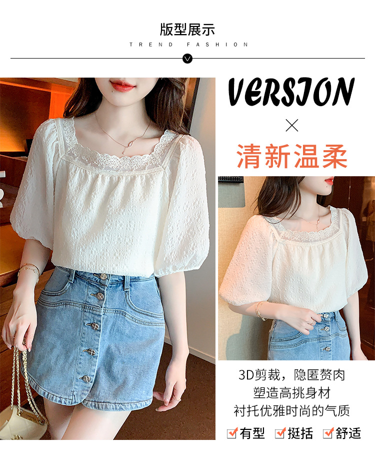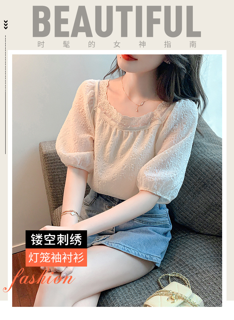 新款方领,蕾丝花边泡泡袖气质雪纺衫衬衫钉珠上衣KQL-6176