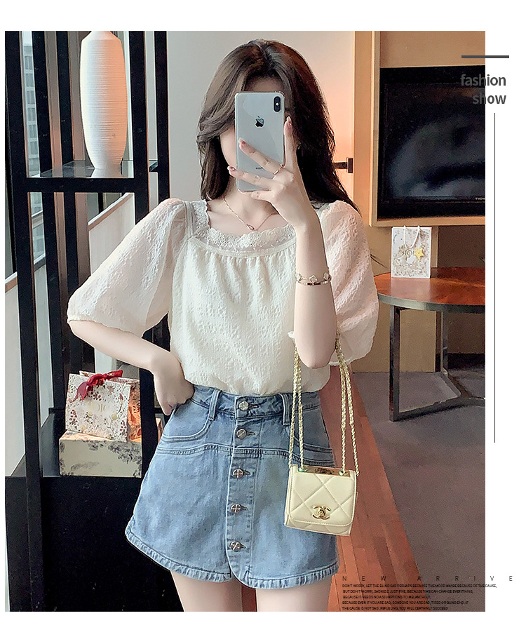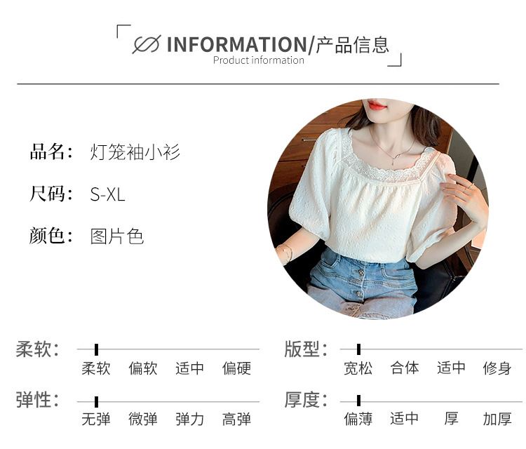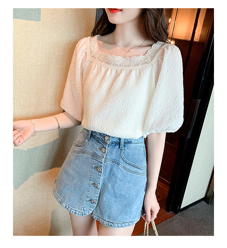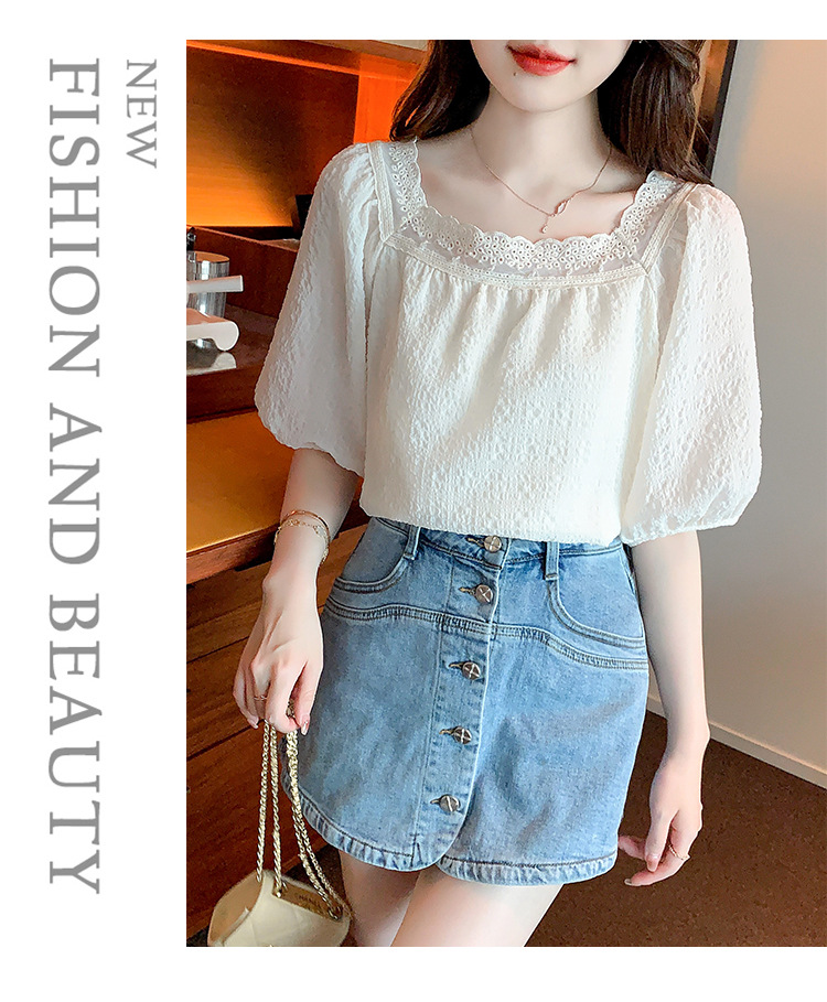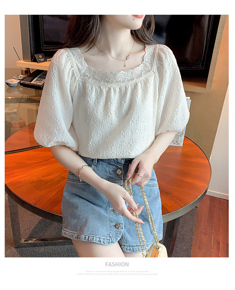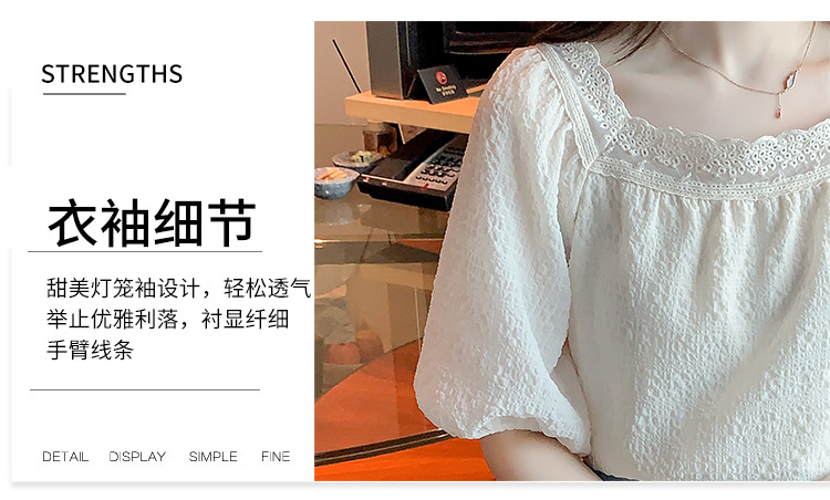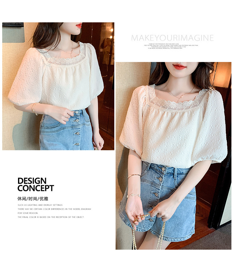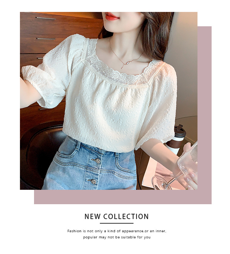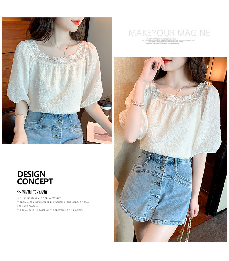 新款方领,蕾丝花边泡泡袖气质雪纺衫衬衫钉珠上衣KQL-6176