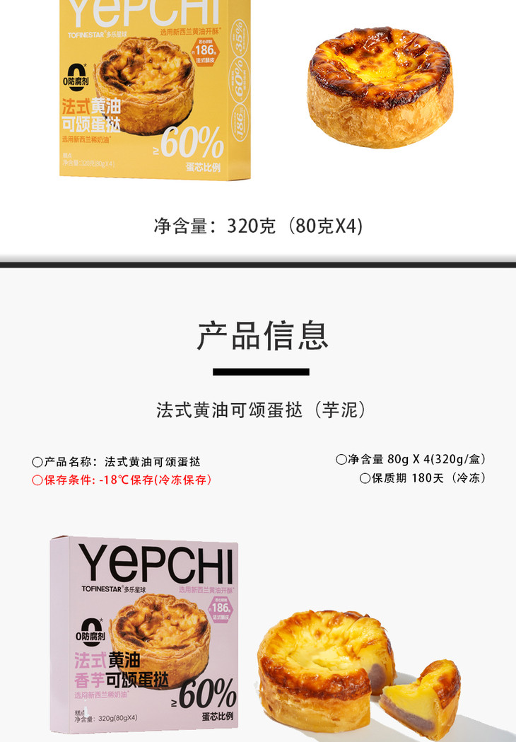 【浓郁细腻 口感大满足】TOFINESTAR多乐星球 法式黄油可颂蛋挞 原味/芋泥/血糯米 家用烘焙空气炸锅半成品早餐下午茶 320g/盒