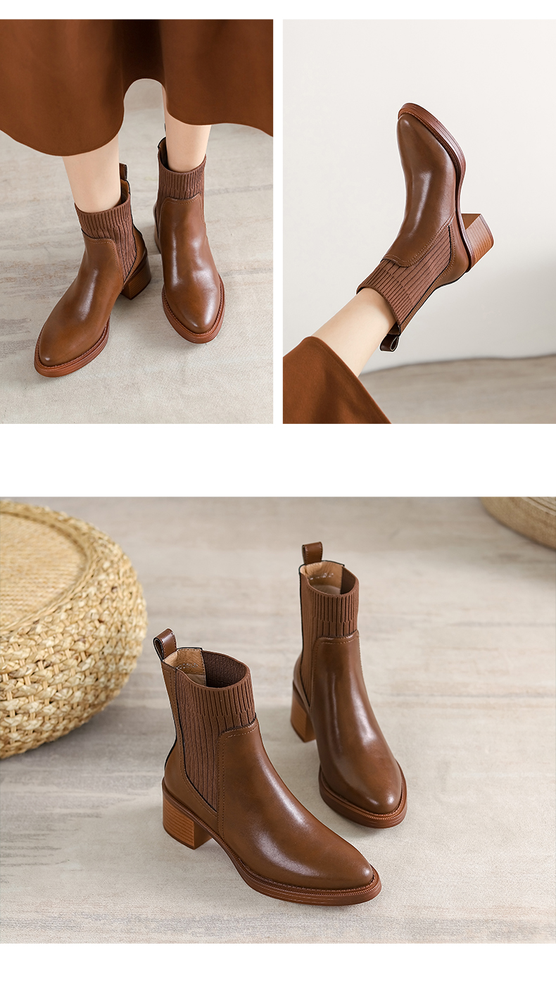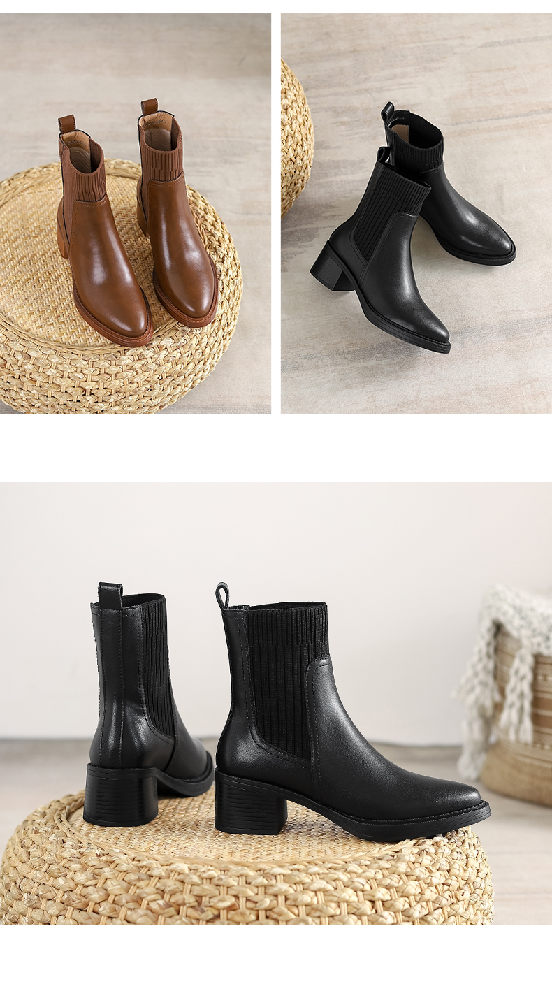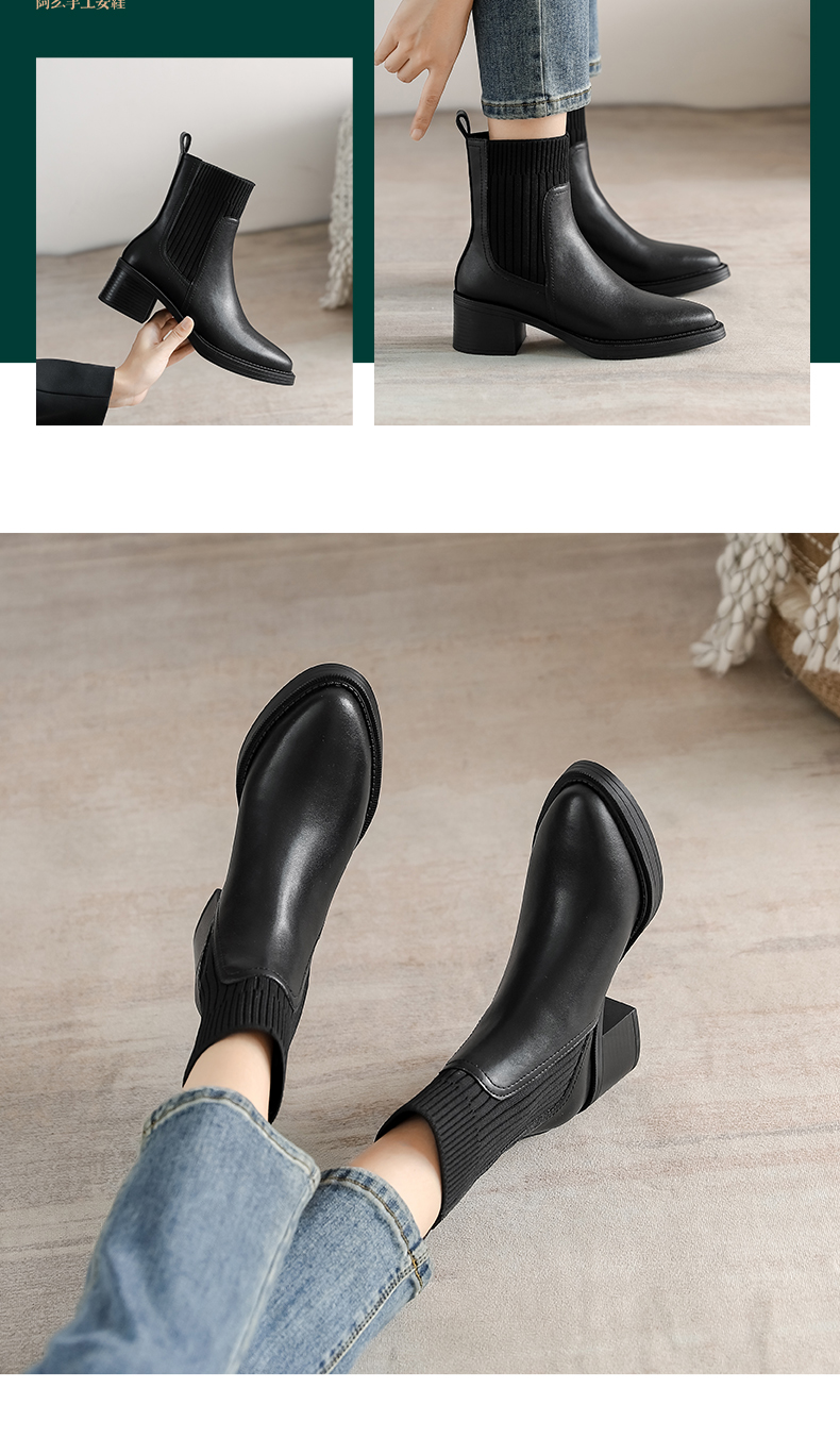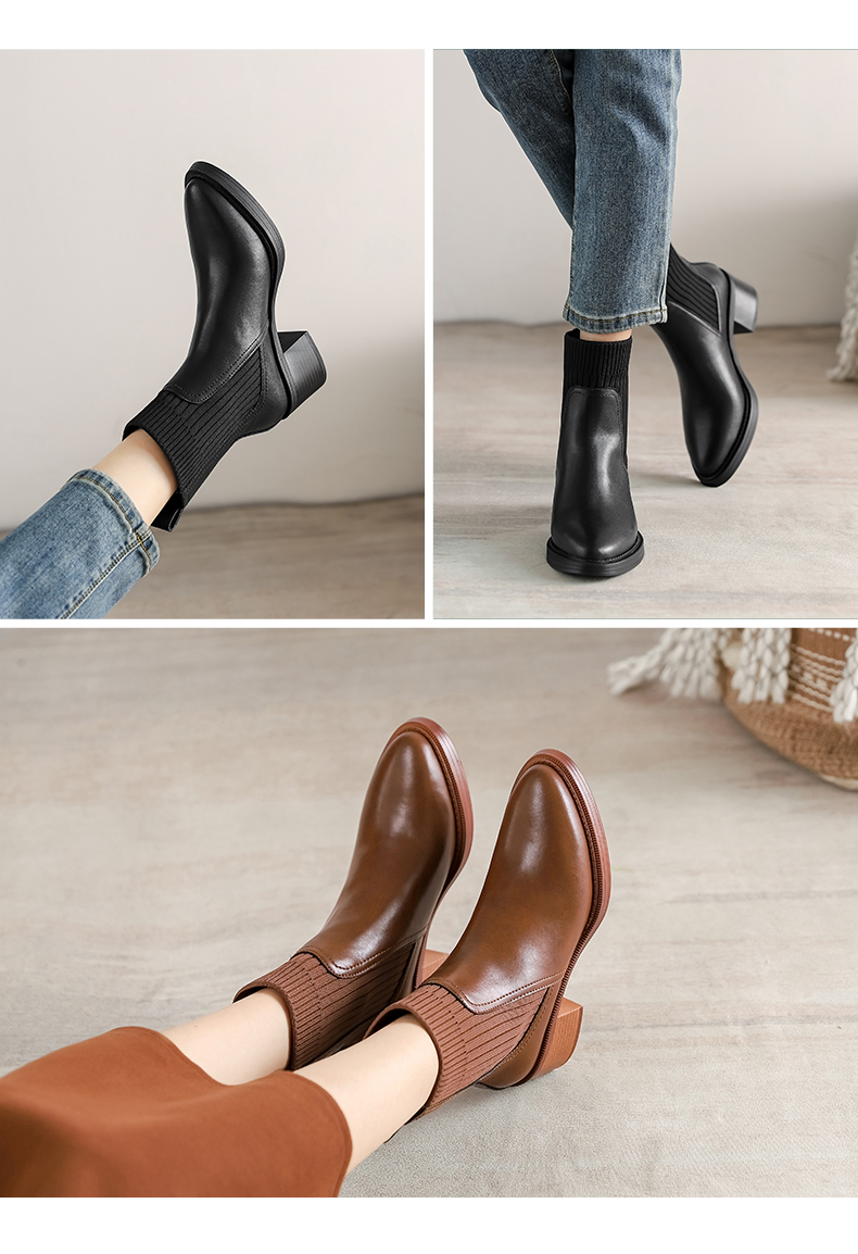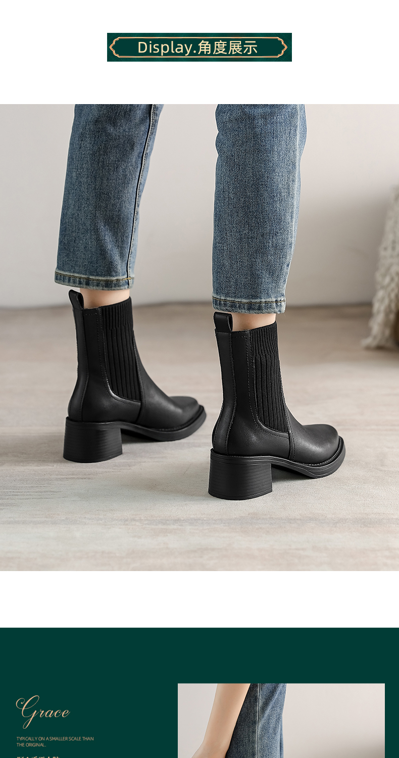 阿么手工女鞋针织粗跟短靴女2023新款一脚蹬百搭5.5CM高跟瘦瘦靴