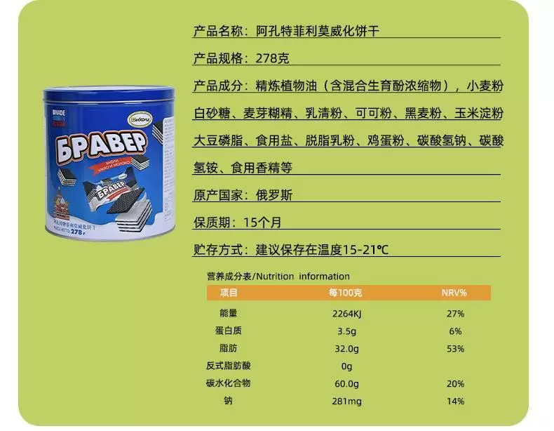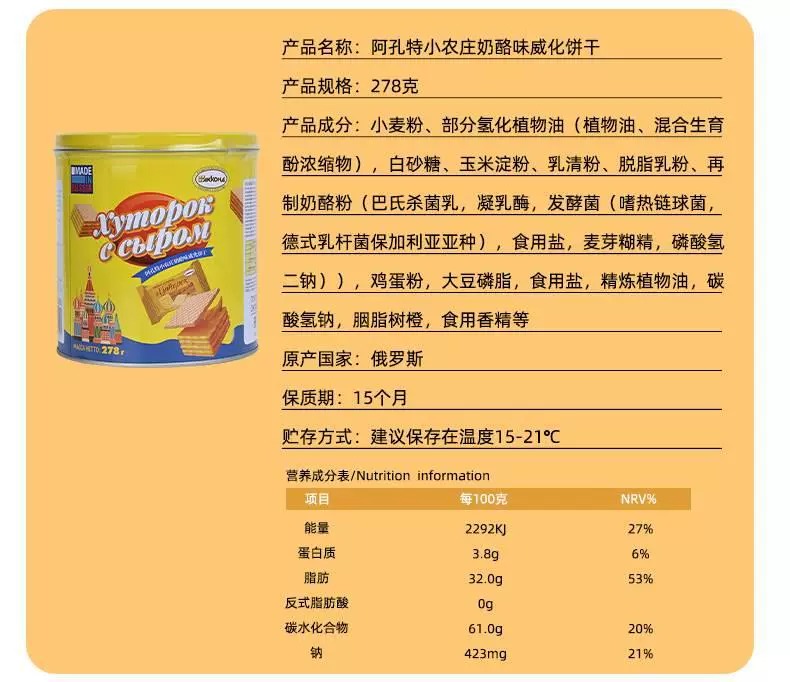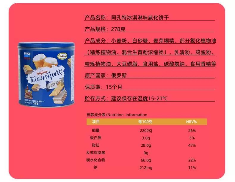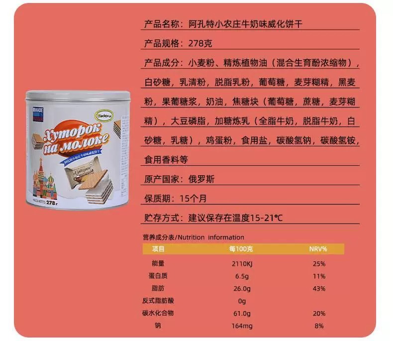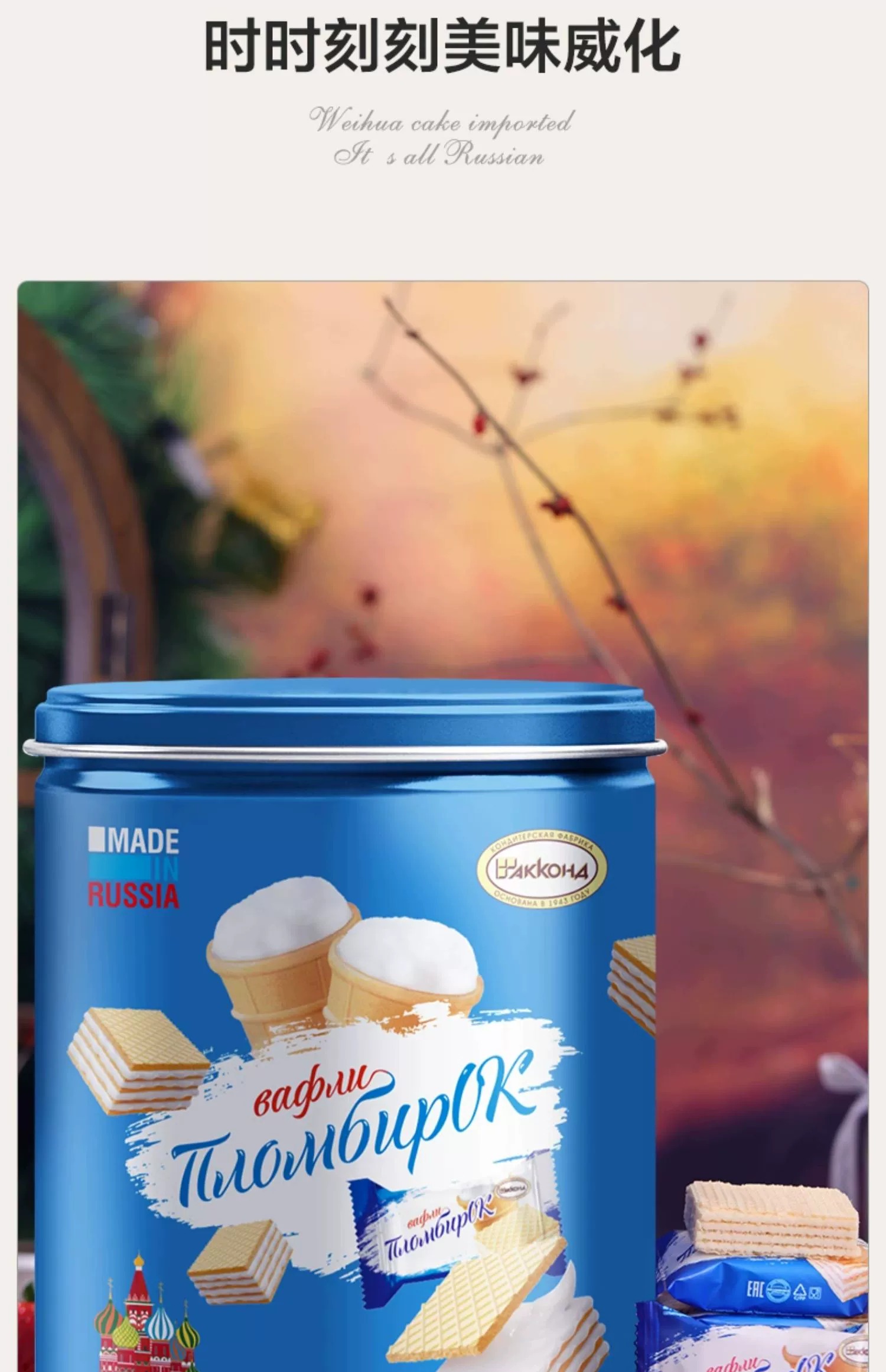 【中欧班列精选】俄罗斯进口阿孔特菲利莫味/冰淇淋味/牛奶味/奶酪味多口味夹心多层威化罐装 278g/罐