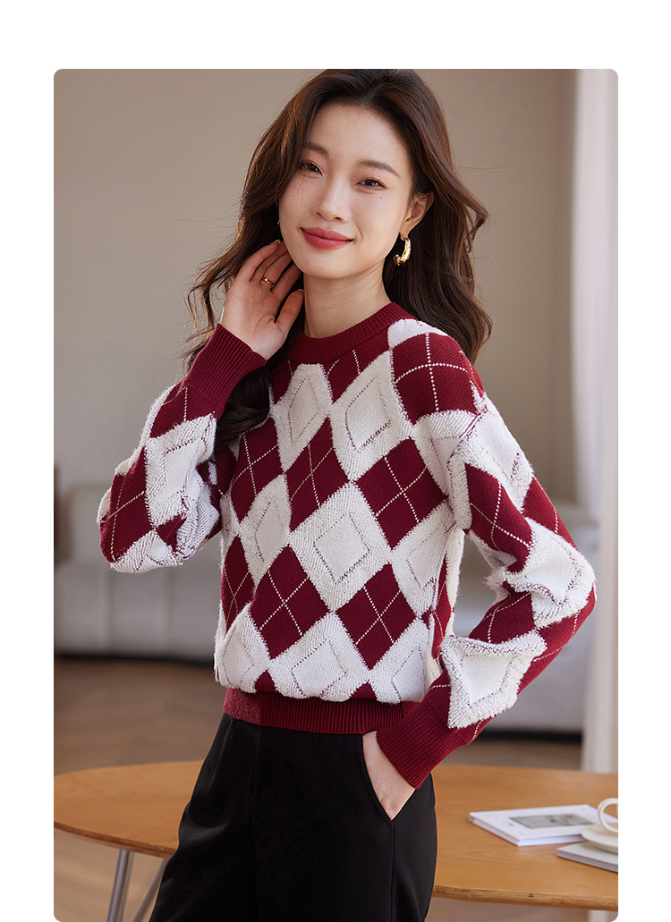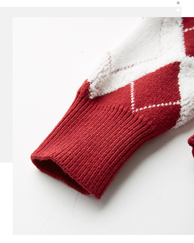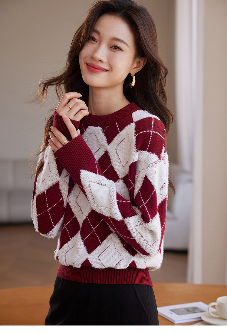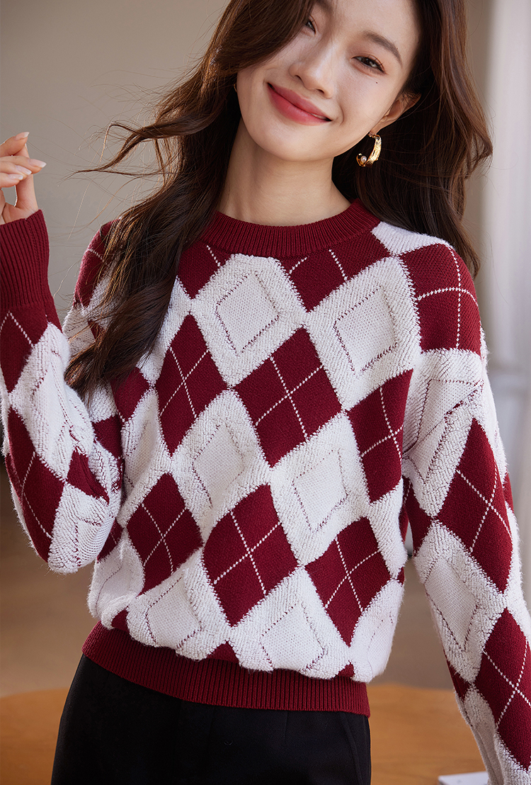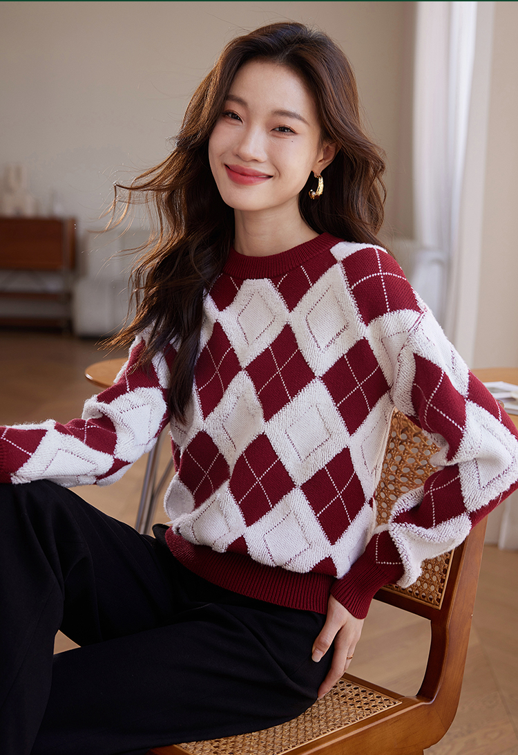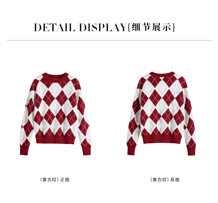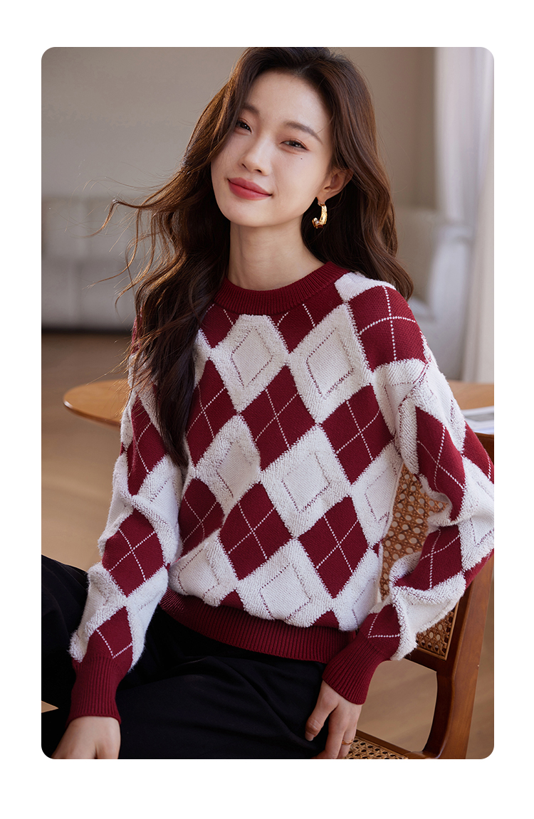 【专属特价】熙世界撞色菱格红色毛衣冬季慵懒风套头圆领针织衫