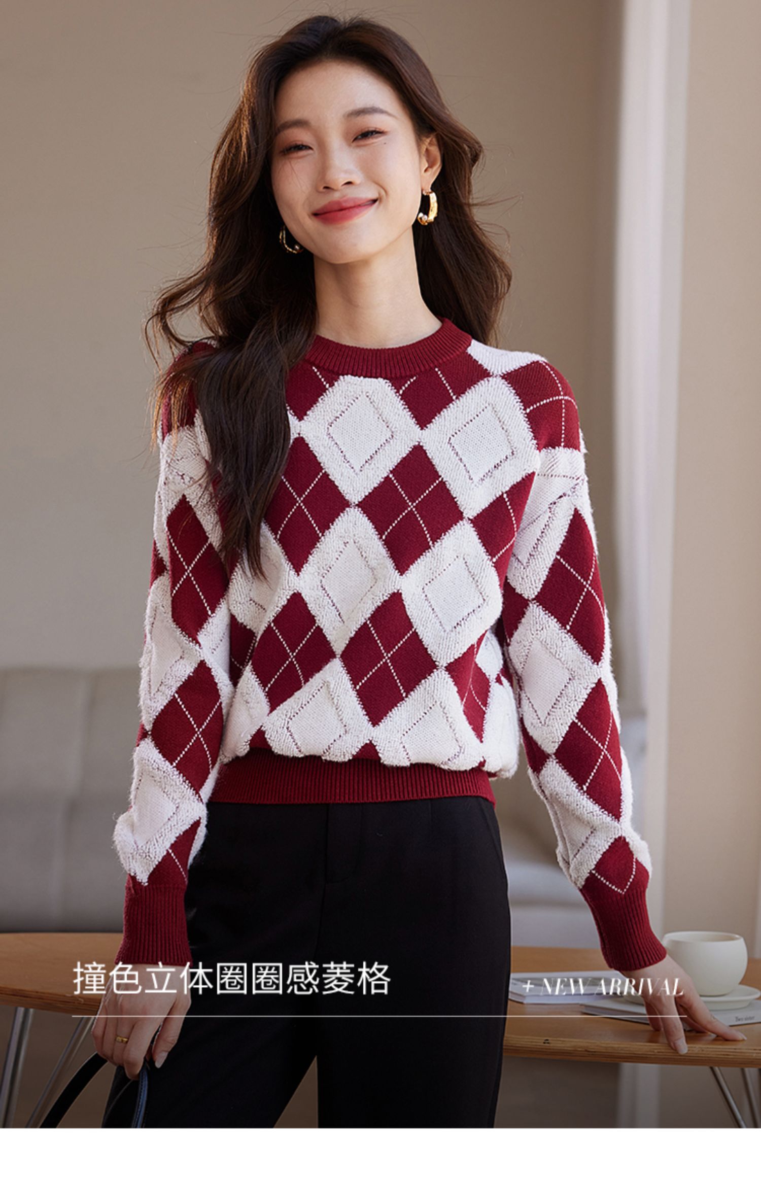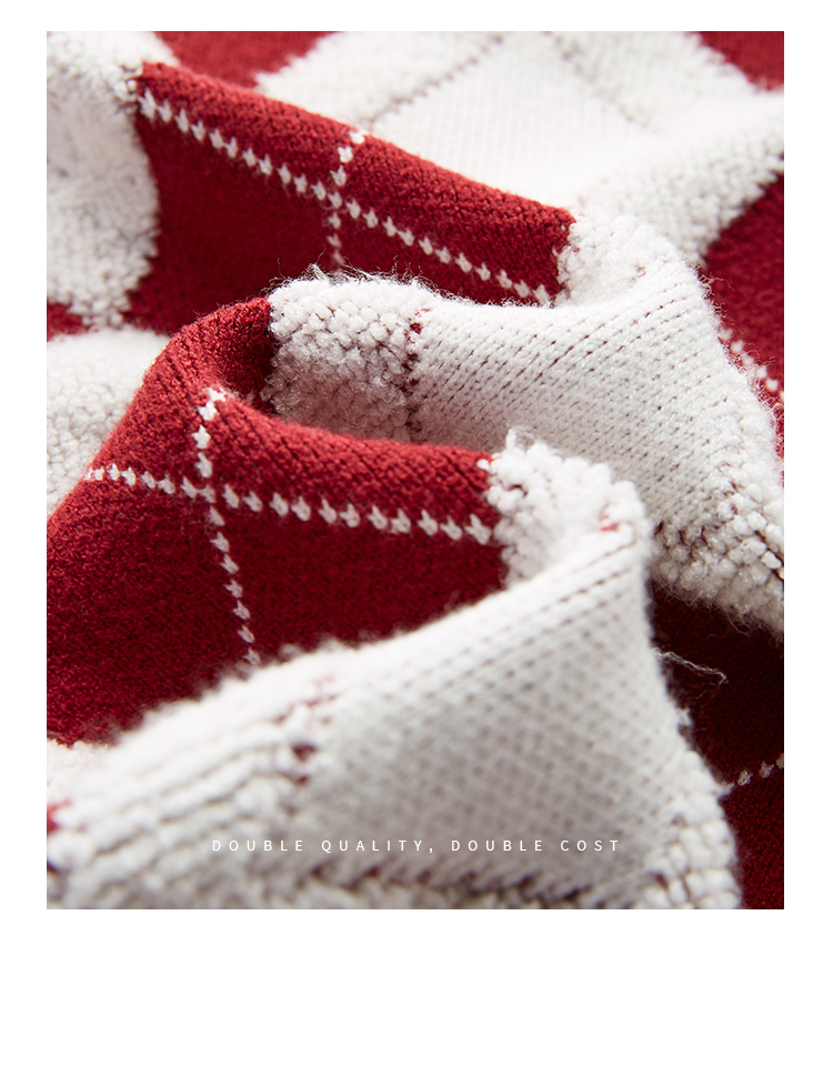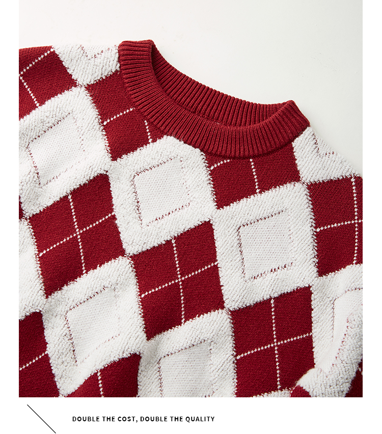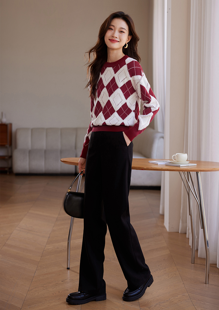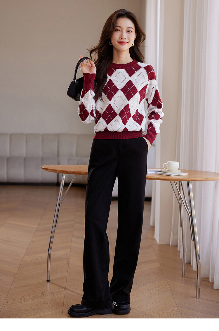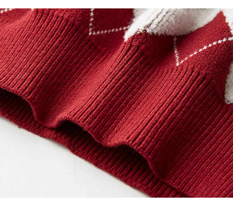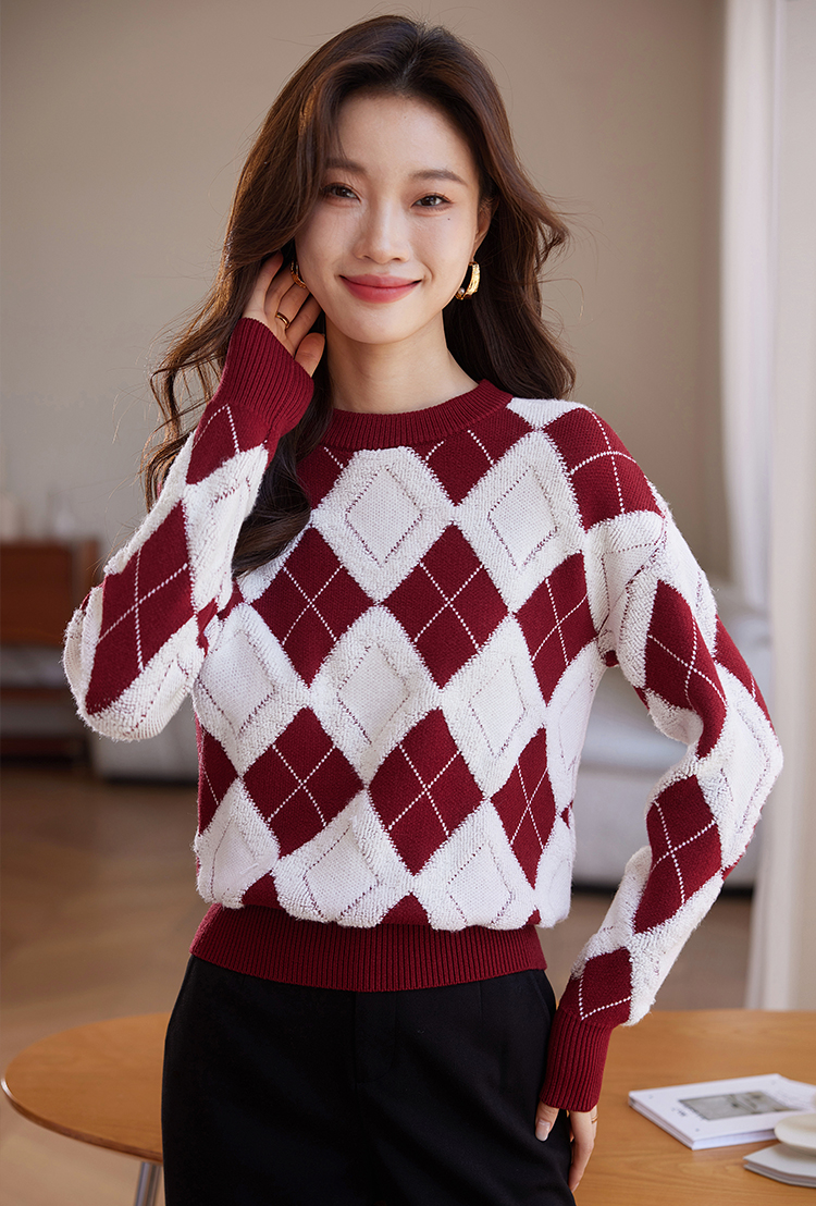 【专属特价】熙世界撞色菱格红色毛衣冬季慵懒风套头圆领针织衫