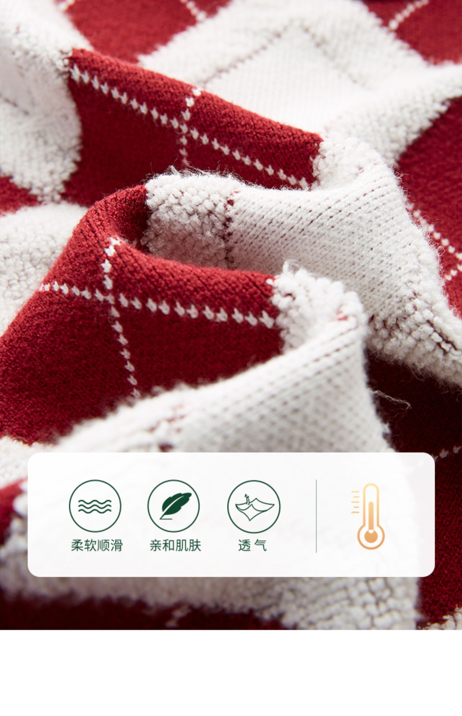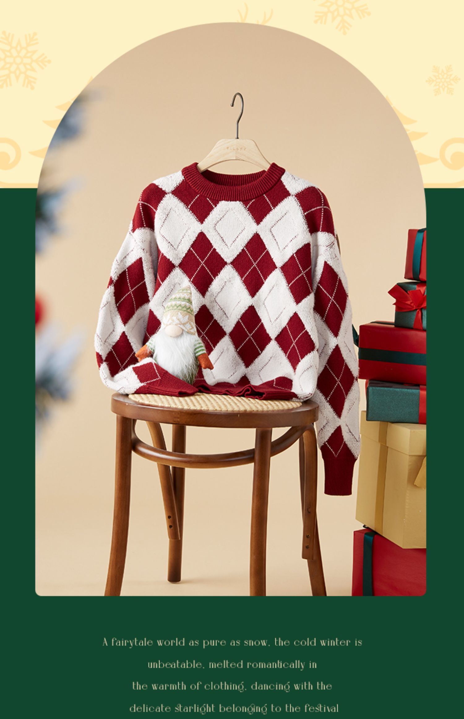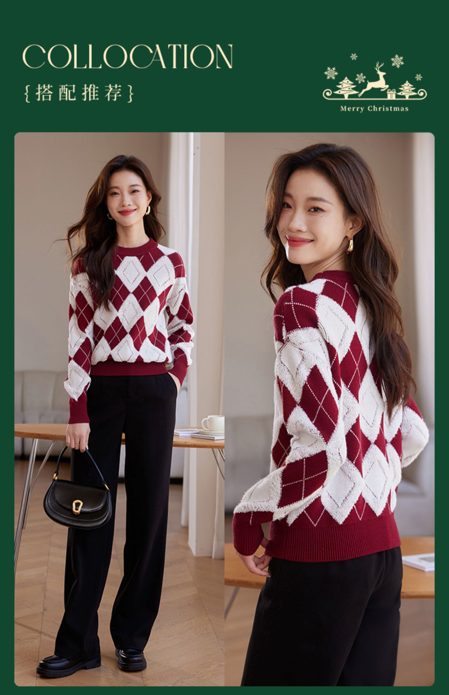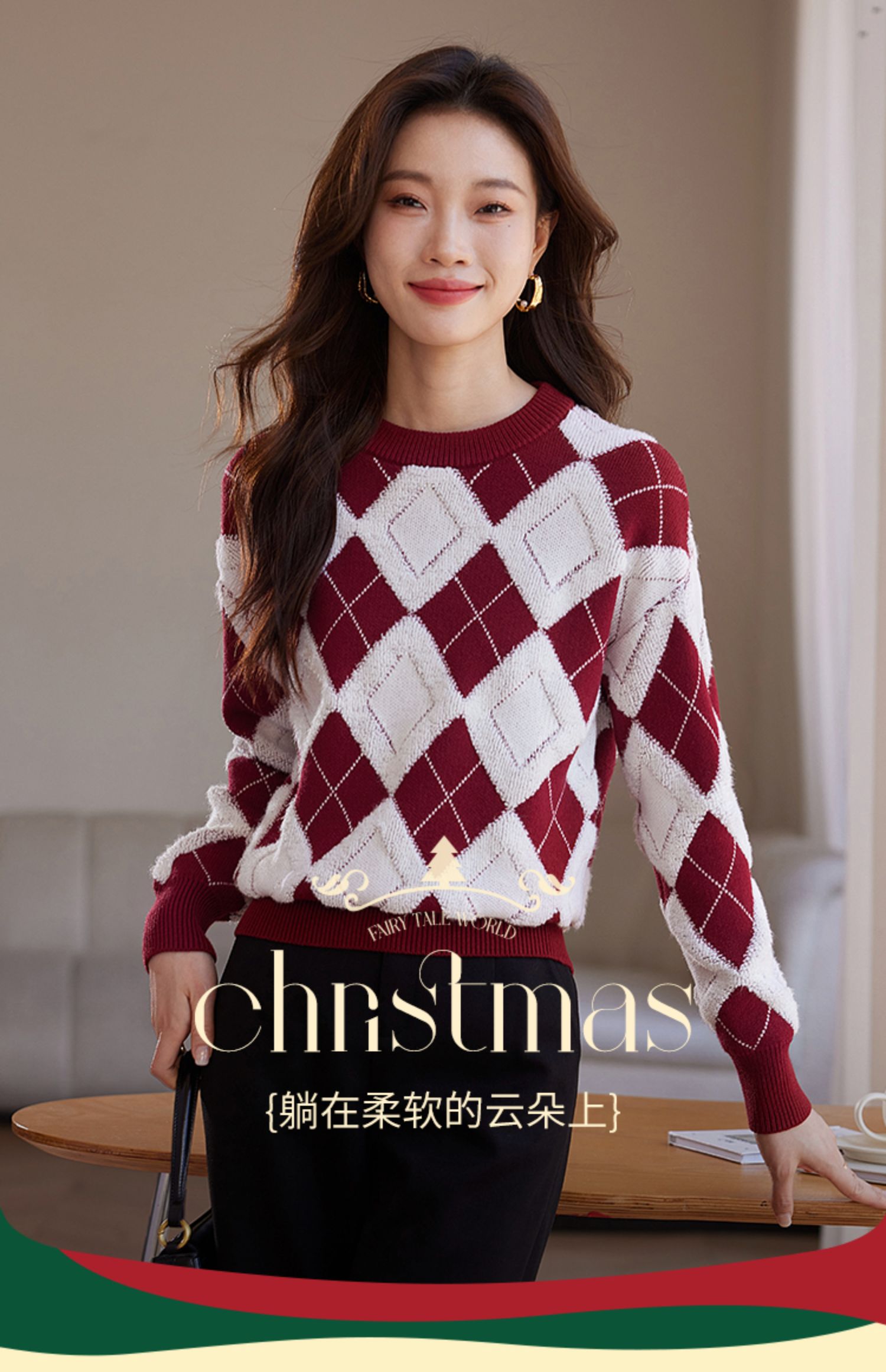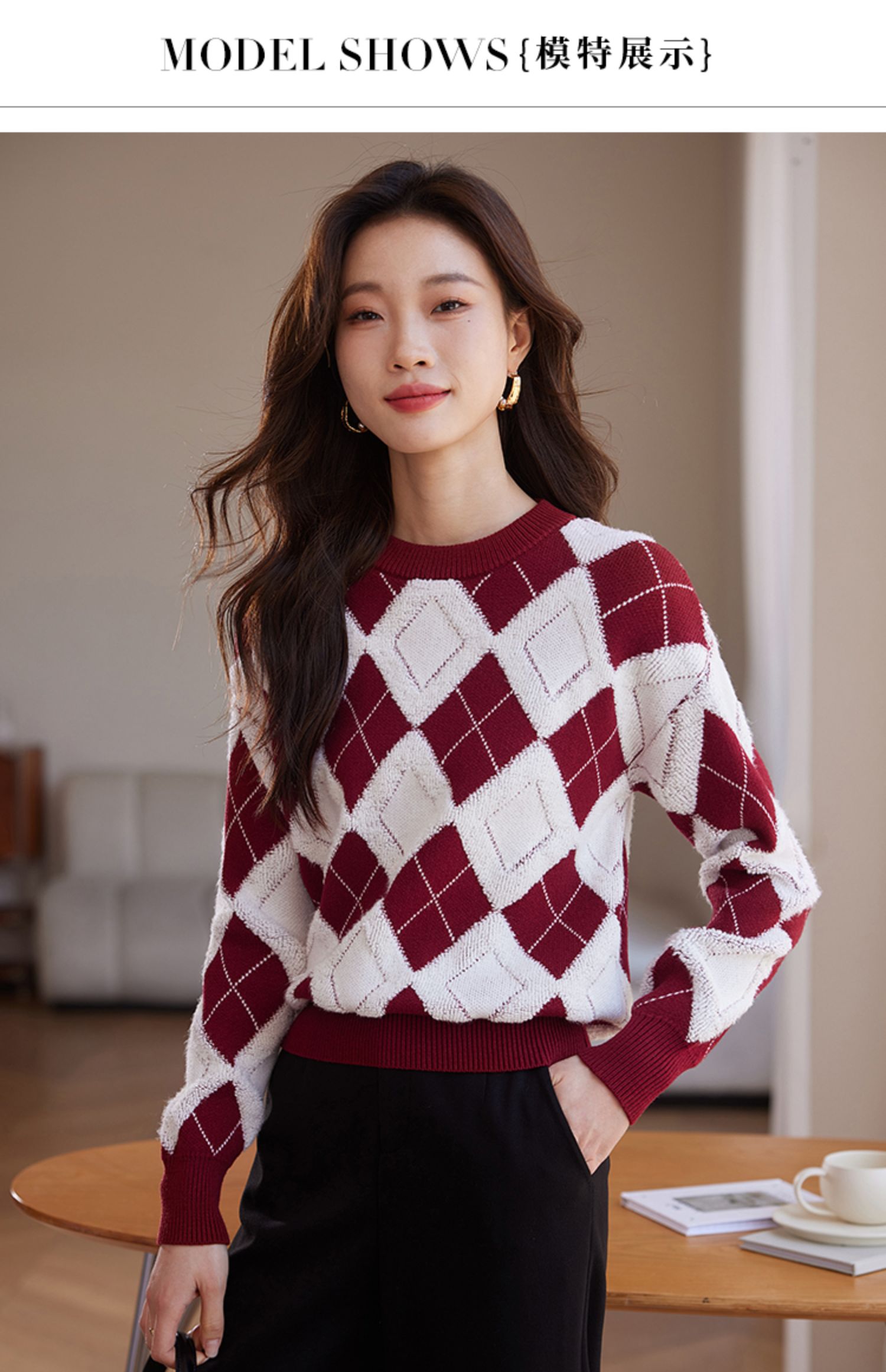【专属特价】熙世界撞色菱格红色毛衣冬季慵懒风套头圆领针织衫