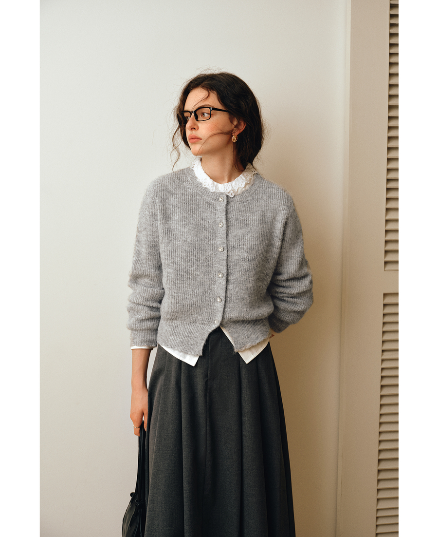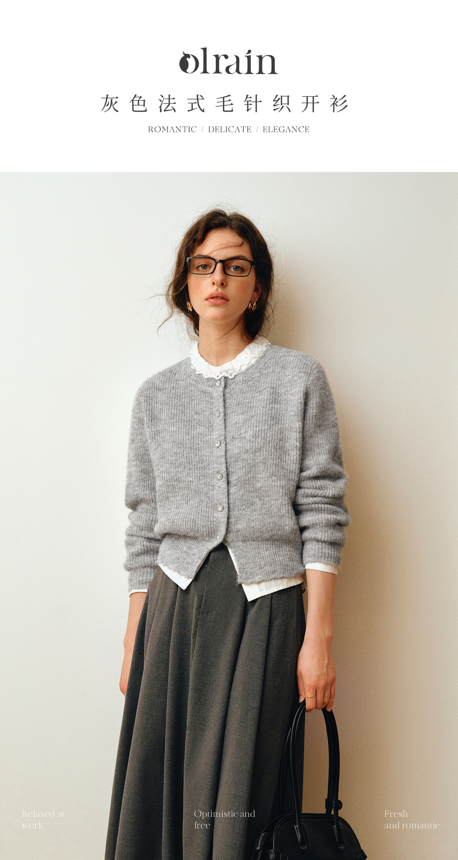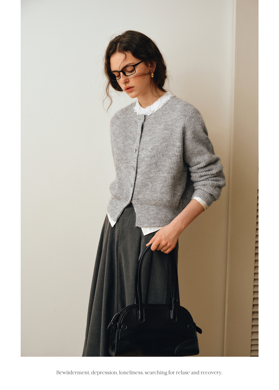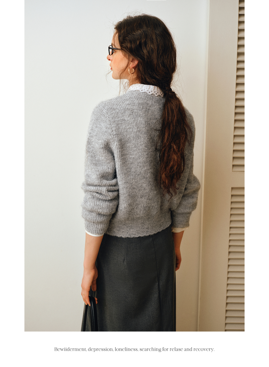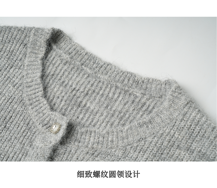 OLrain欧芮儿2025新款女秋季灰色法式毛针织开衫圆领羊毛长袖上衣