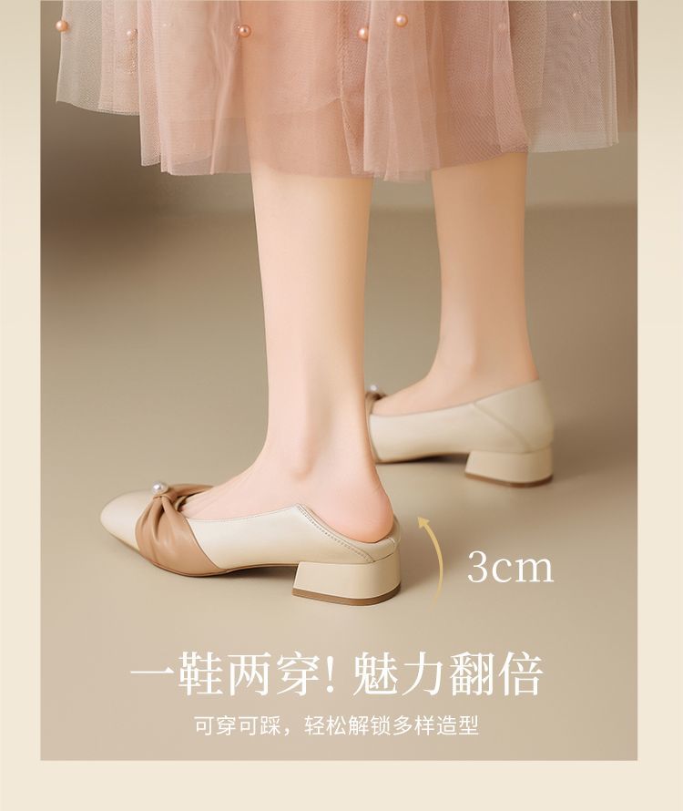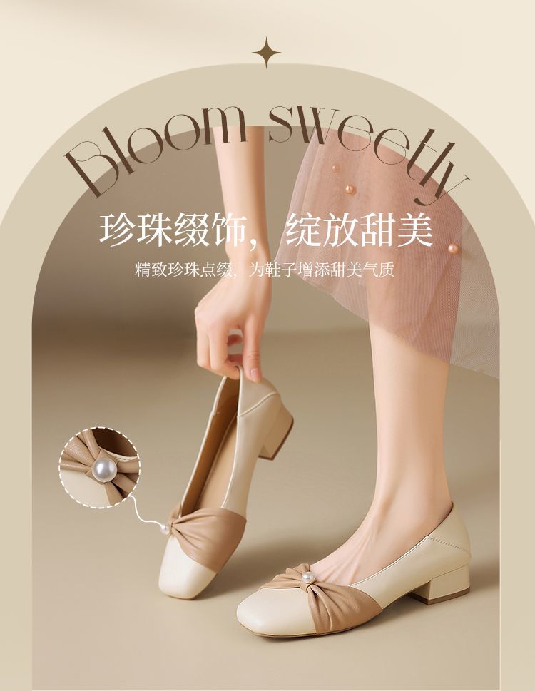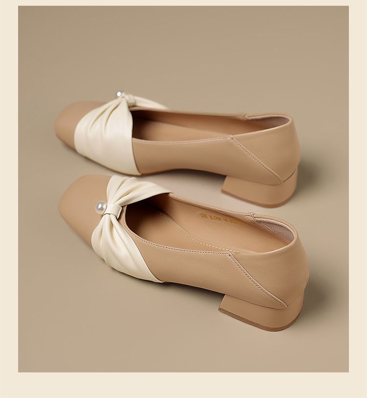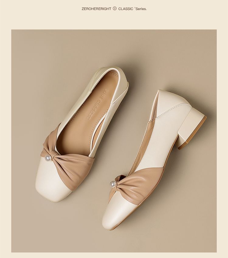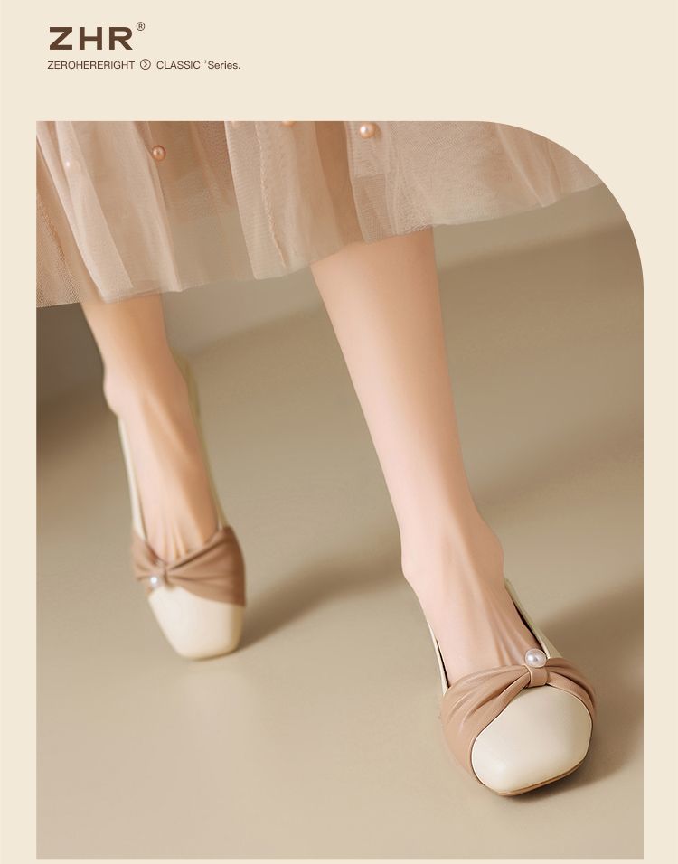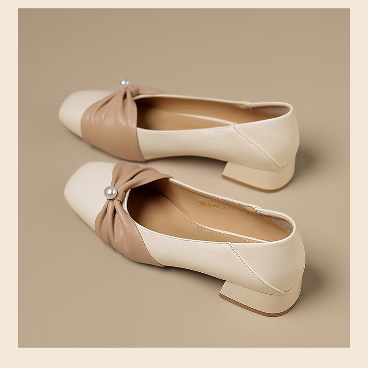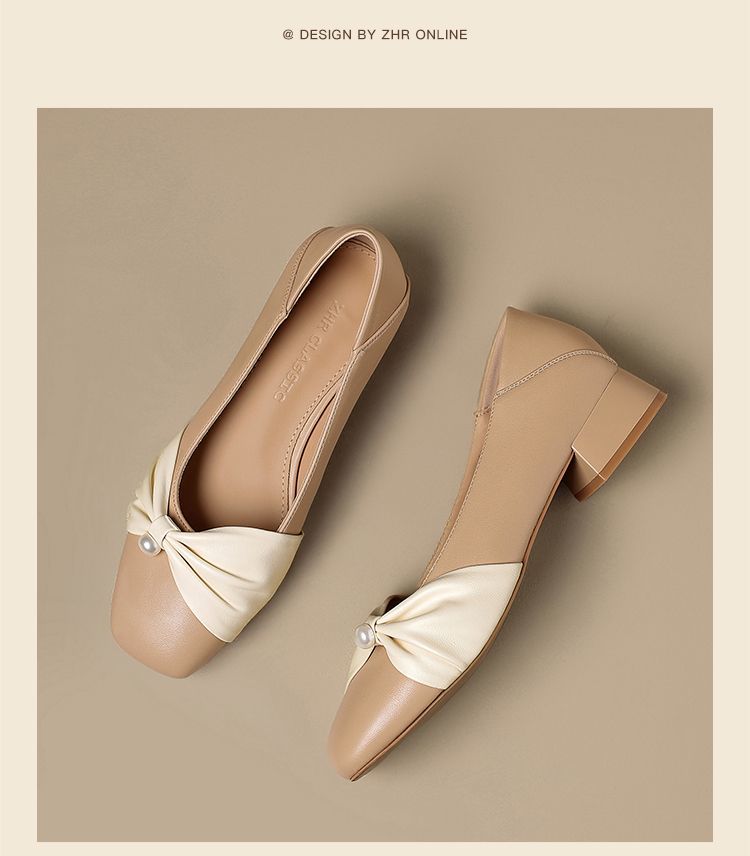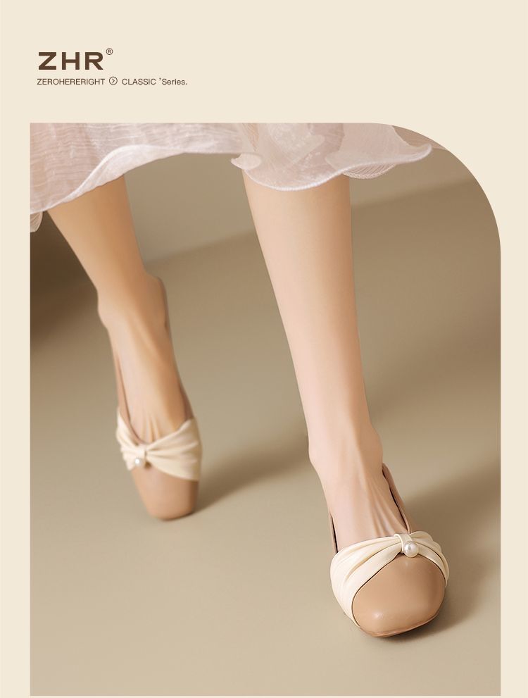 ZHR粗跟浅口玛丽珍鞋女蝴蝶结珍珠奶奶鞋轻便两穿女鞋法式小皮鞋