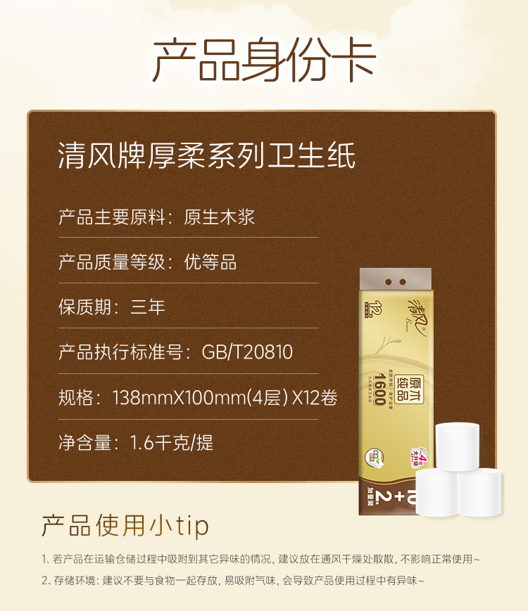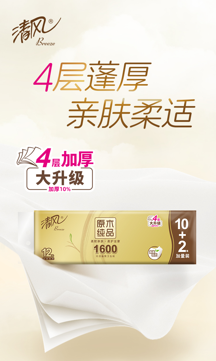 【官方自营】清风原木金装4层134克12卷无芯卷卫生纸