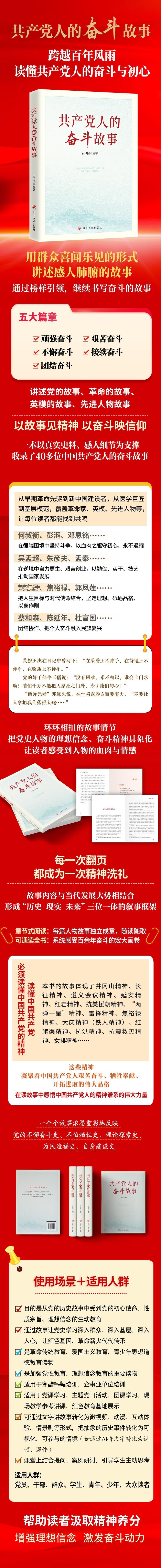 1.以奋斗为主线,讲述共产党人的信仰与担当 本书紧扣“奋斗”这一中国共产党人的精神底色,精选何叔衡、蔡和森、彭湃、焦裕禄、江竹筠等四十余位典型人物,通过真实故事展现他们在革命、建设、改革和新时代不同历史阶段勇担使命、不畏艰险、无私奉献的精神风貌。这些人物的奋斗历程,构成了一部浓缩的中国共产党奋斗史,让读者从鲜活事迹中体悟共产党人“初心不改、信仰如山”的精神力量。 2.赓续红色血脉 传承奋斗精神 全书以“顽强奋斗、艰苦奋斗、不懈奋斗、接续奋斗、团结奋斗”五大篇章为主线,系统展现从井冈山精神、长征精神、延安精神到红岩精神、“两弹一星”精神、抗洪精神、抗震救灾精神等伟大精神的历史传承。书中不仅还原了这些精神形成的历史背景与现实意义,更揭示了它们在新时代的延续与升华,展现共产党人信念坚定、勇于担当、为民奉献的精神特质。本书旨在引导党员干部在学习奋斗精神中汲取信仰力量,在传承红色基因中激发奋进动力,在新时代新征程上持续奋斗、勇毅前行。 3.故事鲜活、结构清晰、兼具思想性与实用性 全书既还原革命战争年代浴血拼搏的峥嵘岁月,也记录建设、改革时期攻坚克难的奋斗历程,更呈现新时代创新突破的精神传承,内容上融史实叙述与精神阐释于一体,通过情节塑造人物形象,借助具体事例彰显人物精神品质,诠释中国共产党人的伟大品格。本书通过讲好党的故事、革命的故事、英模的故事、先进人物故事等,展现他们大无畏精神和无私奉献精神,永葆共产党人的奋斗精神,旨在引导读者从榜样事迹中汲取奋进力量,激励新时代共产党人赓续红色血脉、践行初心使命,在强国建设、民族复兴的新征程上不断创造新的历史伟业,是加强党性教育、理想信念教育的重要读物,也可用于加强革命传统教育、爱国主义教育、青少年思想道德教育,是传承红色基因的生动教材。为庆祝中国共产党成立105周年献礼。