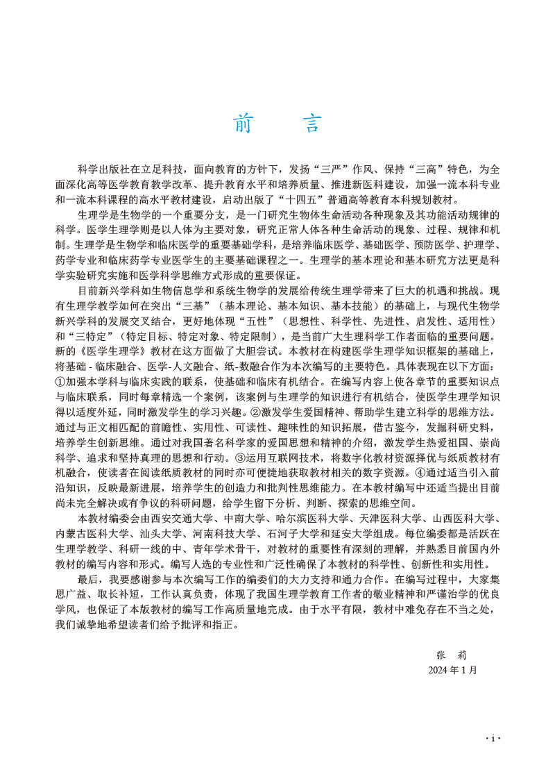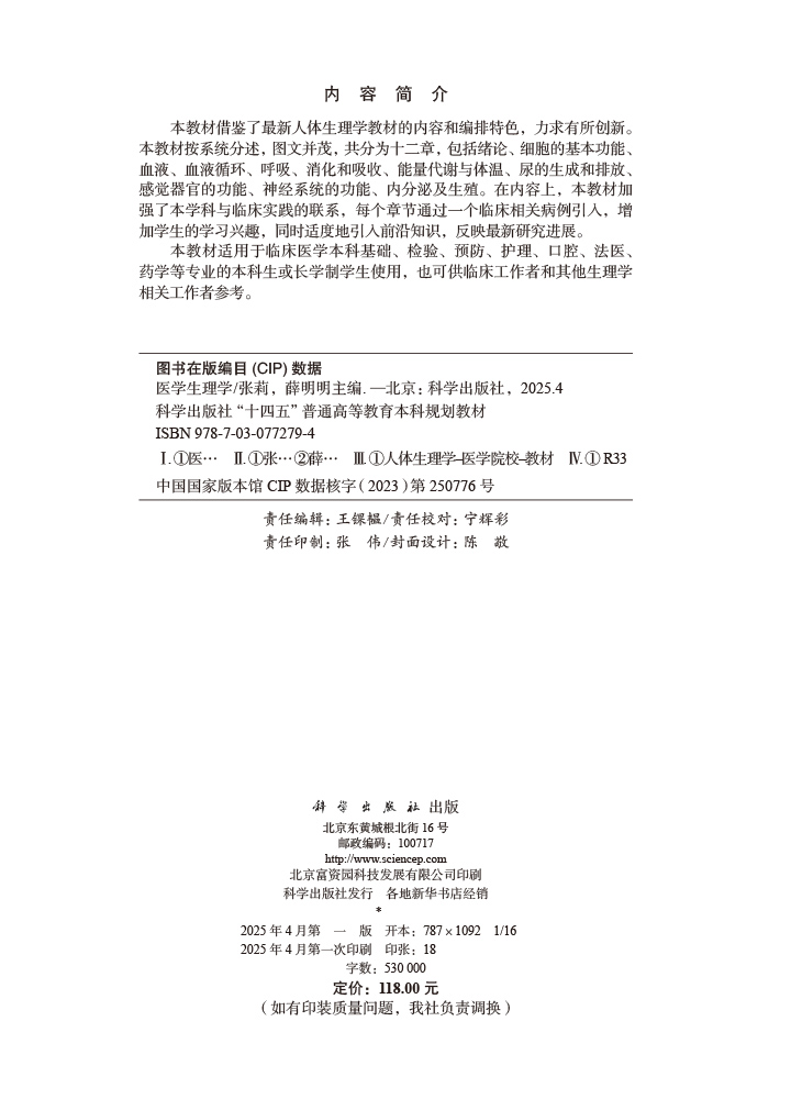 医学生理学十四五普通高等教育本科规划教材 张莉薛明明 适用于高等医药院校临床医学口腔预防法医基础医学药学临床药学等专业学生