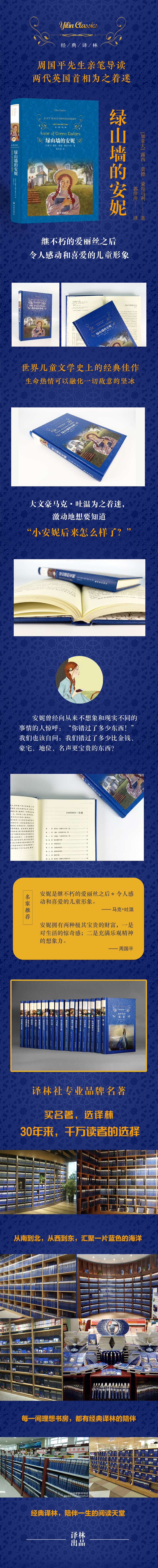 《绿山墙的安妮》是世界儿童文学史上的杰作,也是新课程标准推荐书目,两代英国首相为之着迷。“经典译林”版《绿山墙的安妮》由周国平先生亲笔导读。《绿山墙的安妮》是加拿大女作家蒙哥马利创作的“安妮系列”小说中相当成功的一部。小说文字清新流畅,语言生动幽默,处处洋溢着迎合儿童心理的生活情趣。作者善于用细腻的笔触来描写人物内心深处的情感变化,用幽默的语言临摹童趣盎然的生活,巧妙、缜密的构思使得情节一波三折,引人人胜。马修和玛丽拉兄妹对安妮发自肺腑的疼爱和无私的付出,感人至深,而安妮纯真善良、热爱生活、坚强乐观的形象更让人掩卷难忘。一部畅销不衰的经典佳作就这样深深地扎根在每一个读者的心中。该书首版出版后,读者信件如雪片般飞到爱德华王子岛的女作家家中,希望知道“小安妮后来怎么样了?”有趣的是,大文豪马克?吐温的文字也挤在成堆的信件中。他激动快乐地写道:“安妮是继不朽的爱丽丝之后*令人感动和喜爱的儿童形象。”