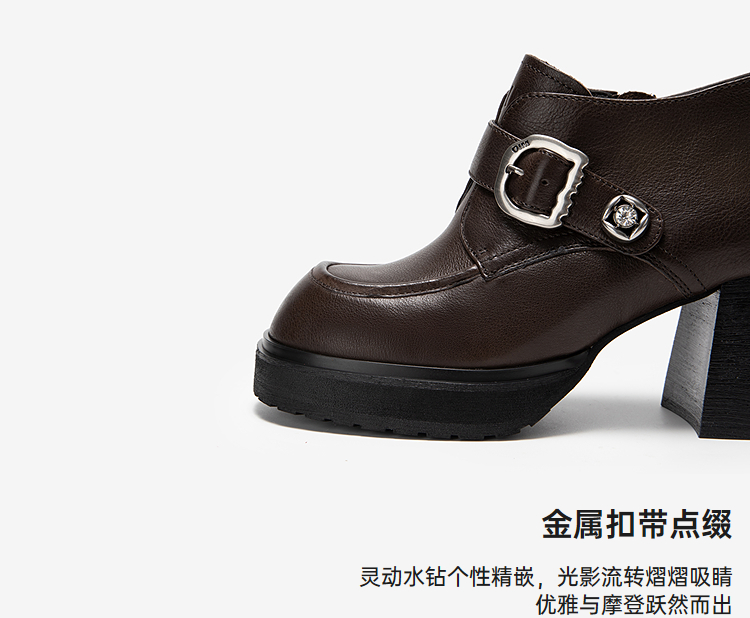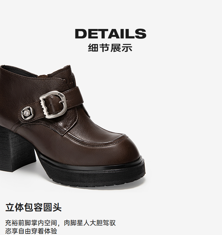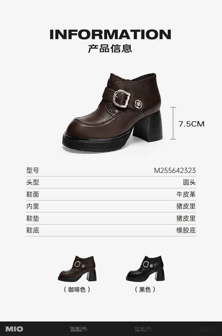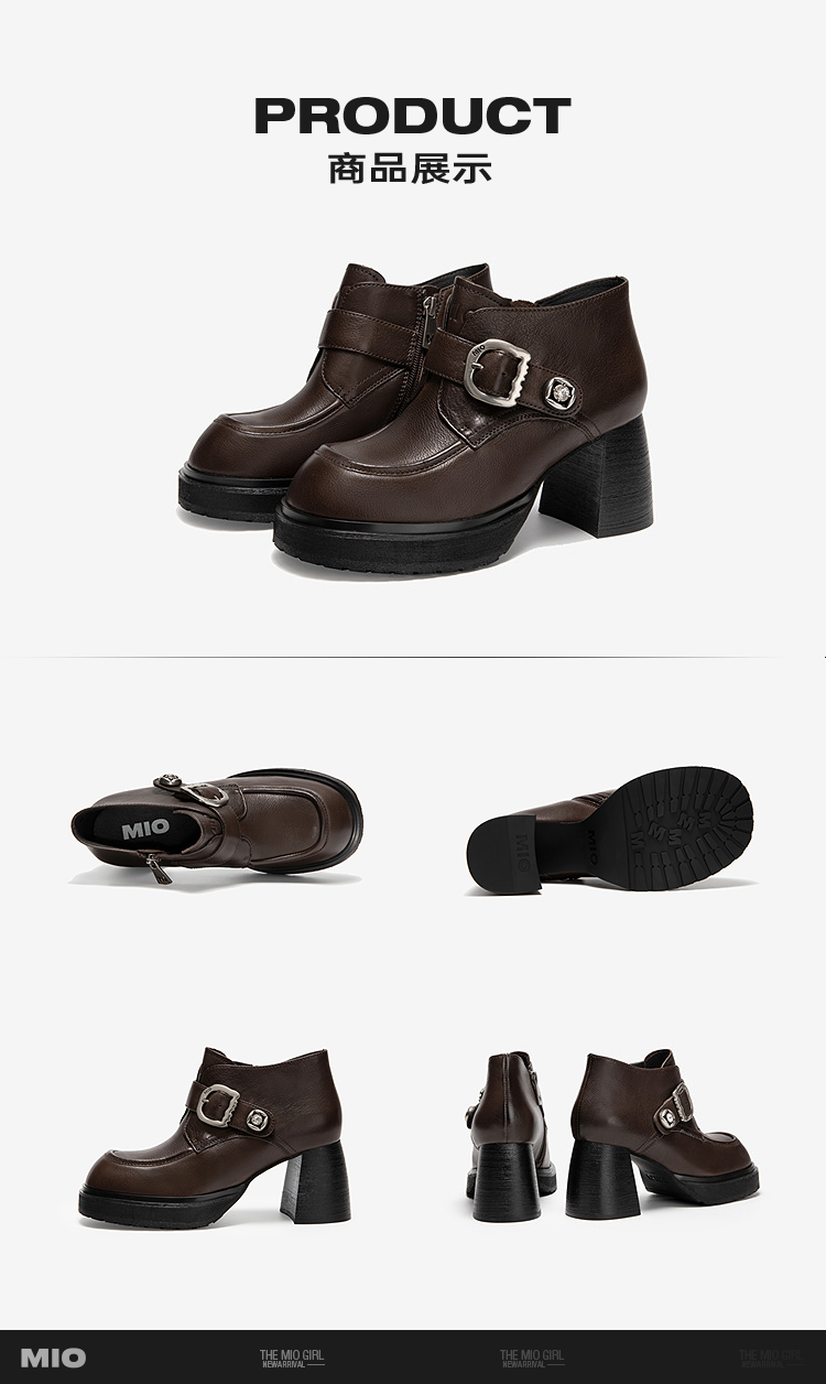 MIO米奥时装靴粗跟圆头饰扣马丁靴复古增高短筒靴子M255642323