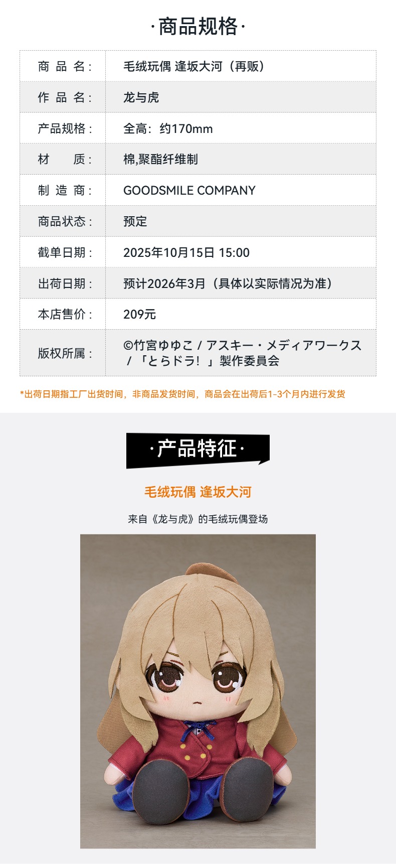【GSC补款】毛绒玩偶 逢坂大河 龙与虎