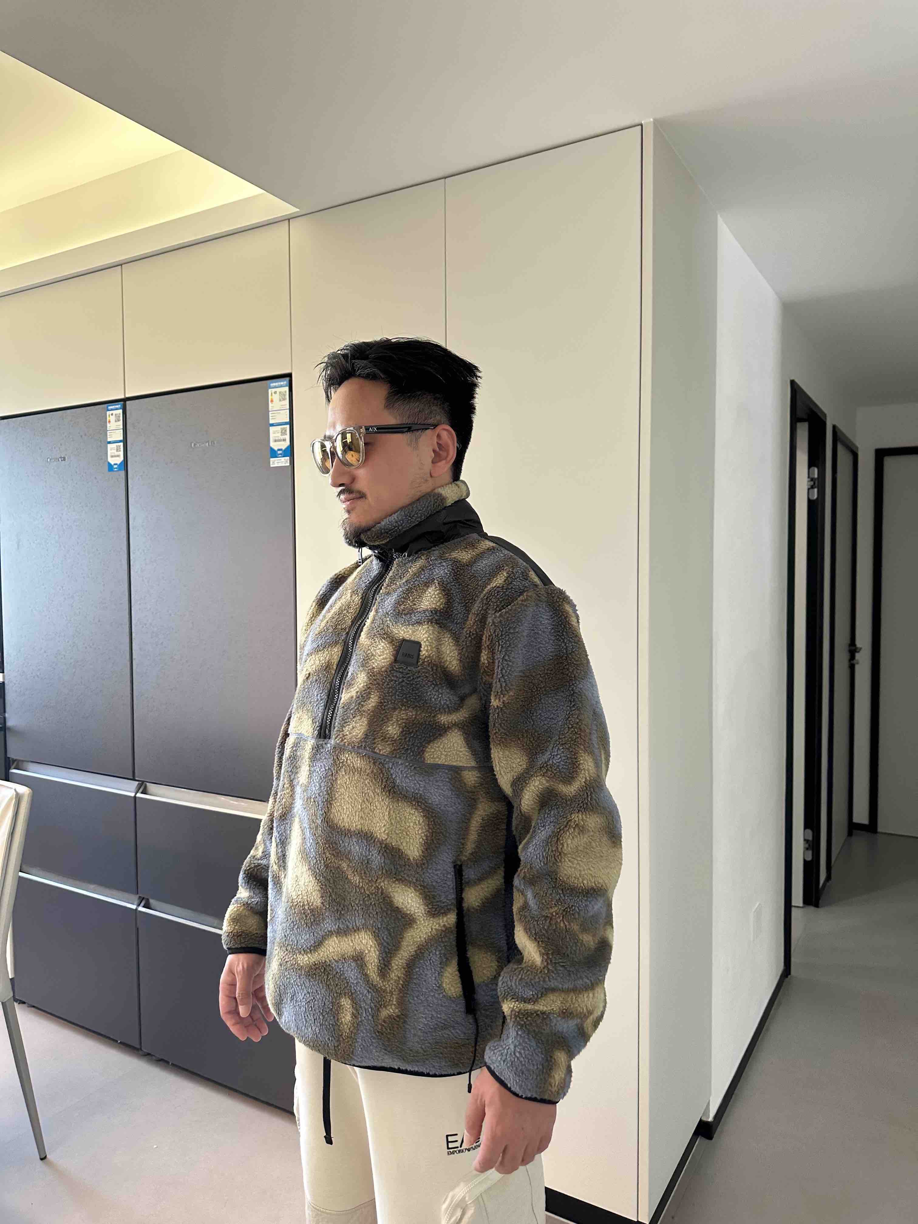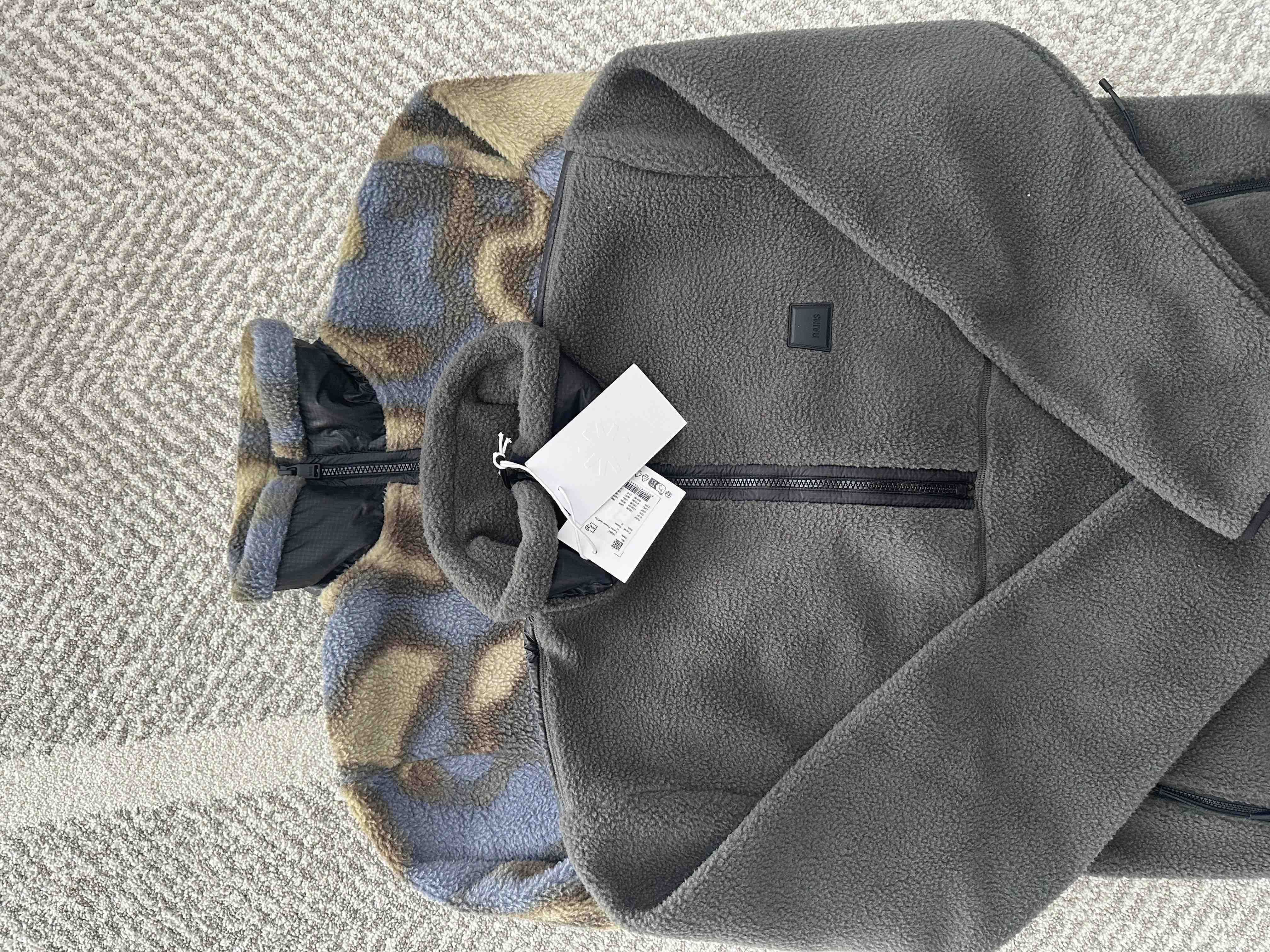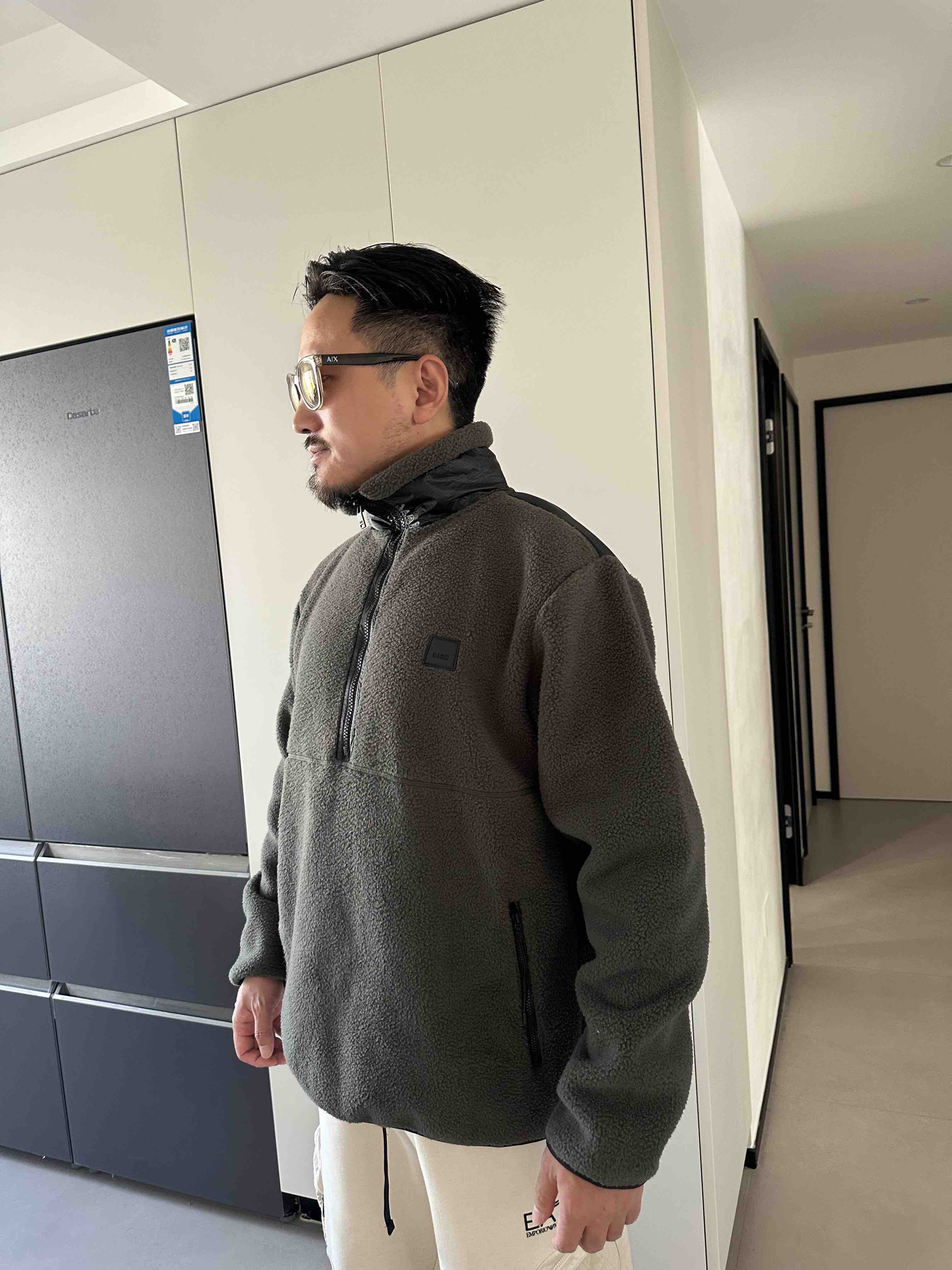 厚抓绒外套。双层面料,内里平绒,外面粗摇粒绒。柔软厚实且保暖。各种细节,拼接包边,领子可收紧。