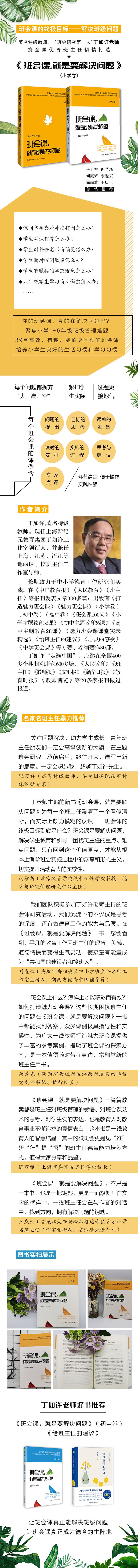 关注问题解决,助力学生成长。青年班主任朋友们一定会高擎创新的大旗,在主题班会研究上承前启后,继往开来,谱写出新的篇章。一定会超越我,超越丁如许先生。 张万祥(德育特级教师,享受国务院政府特殊津贴专家)班会课的终极目标到底是什么?班会课是要解决问题,解决学生教育和引导中困扰班主任的重点、难点问题。只有回到这个价值原点,才能从根本上消除班会实施过程中的浮夸和形式主义,切实提升活动育人的实效性。迟希新(北京教育学院校长研修学院教授,德育与班级管理研究中心主任)我们团队积极参加丁如许老师主持的班会课研究活动,我们沉淀下的不仅仅是思考的深度,还有做德育工作的能力与品质。在《班会课,就是要解决问题》一书,您会看到,平凡的教育工作因班主任的理智、美感、道德情操而变得生气灵动,使孩童有能量成为“共和国的建设者和接班人”。 刘霞辉 (岳阳市岳阳楼区中小学班主任名师工作室主持人,湖南省优秀中队辅导员)班会课上什么?怎样上才能精彩而有效?如何打造魅力班会课?这些长期困扰班主任的问题在《班会课,就是要解决问题》一书中都能找到答案。众多课例极具指导性和实操性,为广大一线教师打造魅力班会课提供了丰富的参考案例,指明了班会课的探索方向,是一本值得随时带在身边、常翻常新的班主任用书。余爱东(陕西省西咸新区沣西新城第四学校党支部书记、执行校长)《班会课,就是要解决问题》一篇篇教案都是班主任对班级管理的感悟、对班会课艺术的思考、对学生爱的表达,也是教育人对教育事业不懈追求的真情表白!这本书是一线教育人的智慧结晶,其中的微班会更是见“难”研“行”提“悟”的班主任德育能力培养方式,值得大家分享和品鉴。 陈丽雅(上海市嘉定区苏民学校校长)《班会课,就是要解决问题》,不只是一本书,也是一把钥匙,更是一面旗帜!在文字的徜徉中,一线班主任会在与作者的对话中,找到方向,拥有解决问题的钥匙。王庆云(黑龙江大兴安岭加格达奇区育才小学名班主任工作室领衔人,省师德先进个人)