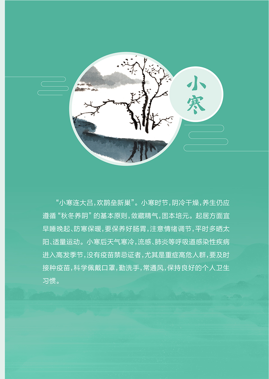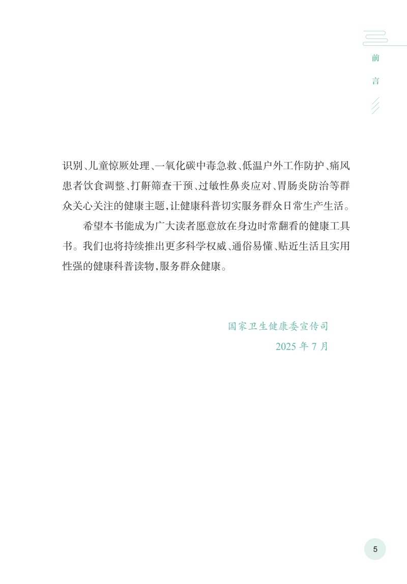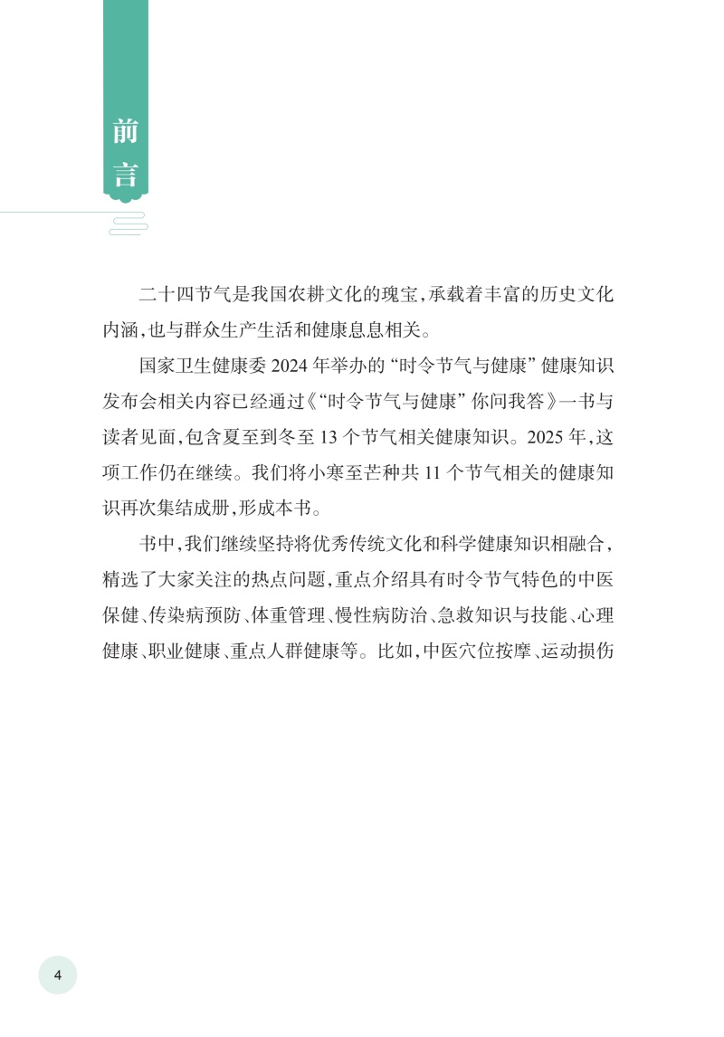 二十四节气是中华民族文化的重要组成部分,直接或间接地影响了人们的生活,与大家的健康息息相关。全书收录国家卫生健康委2025年召开的“时令节气与健康”系列主题发布会内容,以2025年**个节气小寒为起点,以二十四节气为脉络,以节气作为章节分类依据,介绍与小寒、大寒、立春、雨水、惊蛰、春分、清明、谷雨、立夏、小满、芒种11个节气相关的饮食、作息、运动、心理、疾病防治等科普知识,共涵盖冬春夏三个季节约100个养生保健知识问答。