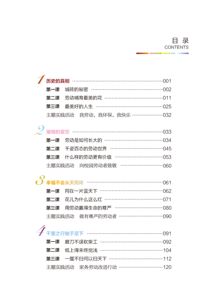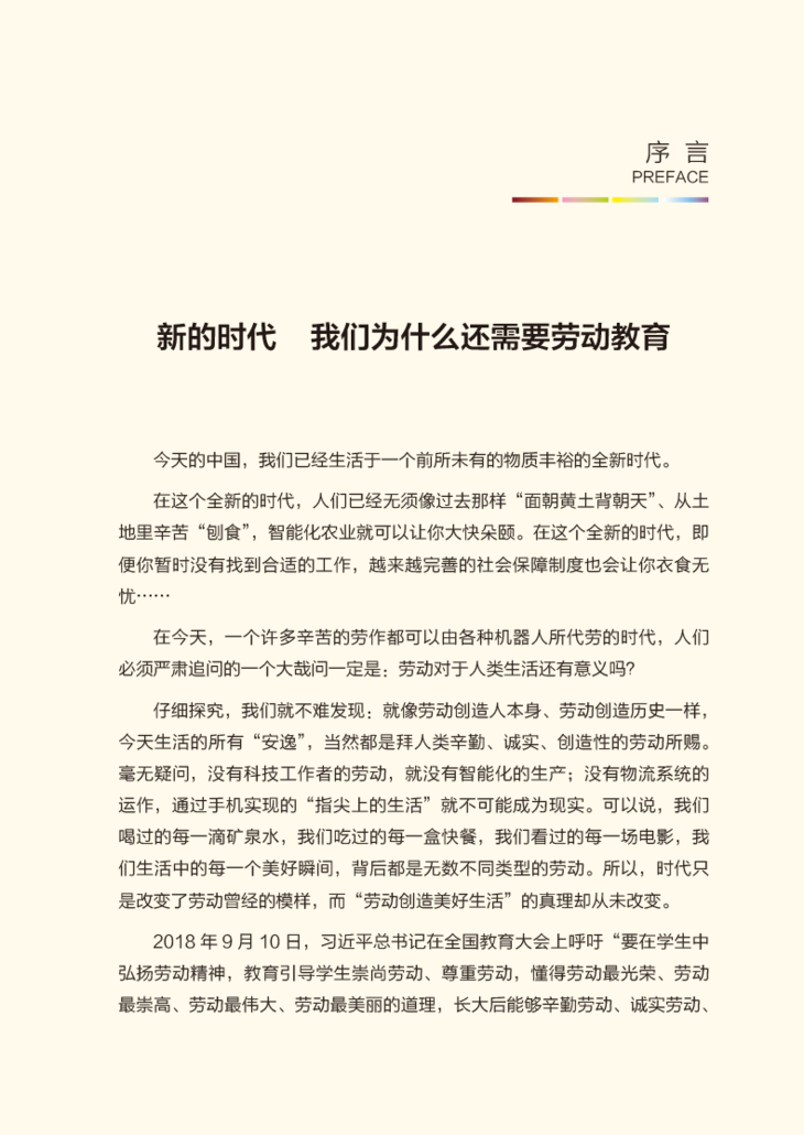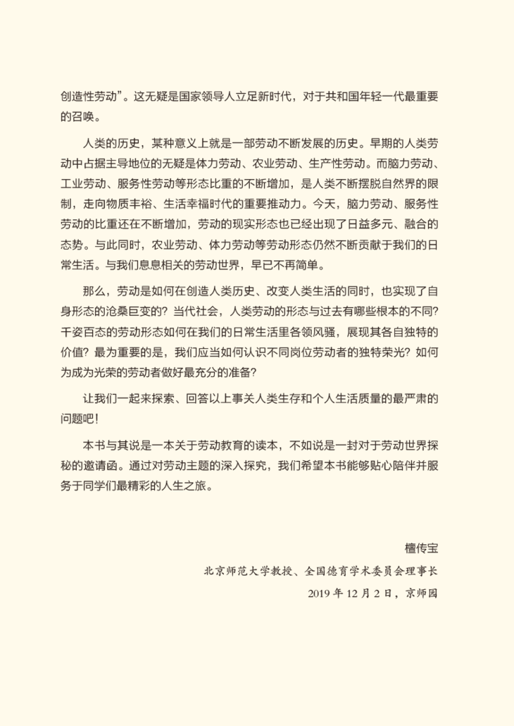 本书以劳动教育理论研究为根基,以四个主题(劳动的价值、劳动的形态、劳动的主体、劳动的准备)来组织相关内容,以与劳动有关的故事、案例、格言等为感性载体,图文并茂,引导学生能通过阅读展开深层次思考,从内心深处感悟、认同劳动的价值。通过阅读本书,希望提高青少年对劳动实践的认识水平,能够正确认识劳动形态及其变化趋势等知识点,能正确评价不同形态的劳动;培育青少年热爱劳动的积极情感,树立尊重劳动、诚实劳动、积极劳动的观念;提高青少年劳动的综合素养,鼓励青少年创造性思维,促进青少年在日常生活实践中养成良好的劳动习惯。