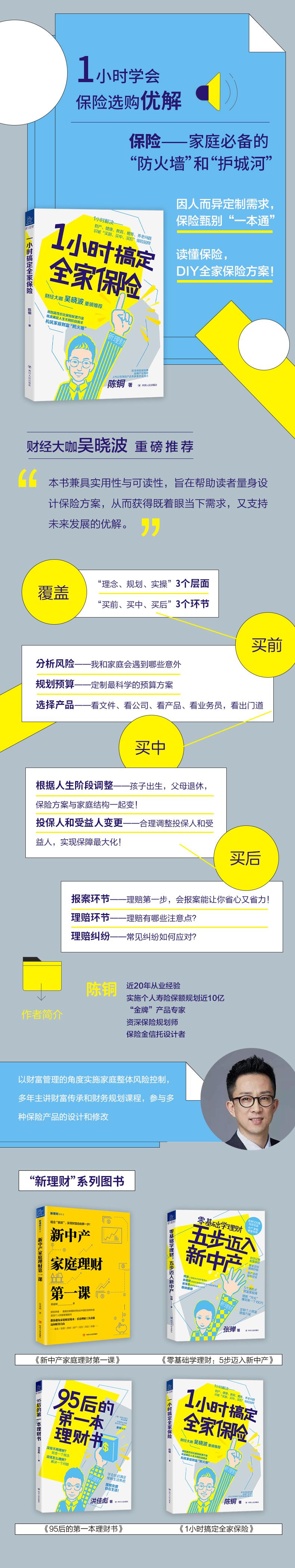 第一:保险,已成为万千家庭推荐的“防火墙”和“护城河”。 从新冠疫情到行业危机,从朋友圈“轻松筹”的无奈到ICU病房的惊人价格,有效对冲各种风险的“商业保险”,已成为万千家庭推荐的“防火墙”和“护城河”,越来越受到消费者重视。 第二:1小时学会保险选购“很优解” 复杂烦琐的保险条文看不懂? 品类繁多的保险产品不知如何选? 家庭成员有哪些不同保险需求? ——消费者最关心保险产品的“价格和有效性”。制定方案往往比选择产品更为重要。 本书为保险小白读者量身打造:介绍“理念、规划、实操”3个环节,覆盖“买前、买中、买后” 3个阶段,设计出满足当下又支持未来发展的“保险很优解”。 第三:作者权威资深 实施个人寿险保额规划近10亿、“金牌”产品专家、资深保险规划师、保险金信托设计者:陈铜老师集20年经验和心血,向读者娓娓道来,内容通俗,一看便懂。