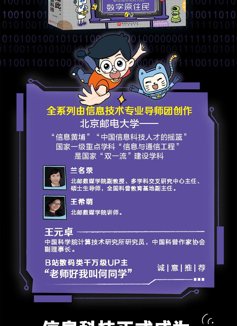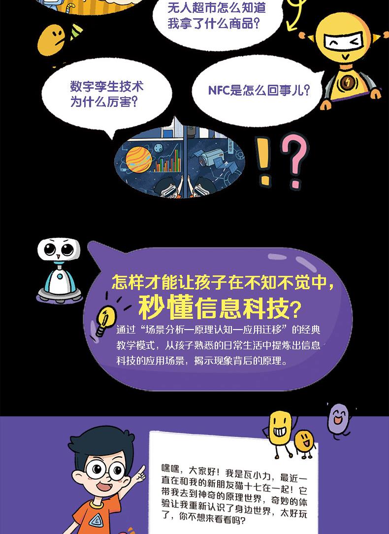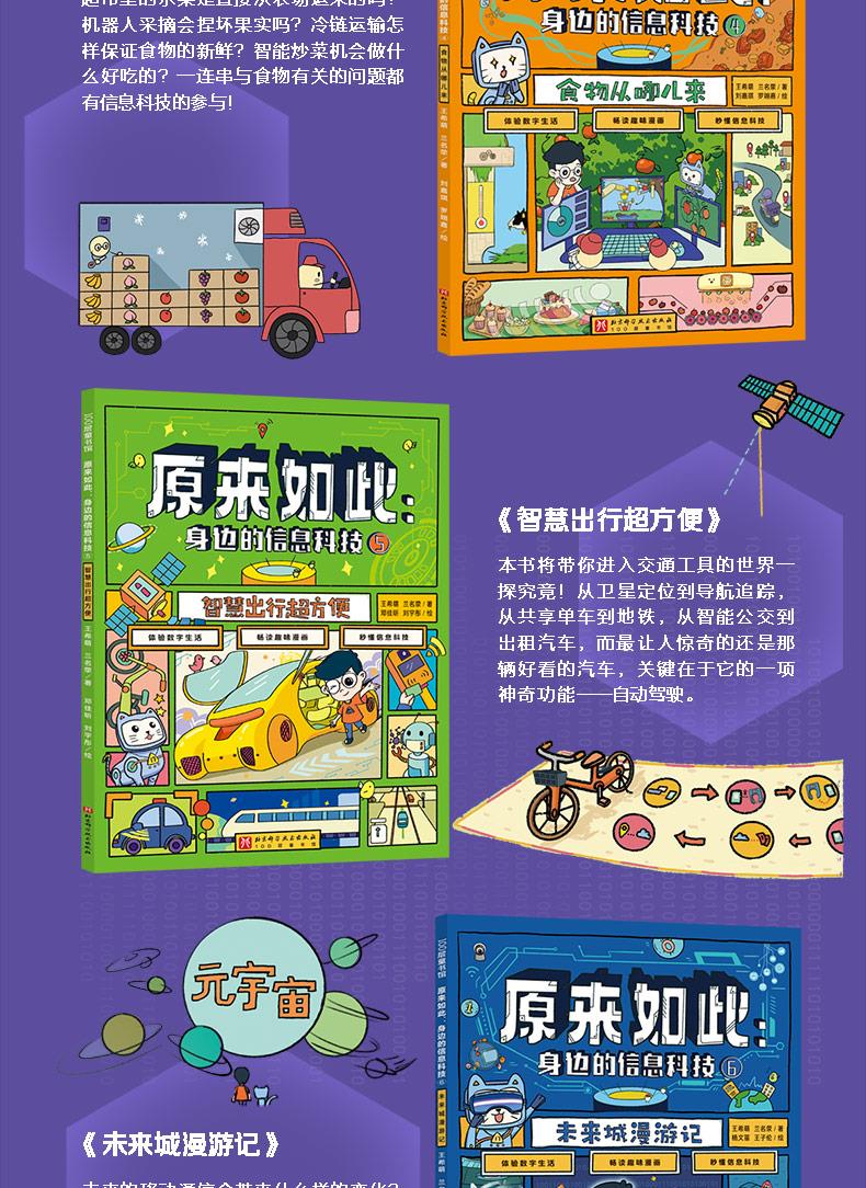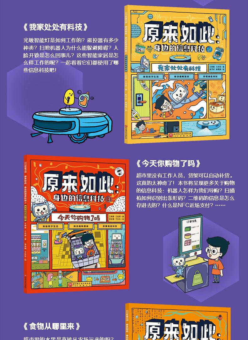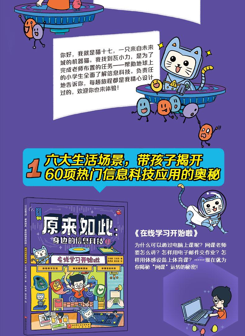 在数字化时代的今天,信息科技已成为一种生存技能,改变着我们的生活方式和思维方式。但我们真的了解它们吗?比如——汽车遥控器和电视遥控器的原理是一样的吗?为什么条形码不用红白相间的条纹?无人超市怎么知道我拿了什么商品?4G和5G有什么区别呢?探索信息科技的奥秘已成为我们的必修课,对孩子来说尤其如此。 “原来如此:身边的信息科技”系列就是一套写给小学生、以信息科技为核心的科普漫画,系列通过六个分册,涵盖学习、家居、购物、食物、交通和未来热门科技六大主题。小读者将跟随小学生瓦小力和来自未来城的猫十七,一起畅游软件宝库、与智能家电对话、体验购物方式的变化、追踪食品源头、享受便捷的出行服务……随着一段又一段旅程的结束,猫十七完成了一项又一项的升级任务,瓦小力则在令他大开眼界的探索之旅中,深入了解了信息科技为日常生活带来的巨大改变,更重要的是,提升了观察生活现象、探究事物本质的科学素养。 1.《在线学习......