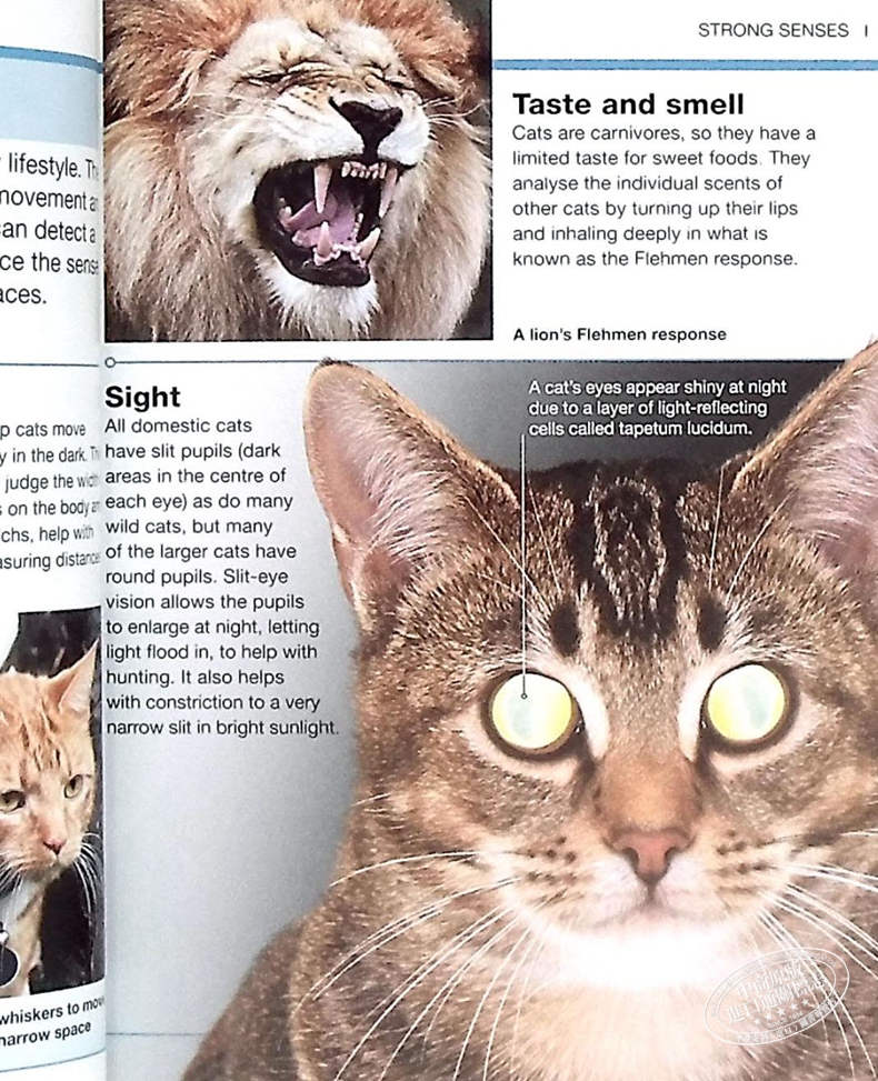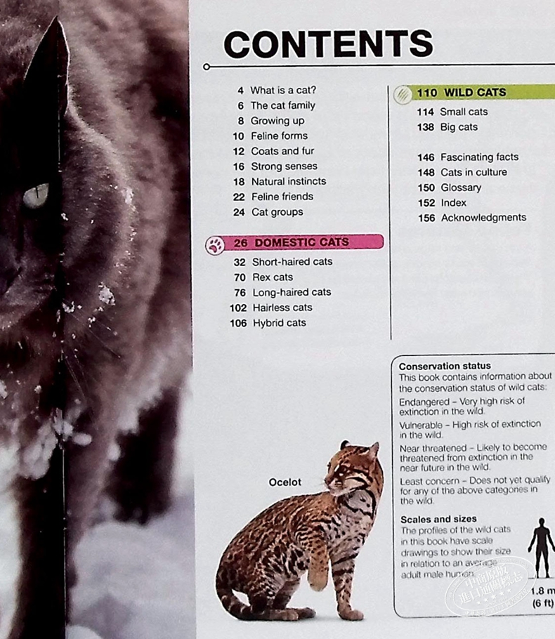 除了每个品种的照片外,还有每个猫科动物的事实和统计资料,包括它的大小、颜色和斑纹的来源以及不寻常的特征或行为。