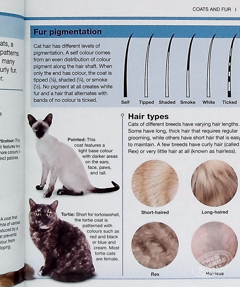 除了每个品种的照片外,还可以发现每只猫的事实和统计资料,包括其大小、品种的起源地、颜色和斑纹以及不寻常的特征或行为。你很快就能从暹罗猫中分辨出缅甸猫;从斯芬克斯和曼克斯中分辨出雷克斯;从英国短毛猫中分辨出美国短毛猫。你还会发现很多关于颜色和图案的知识。你知道虎皮猫和玳瑁猫不是品种,而是品种中的颜色吗?此外,还有几页介绍了猫的解剖学和行为学;书的末尾还有一些有趣的事实。